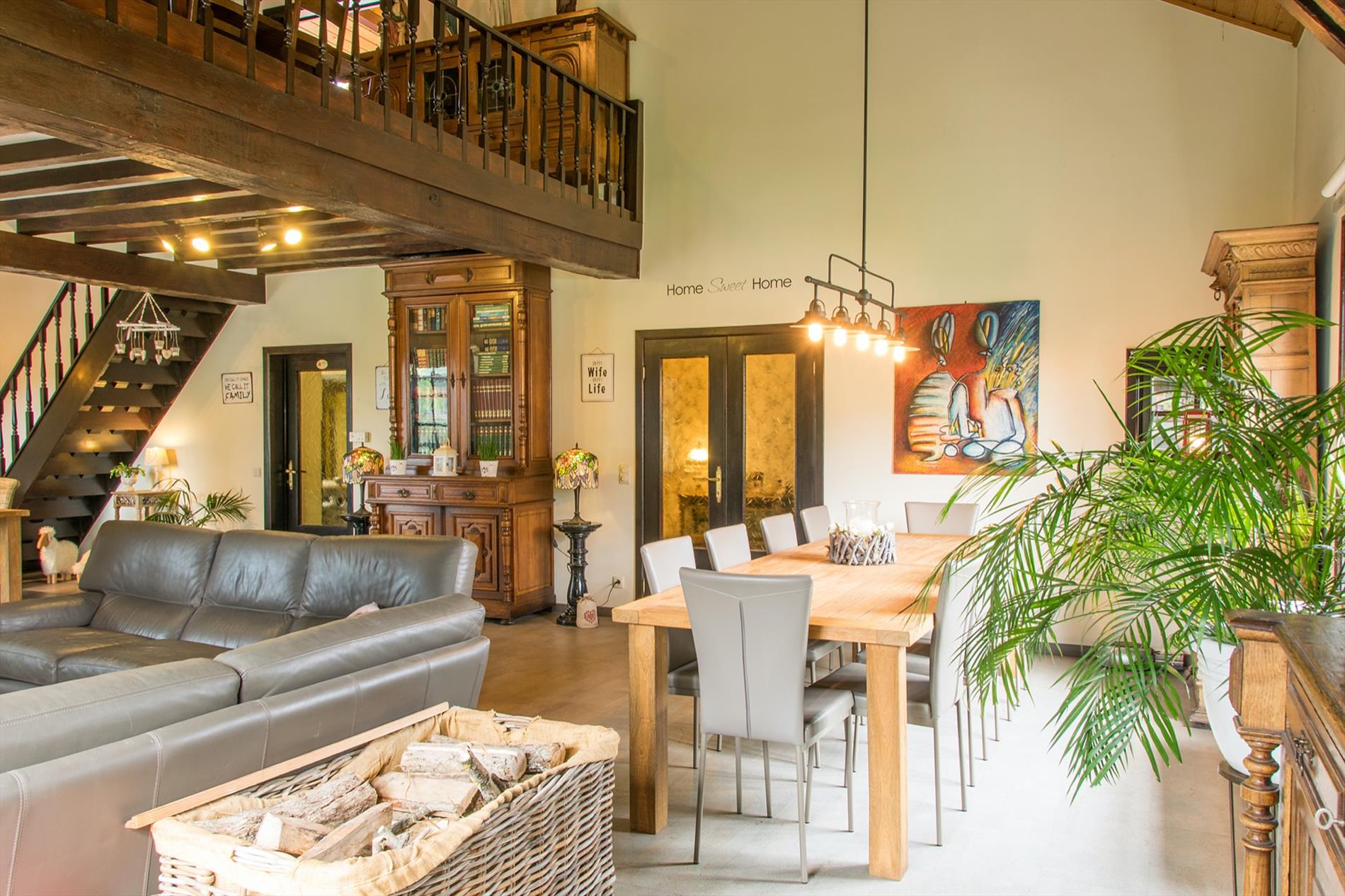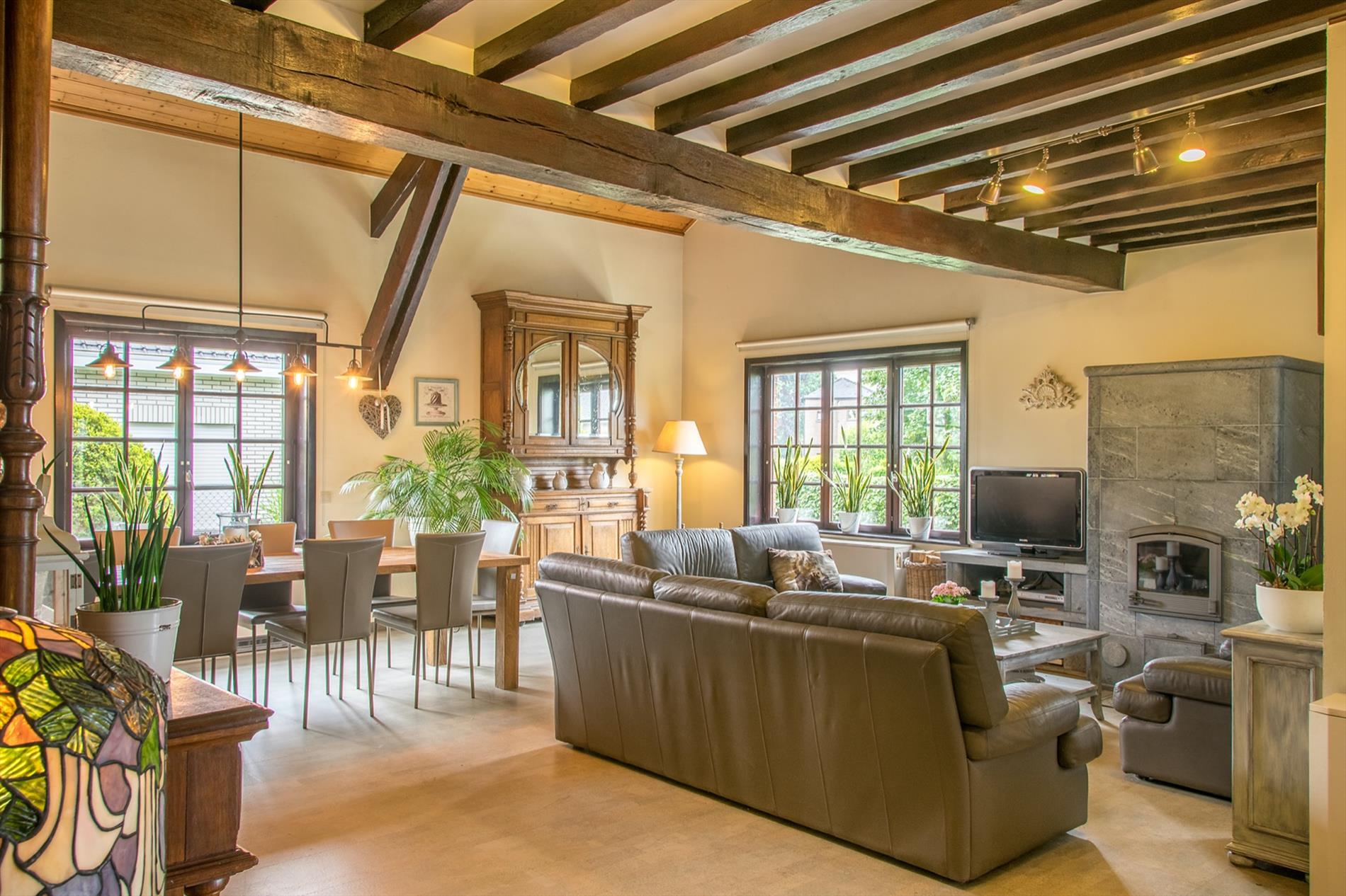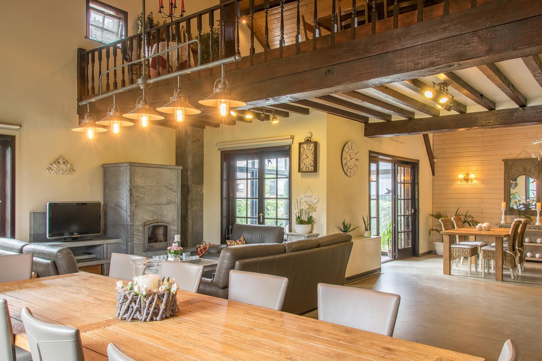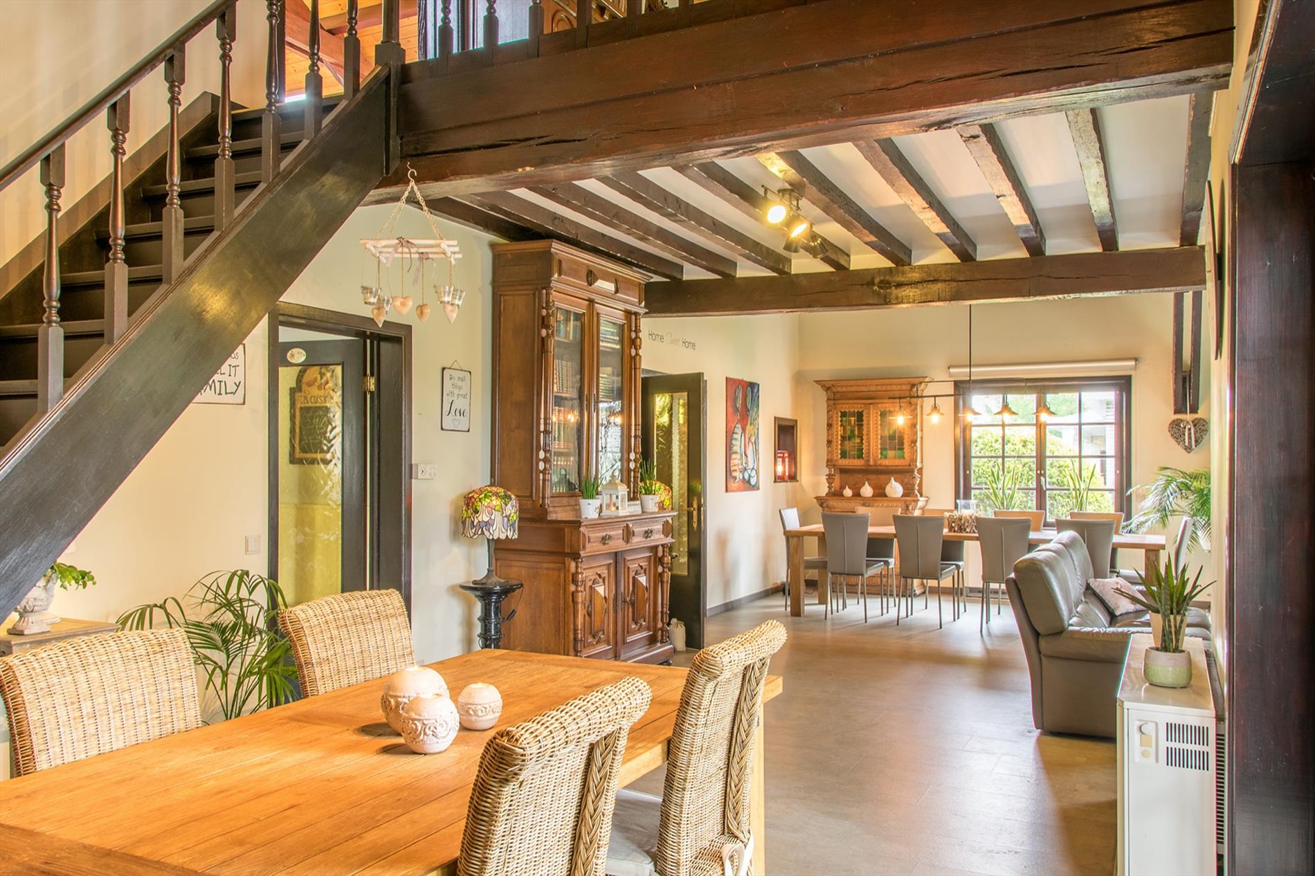 Schrijf u inIn deze villa in landelijke stijl ontvang je vrienden en familie in een omgeving met klasse! De riante woonkamer biedt een zee aan ruimte om te tafelen en gezellig te genieten aan de speksteenkachel. De ingesloten tuinkamer is hier zeker een bijkomende troef, net als het ruimtelijke gevoel dat door de hoge en open plafonds wordt gecreëerd. Naast de leefruimte bevindt zich de prachtige keuken. Via de centrale hall (die je ook kan bereiken via de voordeur) wordt je verder geleid naar de 4 ruime slaapkamers (elk met eigen lavabo), het sfeervolle bureel of 5de slaapkamer, een gastentoilet (met douche !) en de badkamer met ligbad. Via de trap bereik je een grote mezzanine met plaats voor bijvoorbeeld een TV-hoek, en achter een dubbele deur is er een gigantische polyvalente ruimte, nu bureau en 2 zolders (incl. airco en toilet). Mogelijkheid voor bijberoep of extra slaapkamers. Onder de volledige woning is er bovendien een kelderverdieping van 240 m² !