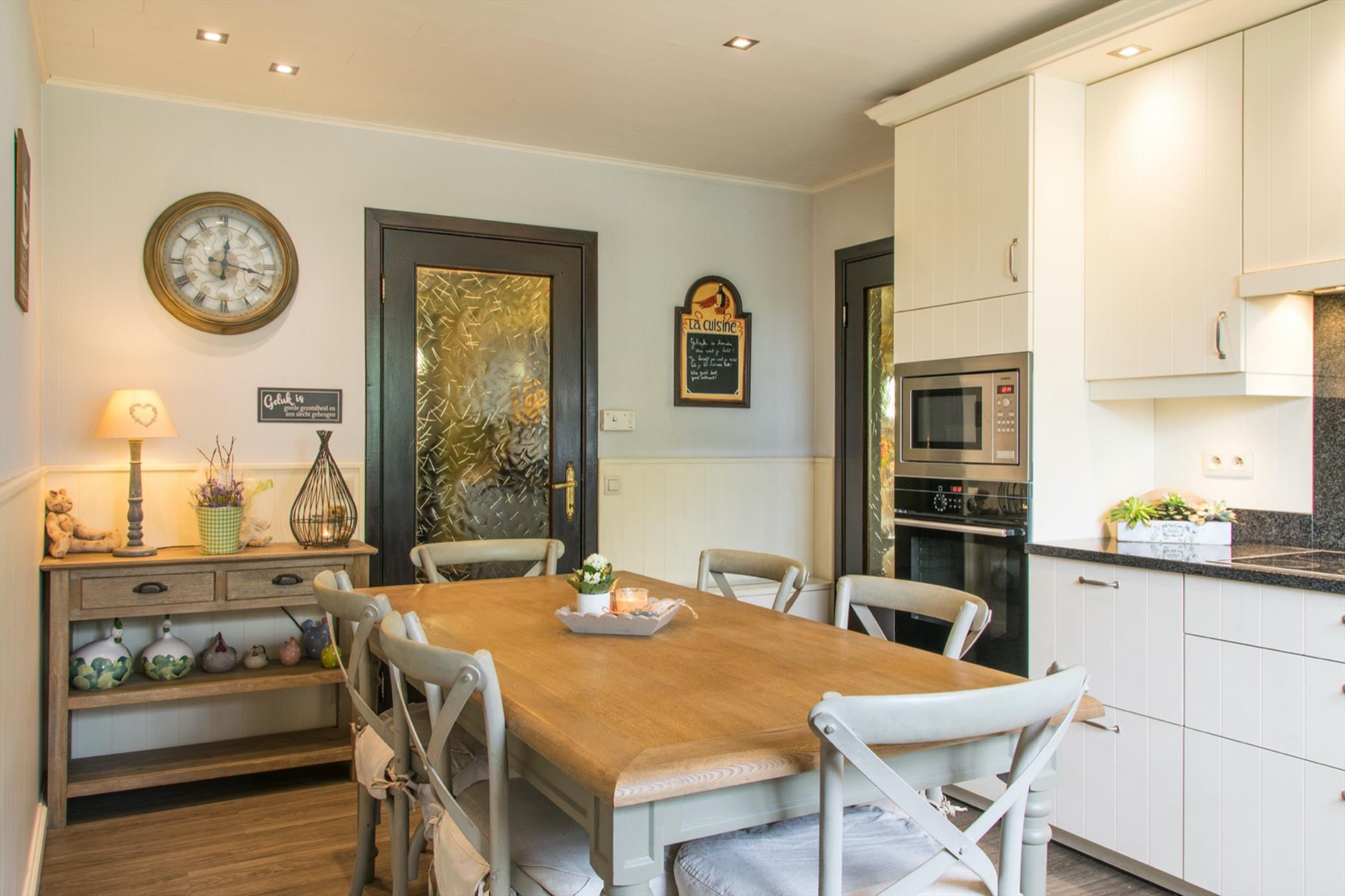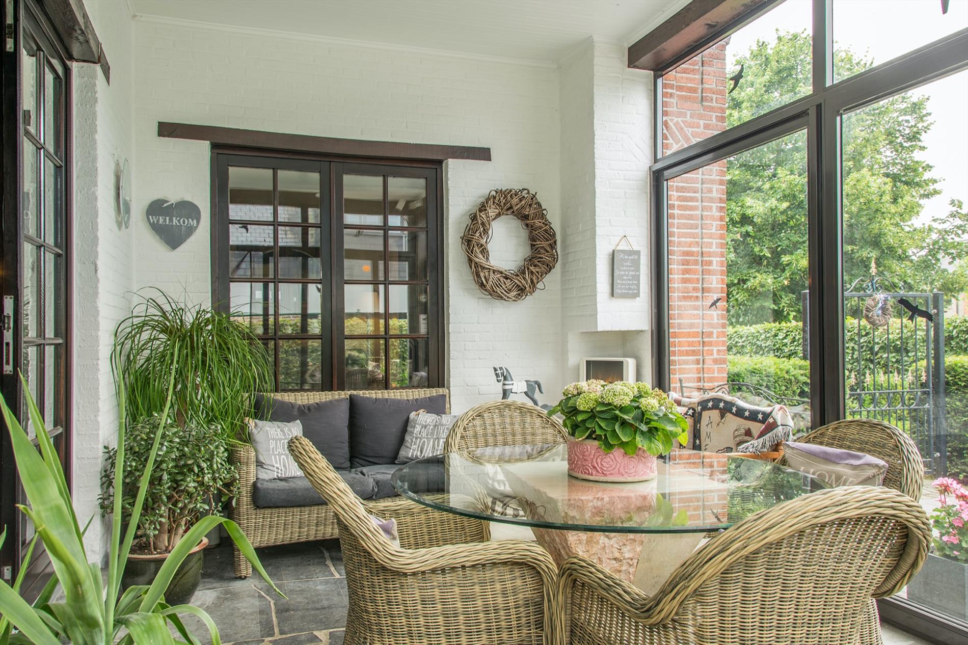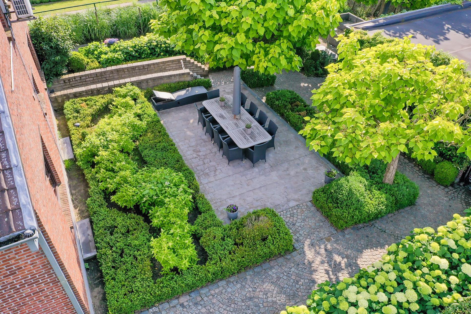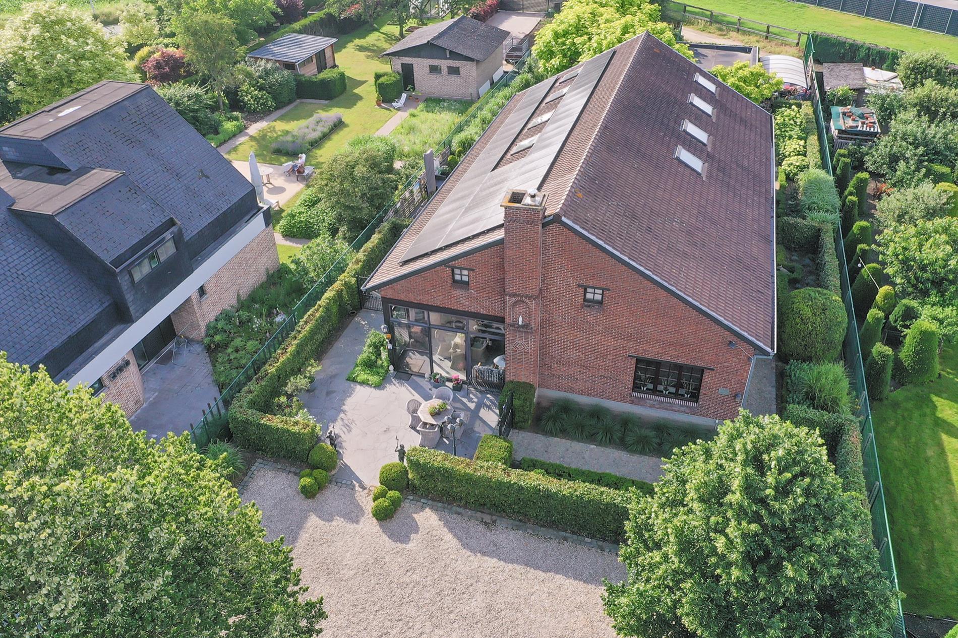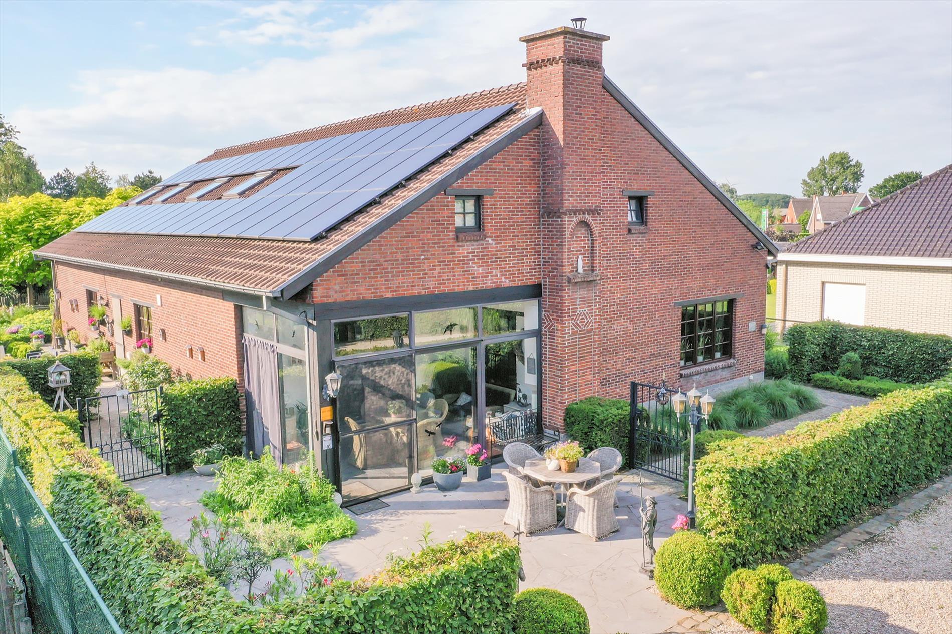 In de mooi aangelegde tuin zijn er diverse gezellige terrassen, 4 parkeerplaatsen vooraan én een garage met carport achteraan (te bereiken via een private weg). 42 zonnepanelen, regenput.