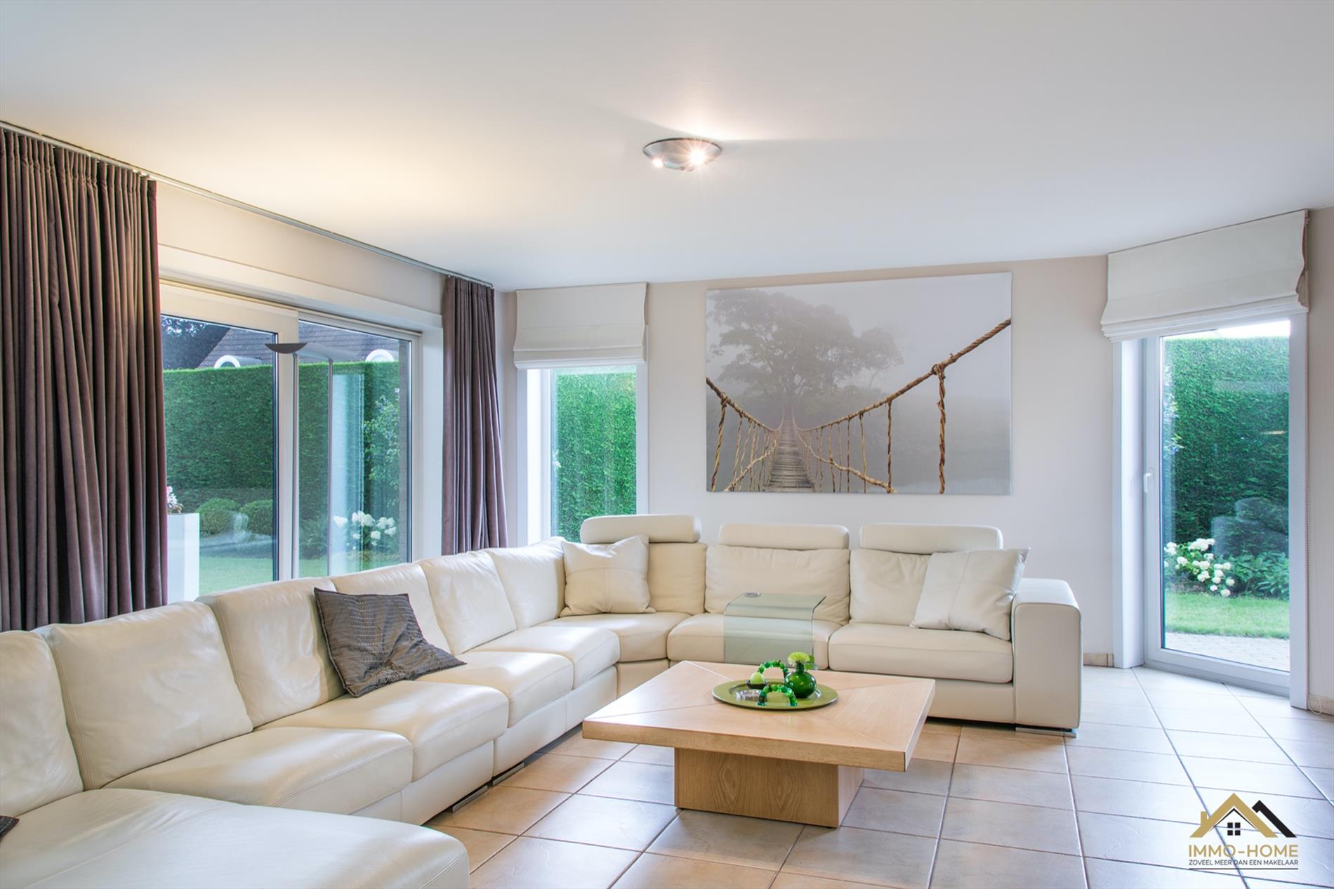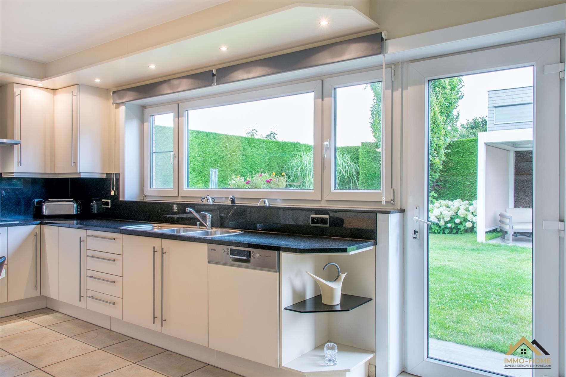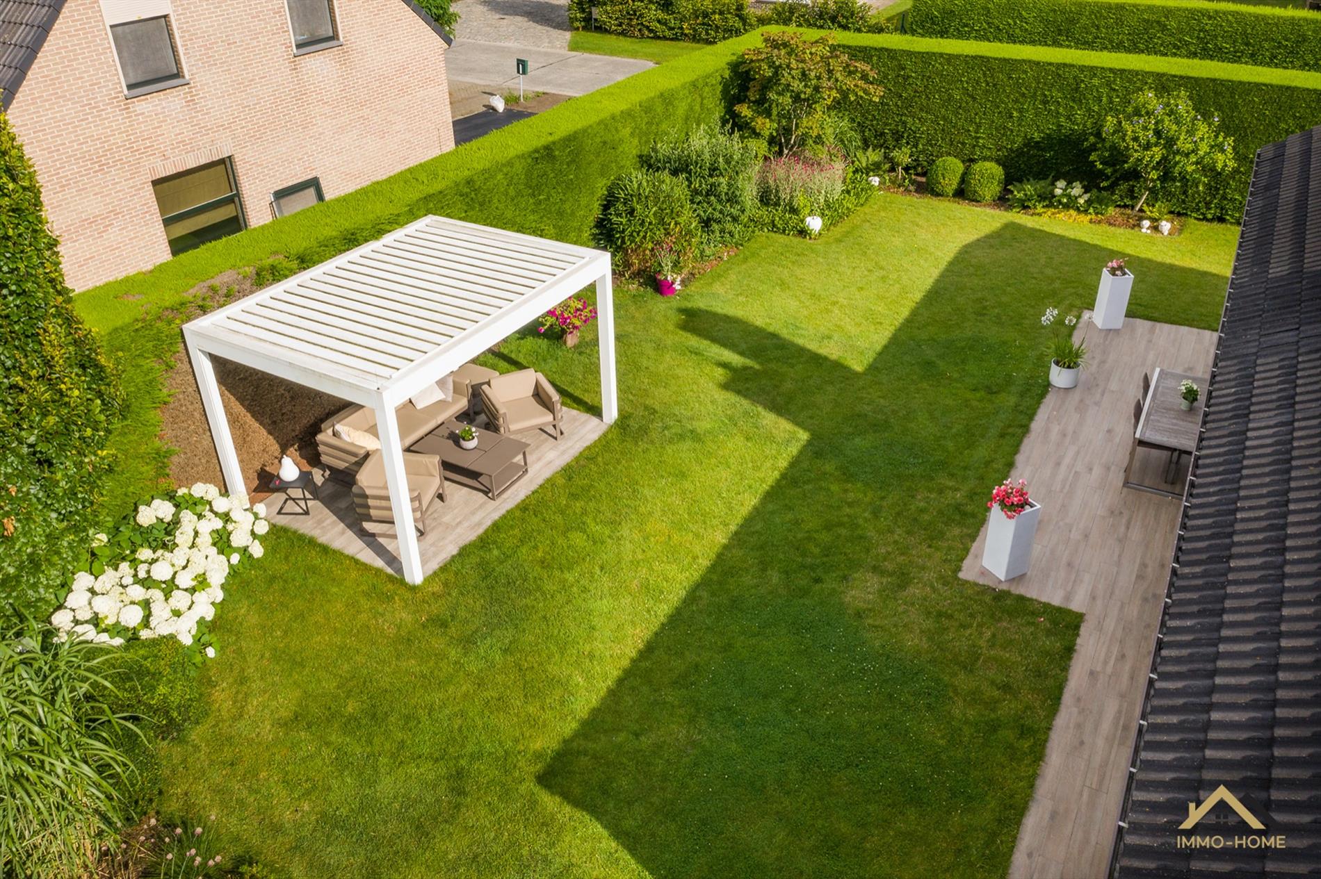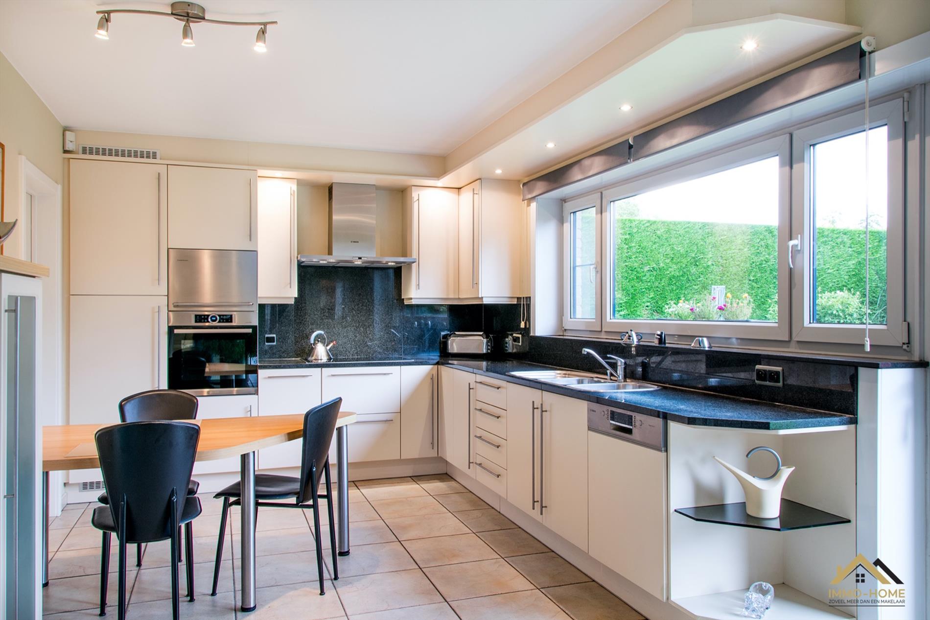 In de riante inkomhal van deze perfect onderhouden en instapklare villa verwelkom je elke gast in stijl. Via de hal (met gastentoilet) bereik je de grote L-vormige leefruimte met zeer veel lichtinval door de vele raampartijen rondom. Deze zorgen ook voor een heel open contact met de tuin en het aangename terras. De stijlvol ingewerkte gashaard maakt het plaatje compleet. De keuken is semi-open, door de glazen deur die de afscheiding vormt tussen keuken en living. De keuken zelf is evenzeer ruim, met ook hier weer mooi zicht op de tuin (en directe toegang tot het terras). Alle comfort is aanwezig, en het natuursteen werkblad zorgt voor een extra touch. De dubbele garage (met automatische poort) is zowel via de inkomhal als de keuken bereikbaar. Op de eerste verdieping bevinden zich drie zeer ruime slaapkamers (waarvan één met aansluitende dressing), een grote badkamer met bad én douche, een handige bergruimte en een tweede toilet. Genieten van de tuin doe je zeker en vast vanuit de hippe lounge met regelbare afscherming en elektrisch bediende zijpanelen !