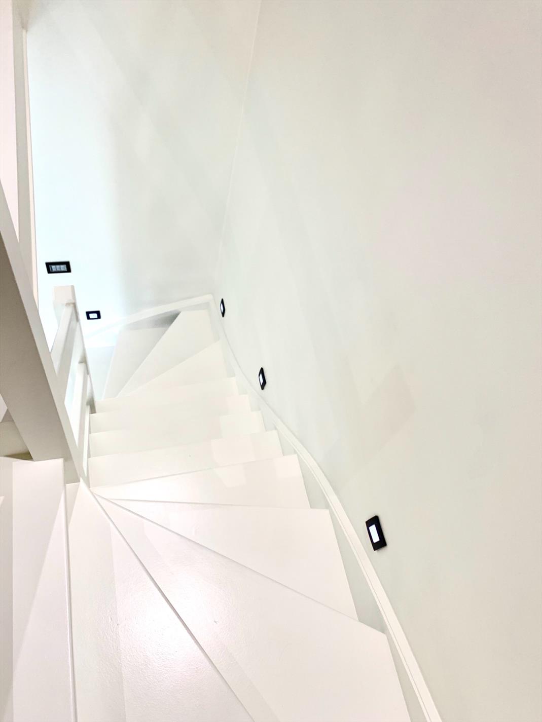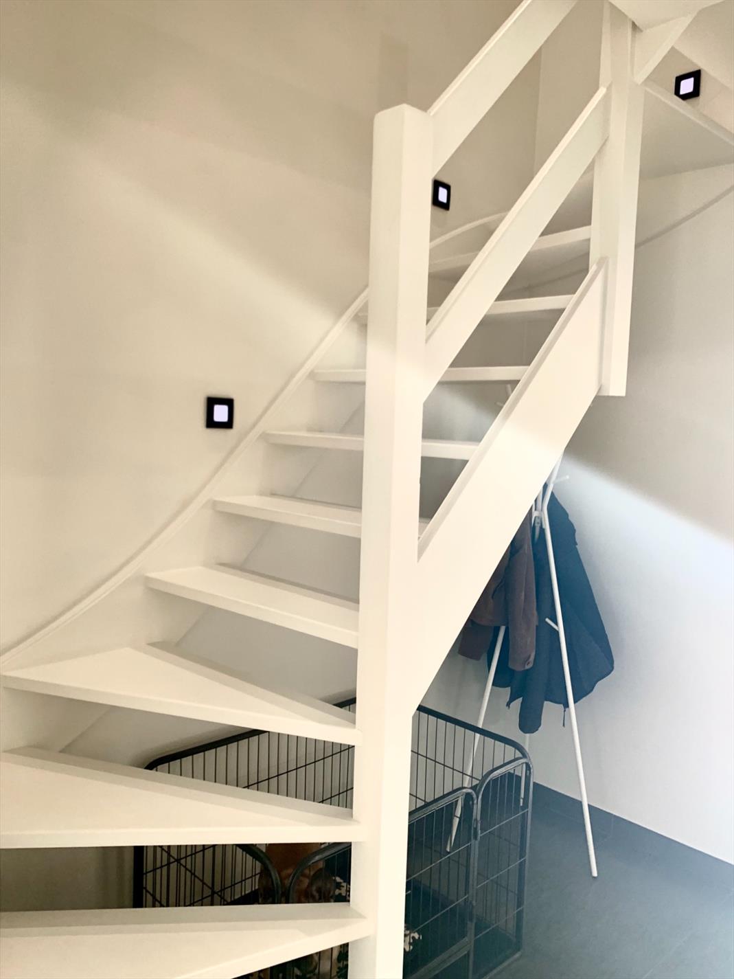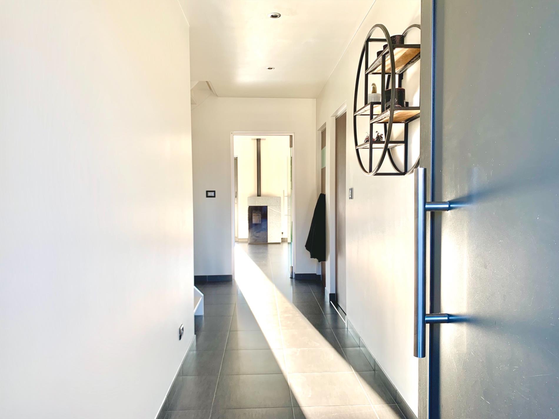 De ruime inkomhal met prachtige witte trap is voorzien van een gastentoilet en geeft u de toegang tot de garage met elektrische poort incl. wasplaats.