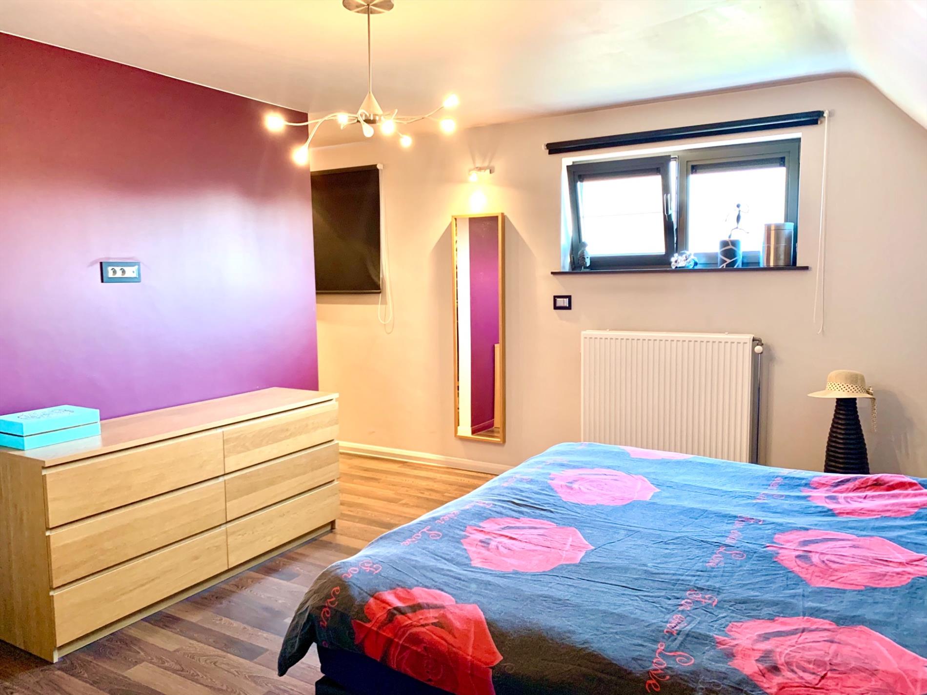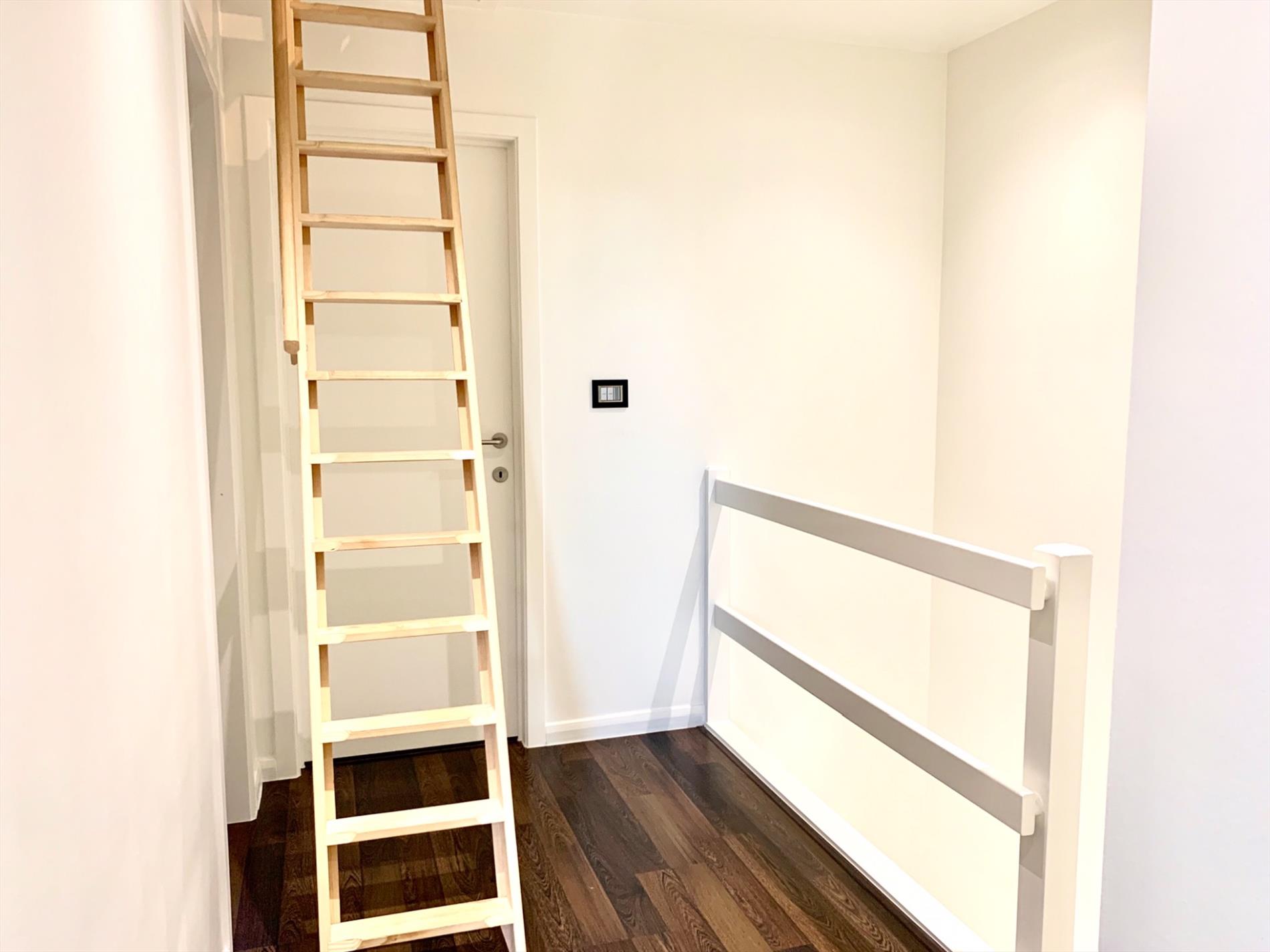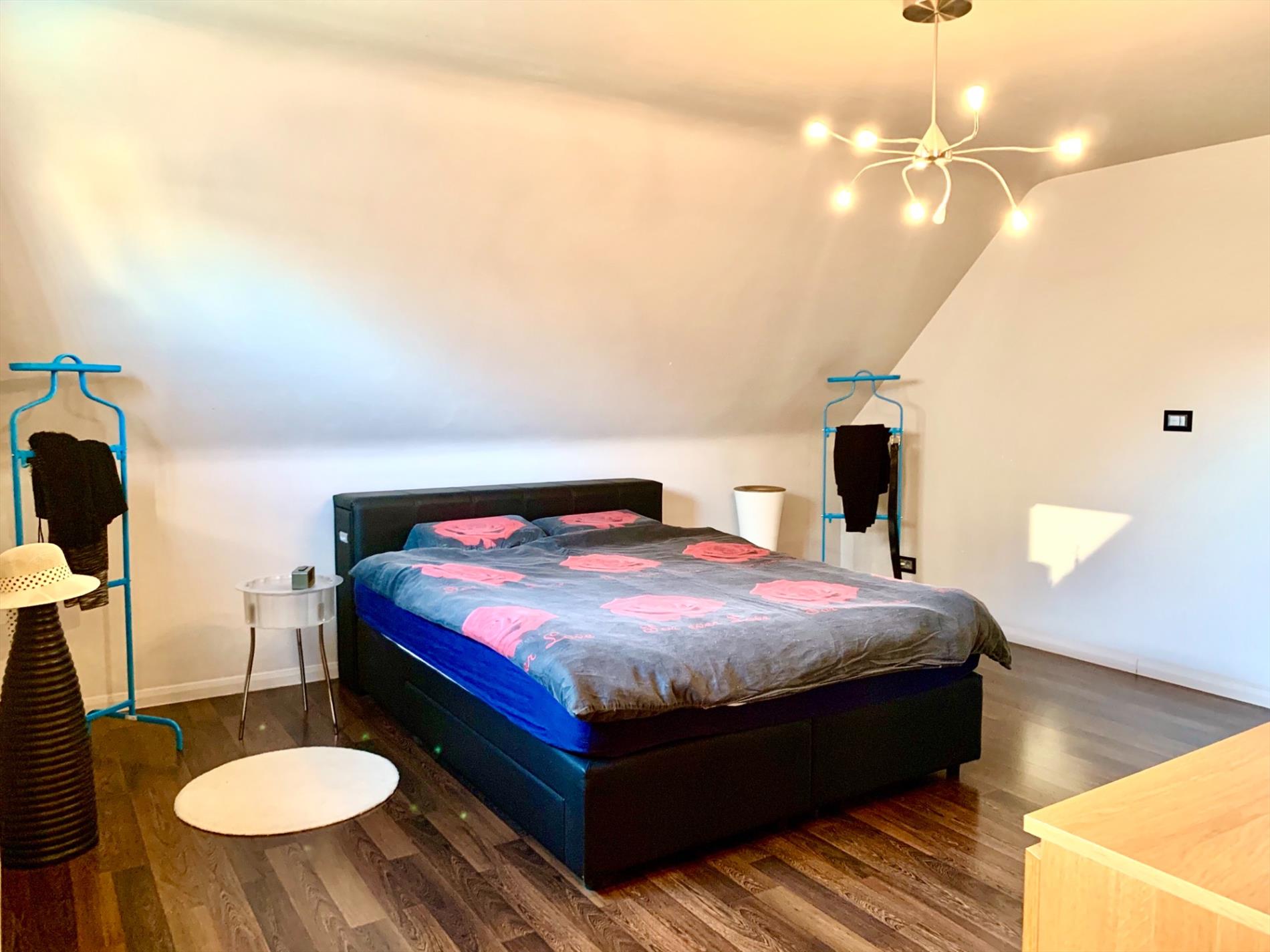 De zolder is volledig ingericht als 4de grote slaapkamer, momenteel nog te bereiken via houten trap (met leuning) die wel altijd kan blijven open staan of kan vervangen worden door vaste trap. Achter deze kamer is nog een aparte zolder behouden.