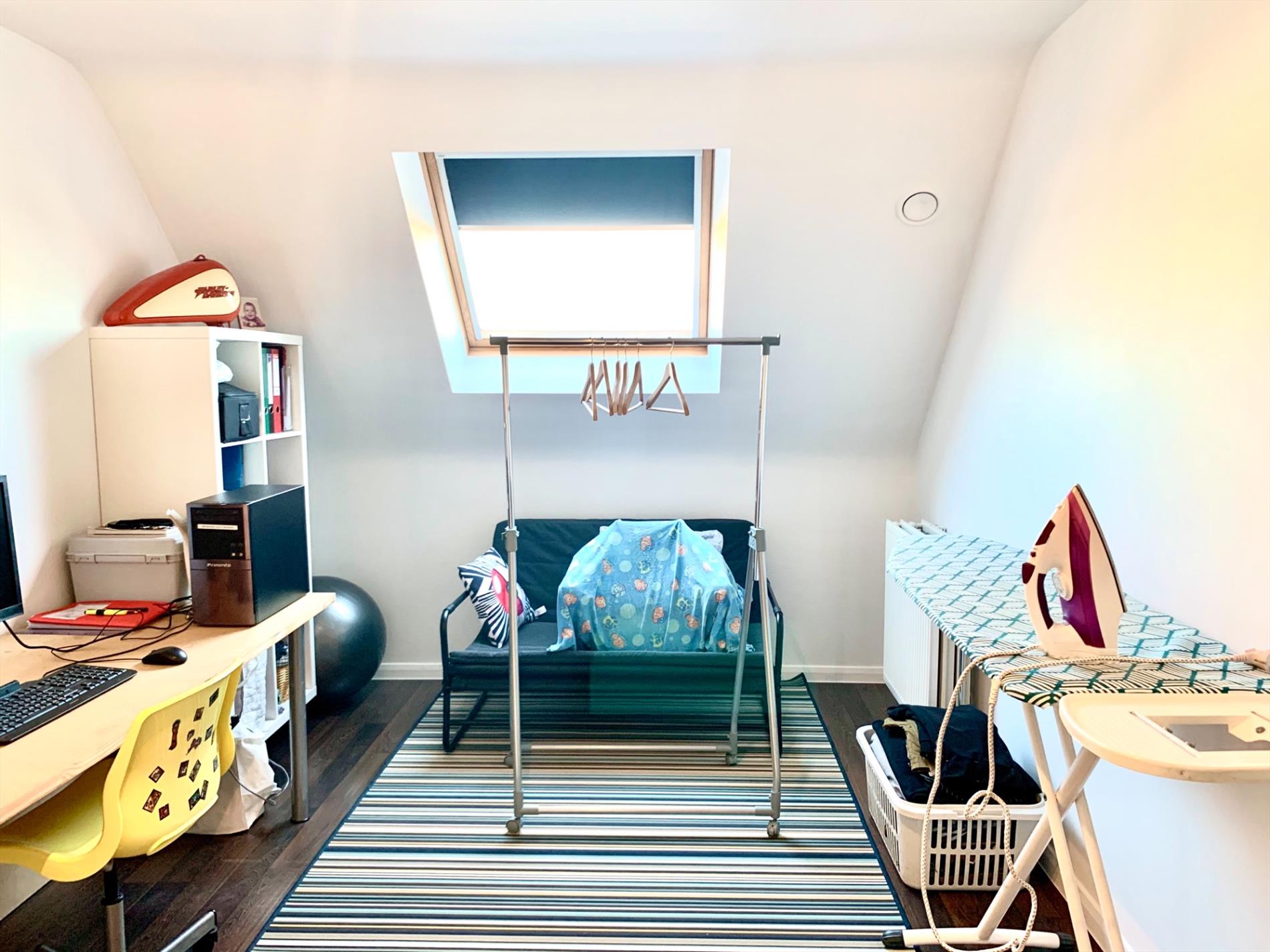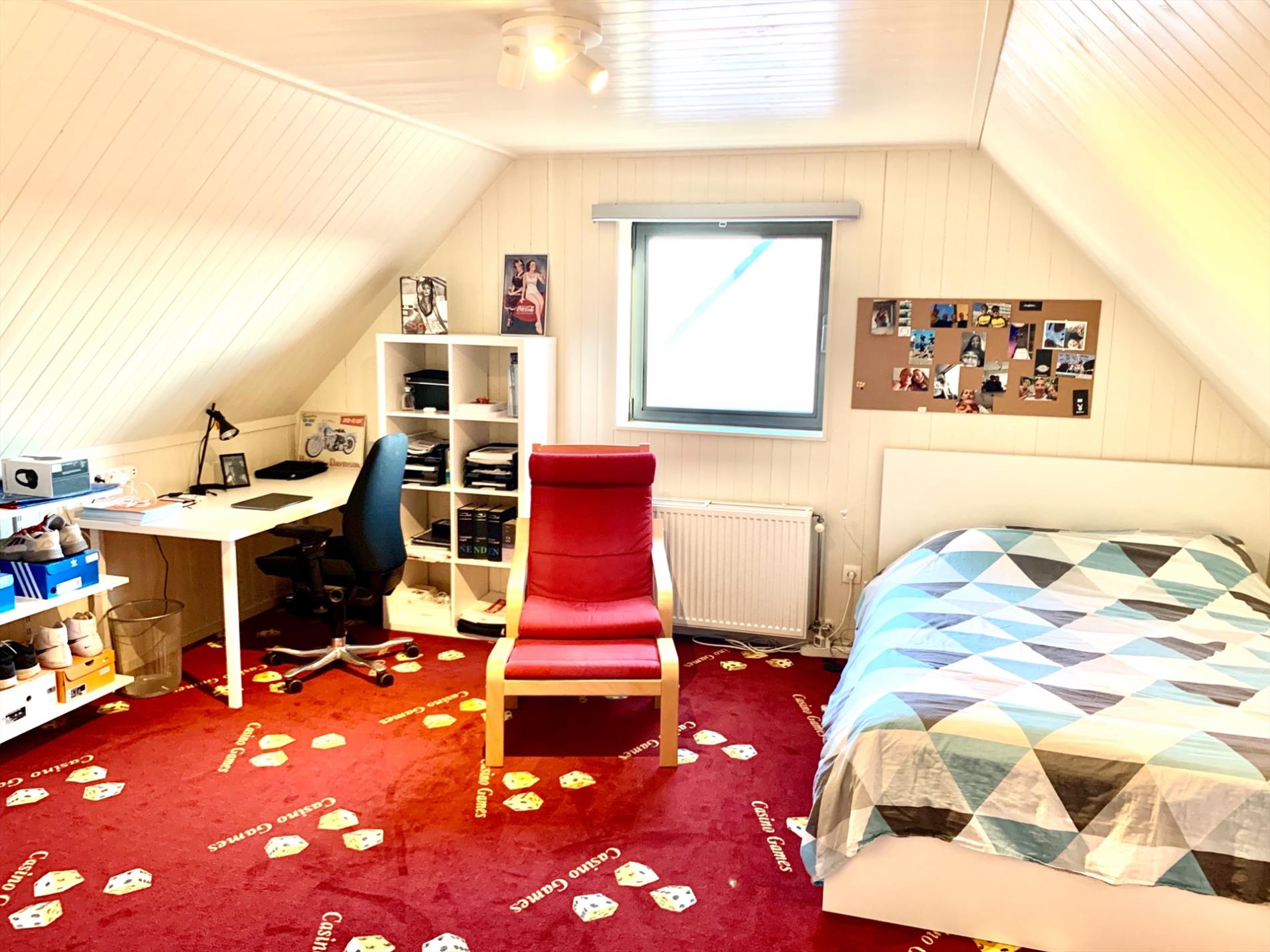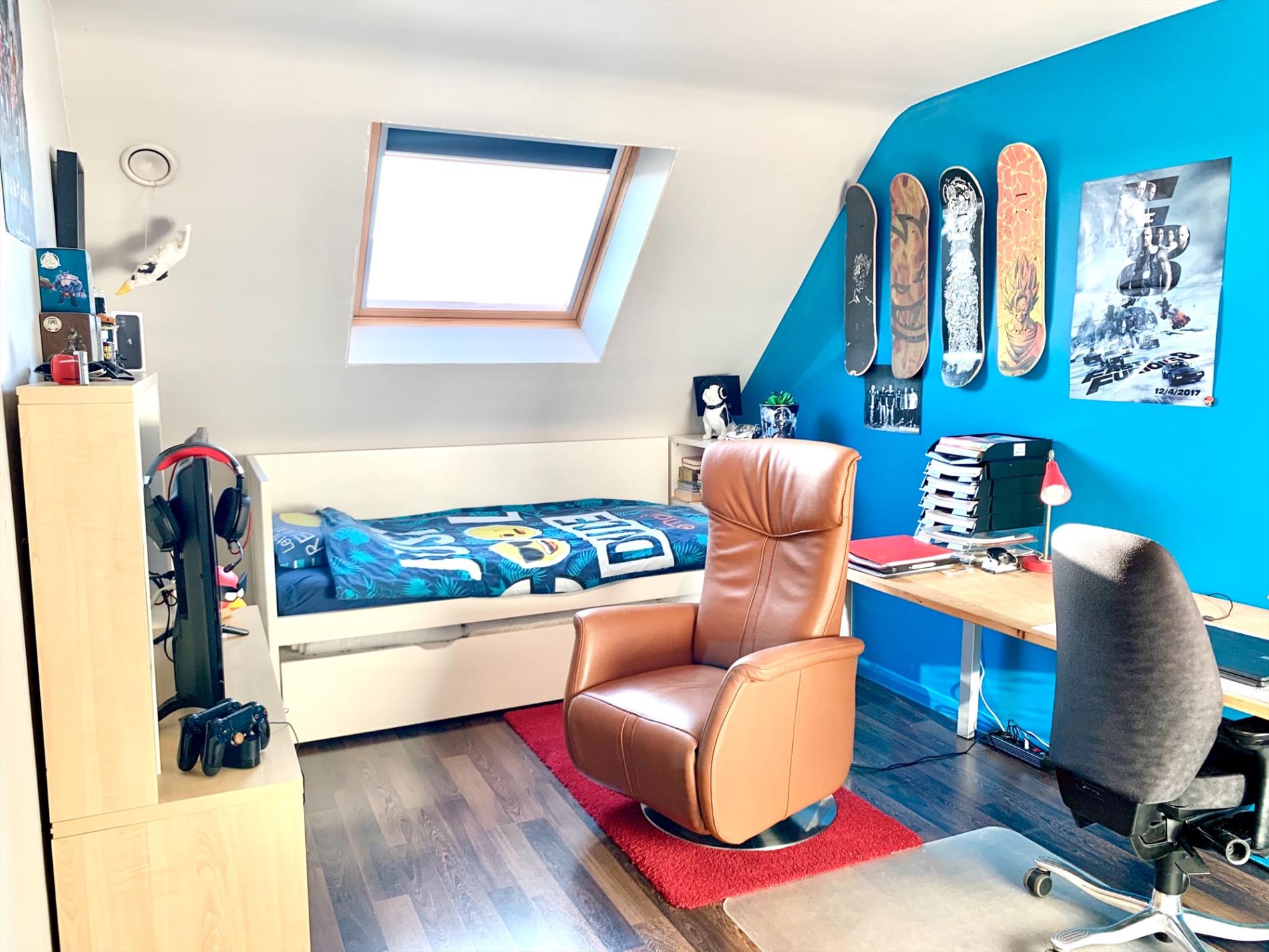 De zolder is volledig ingericht als 4de grote slaapkamer, momenteel nog te bereiken via houten trap (met leuning) die wel altijd kan blijven open staan of kan vervangen worden door vaste trap. Achter deze kamer is nog een aparte zolder behouden.