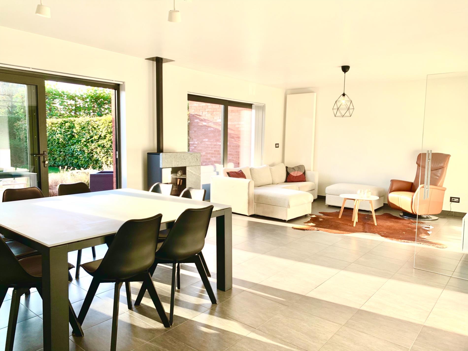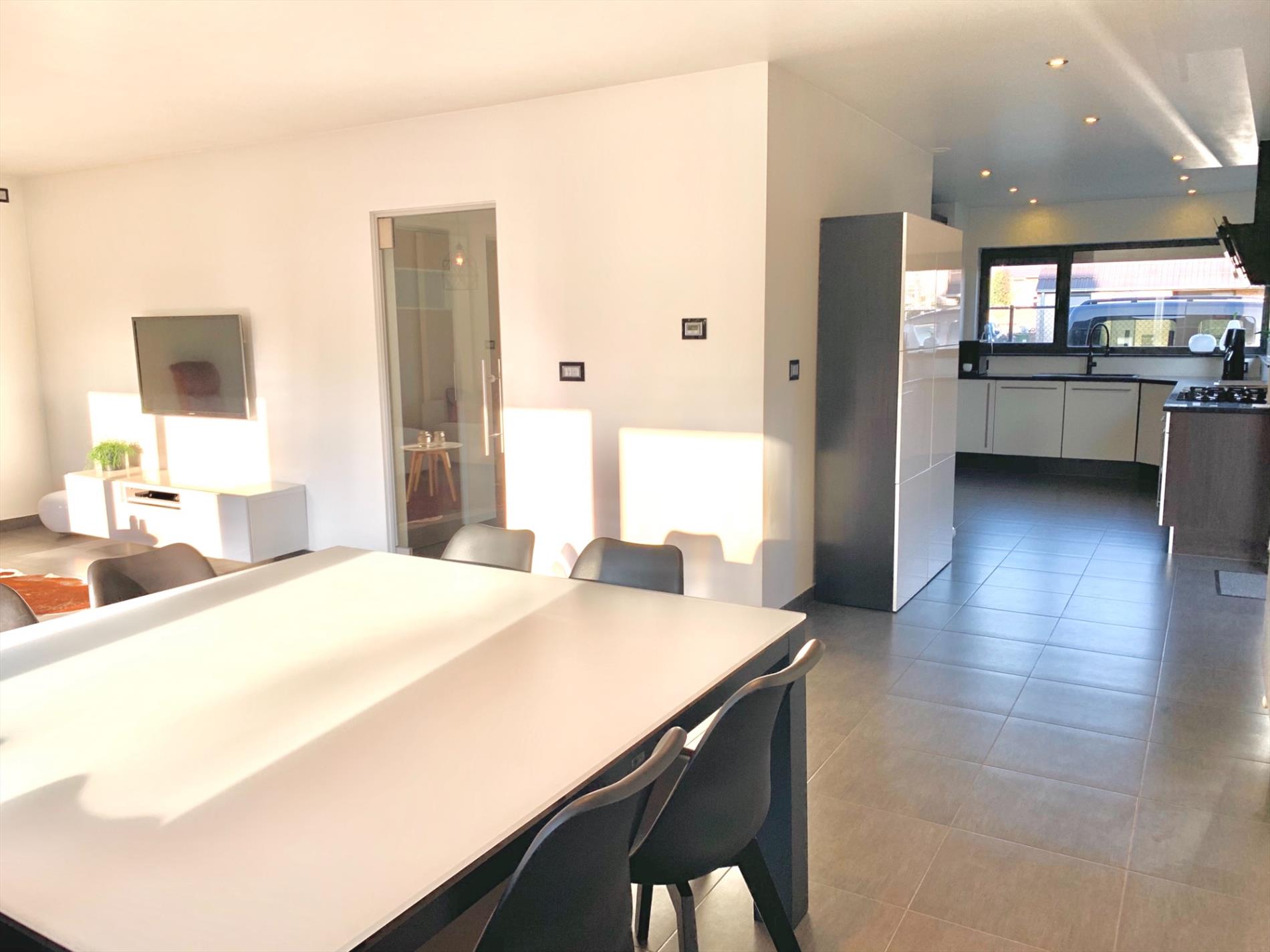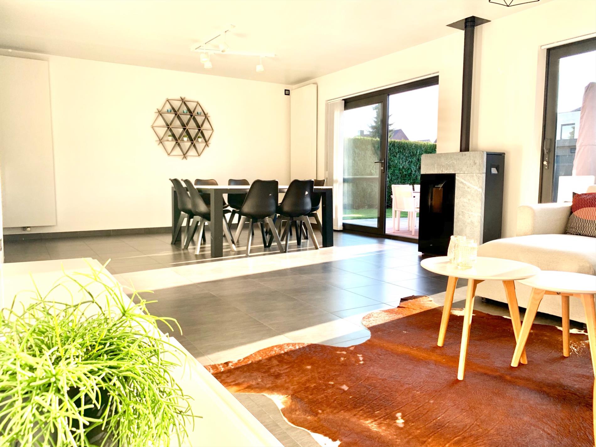 Via de glazen deur komt u in de zonovergoten woonkamer die voorzien is van schuiframen, een pelletkachel met speksteen en aansluitend een ruime witte, moderne open keuken incl alle nodige toestellen, nieuw sinds 2018.