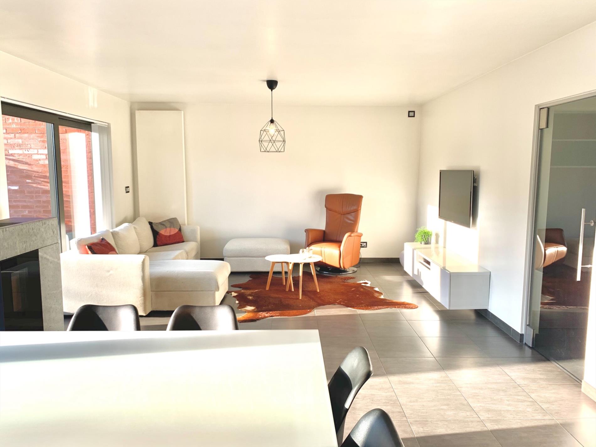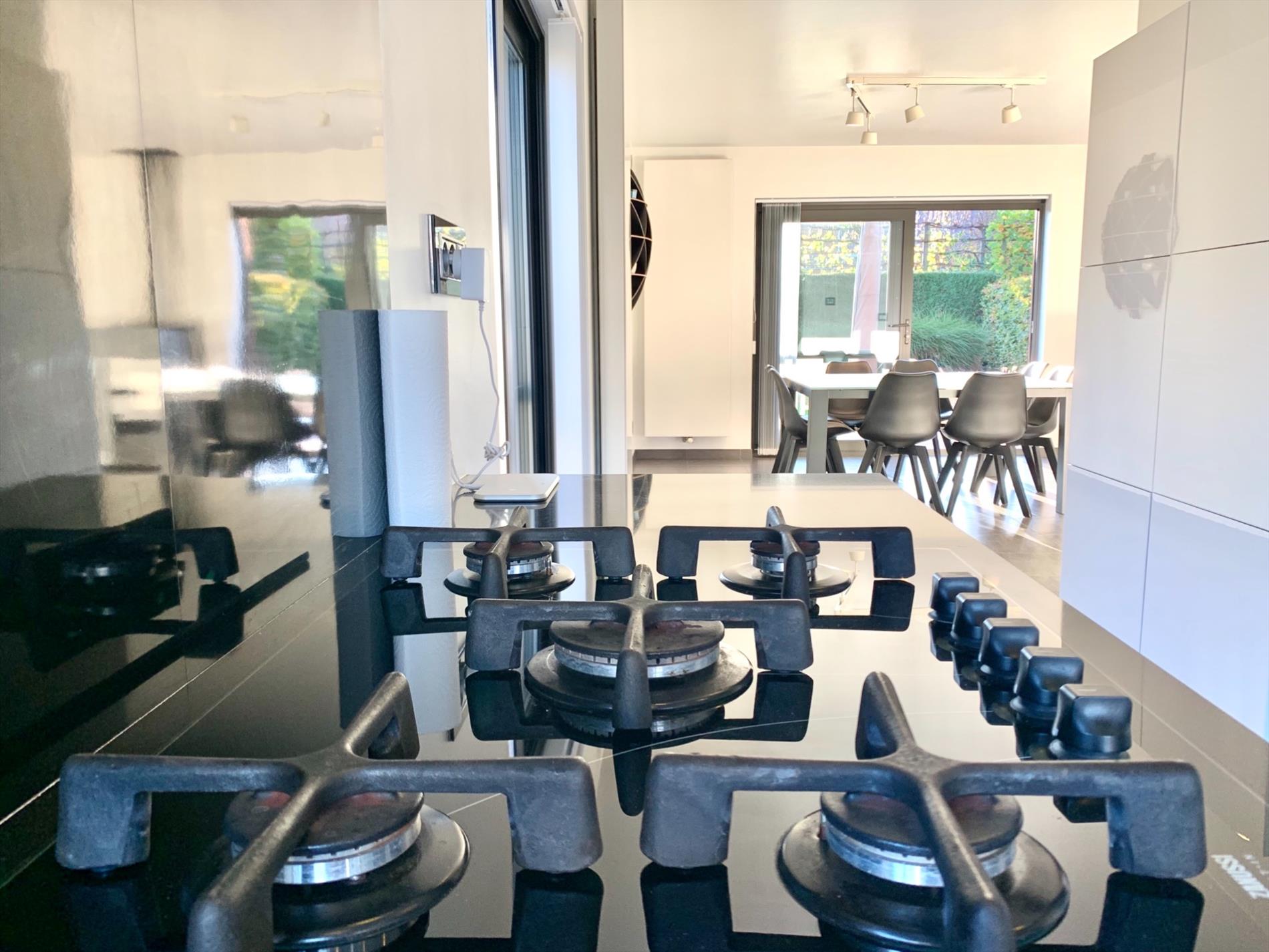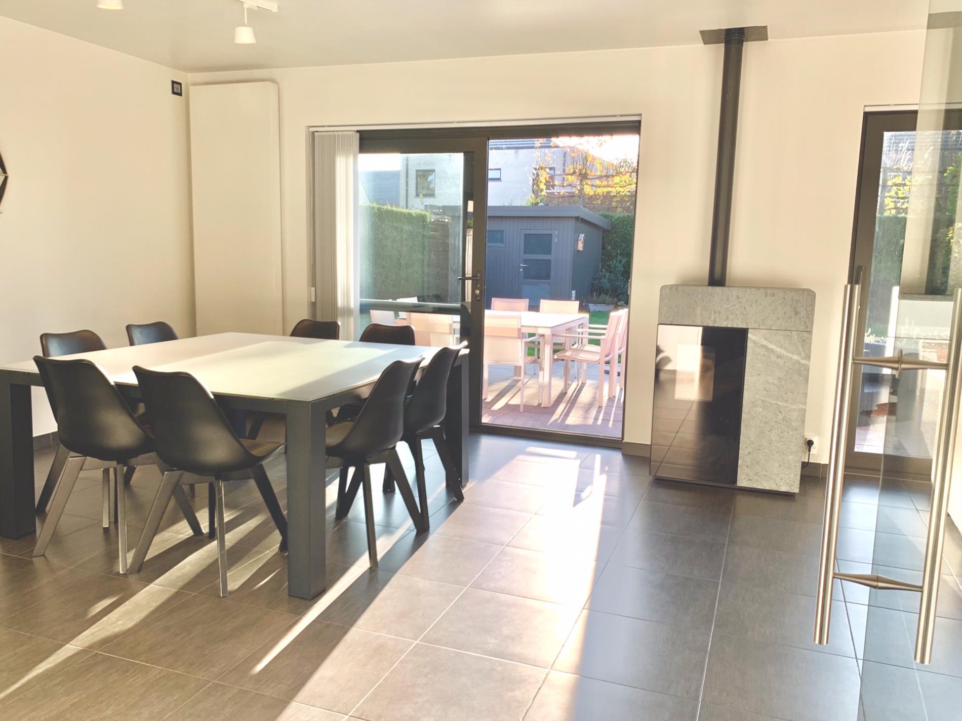 Via de glazen deur komt u in de zonovergoten woonkamer die voorzien is van schuiframen, een pelletkachel met speksteen en aansluitend een ruime witte, moderne open keuken incl alle nodige toestellen, nieuw sinds 2018.
