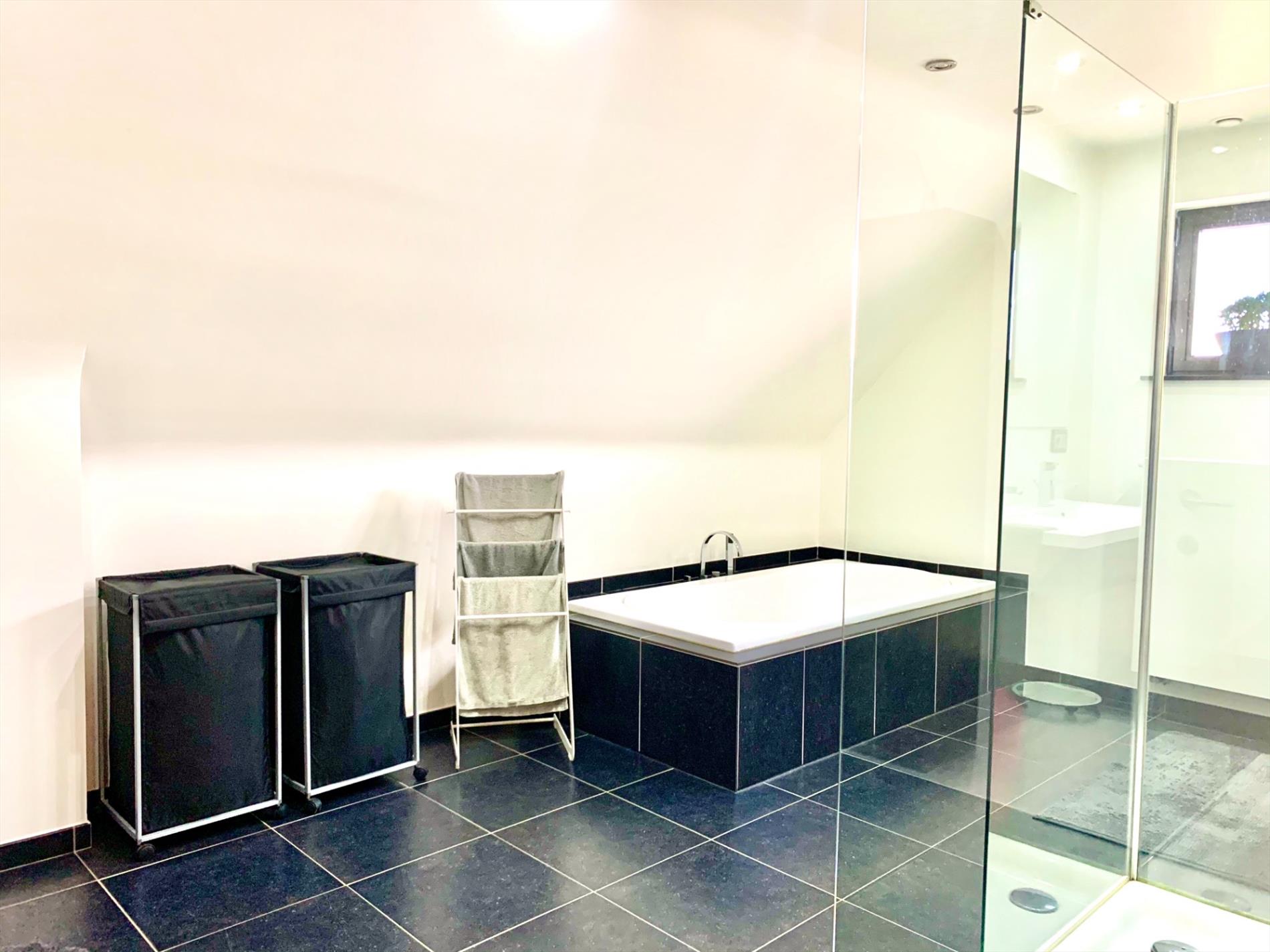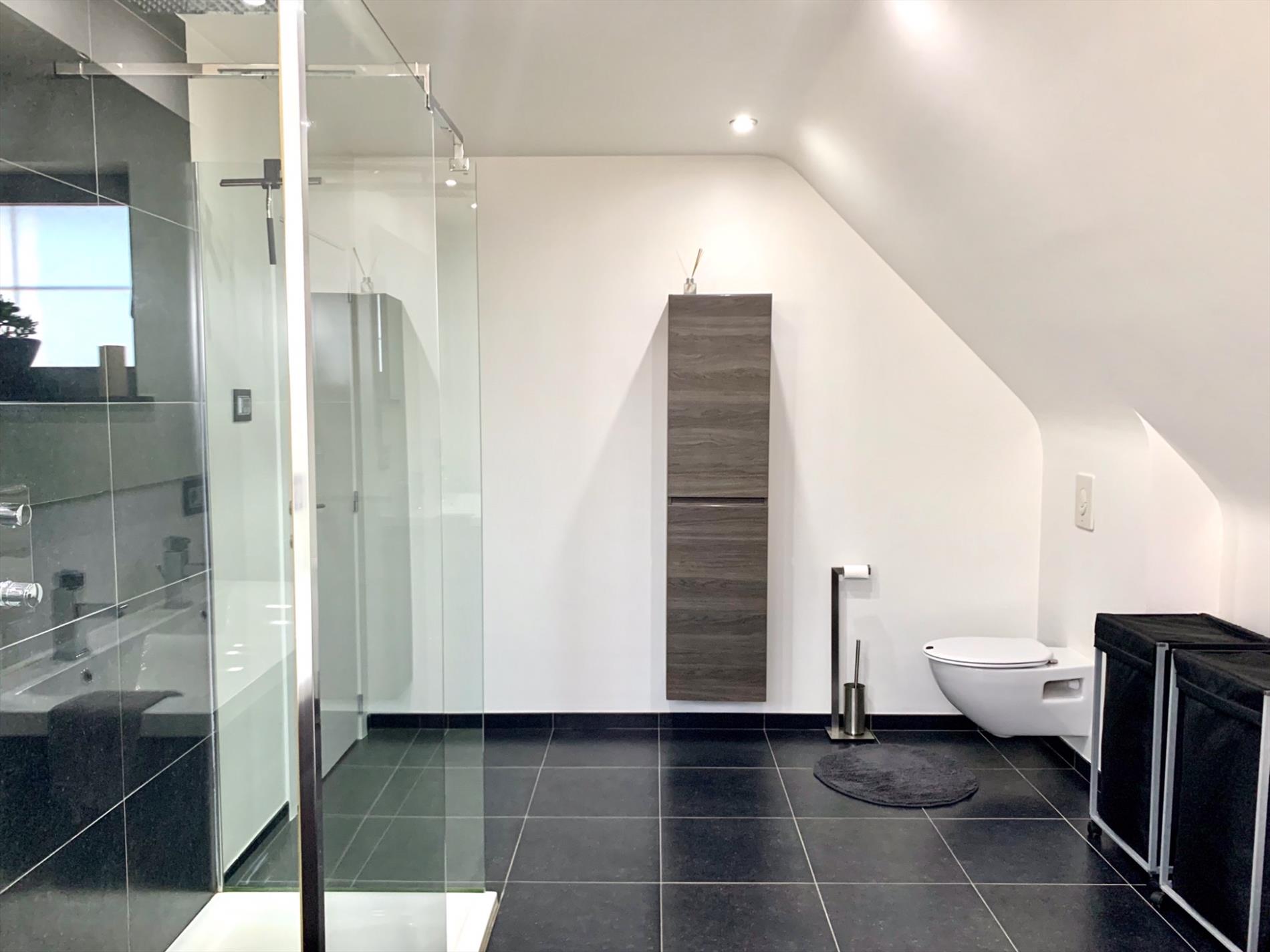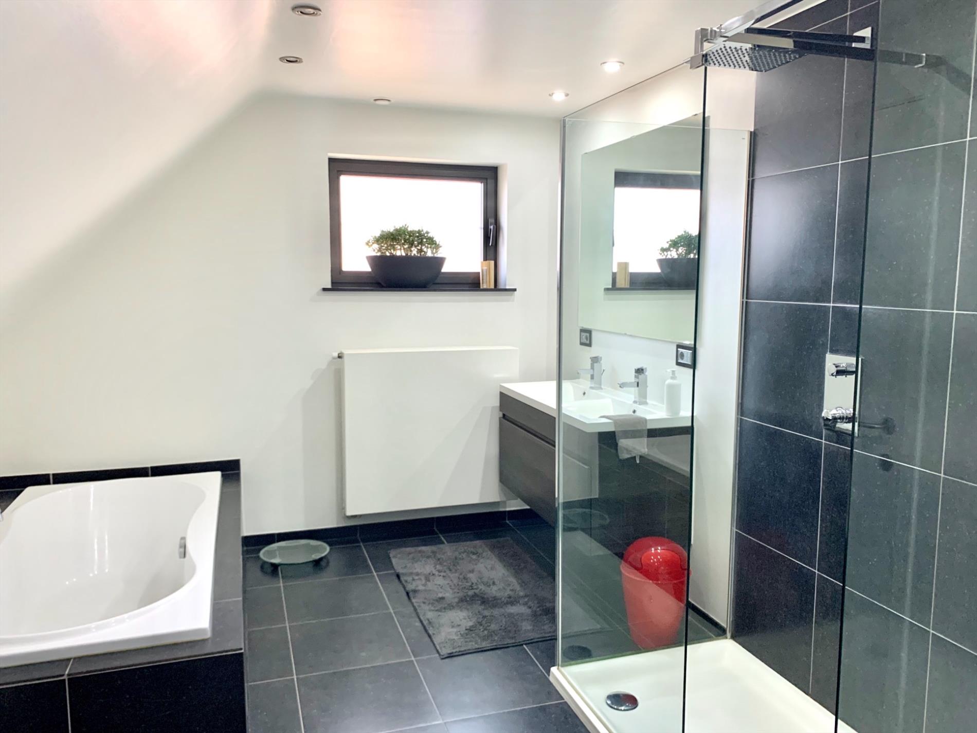 Op de eerste verdieping bevinden zich 3 ruime slaapkamers waarvan 1 met inloopdressing, alsook een enorme ruime badkamer met groot ligbad, inloopdouche, dubbel lavabo-meubel, en 2de toilet.