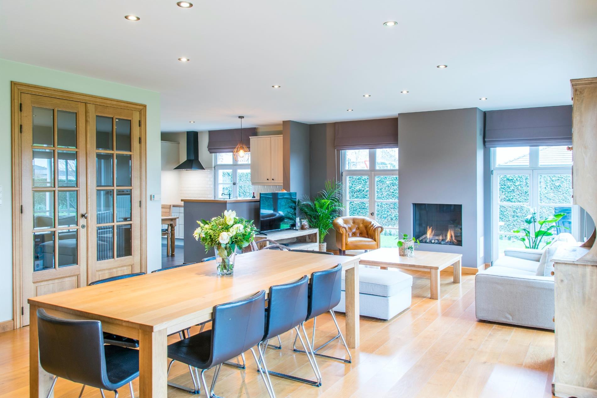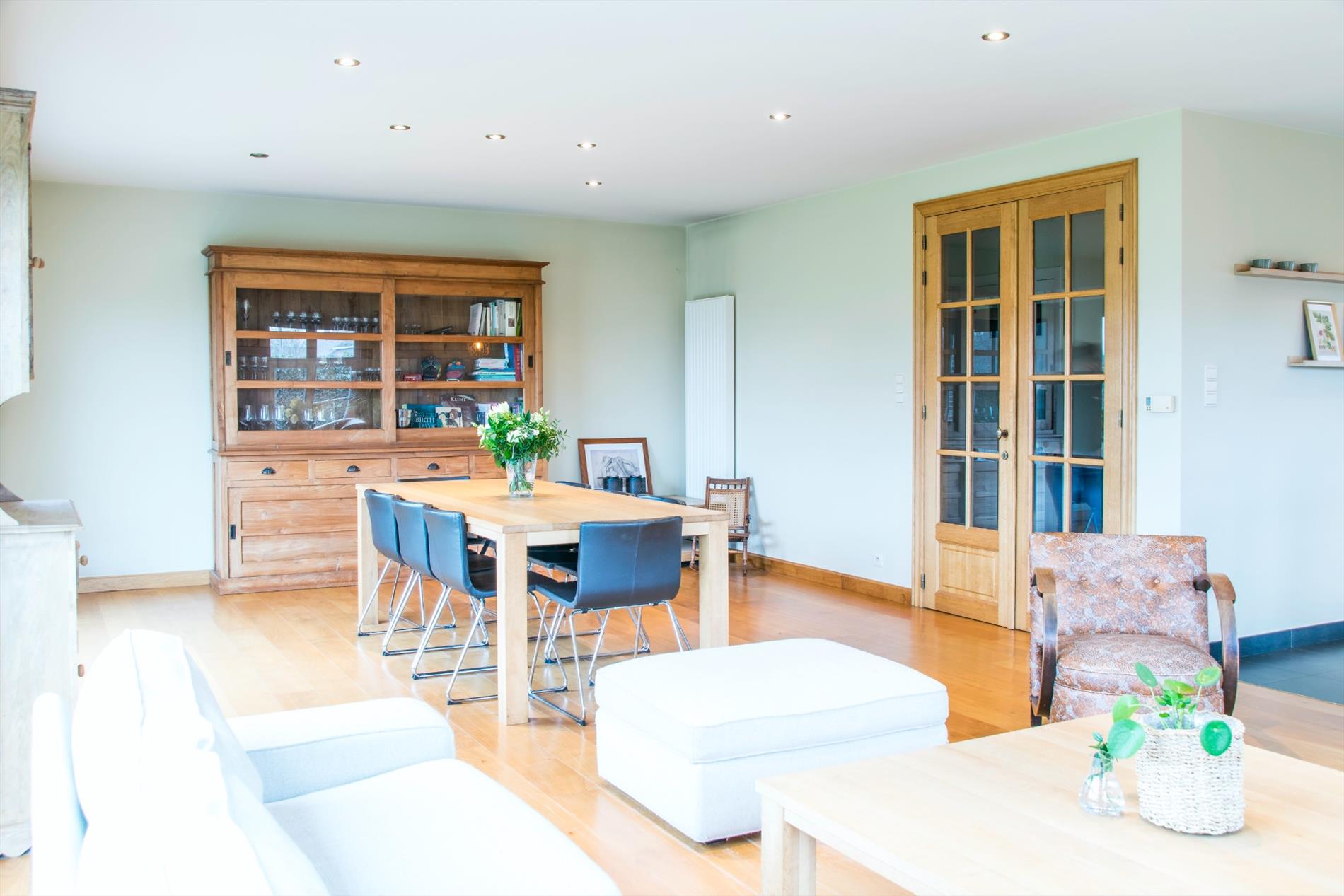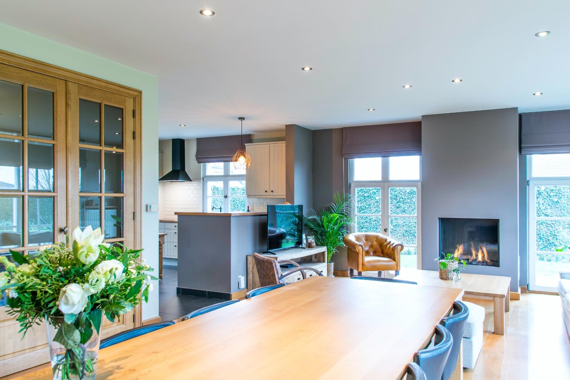 Via de zeer verzorgde voortuin komt u in de statige inkomhal met gastentoilet die voorzien is van een rustieke kerkvloer en een majestueuze dubbele glazen deur in eik. Van hieruit komt u binnen in de zonovergoten woonkamer die voorzien van volhouten, eiken parket, ingebouwde gashaard en 3 schuiframen die u naar 2 terrassen brengt. Ook van binnenuit zal u genieten van de prachtige zonsondergangen.