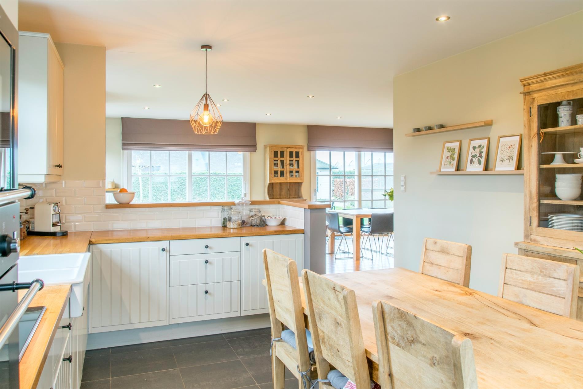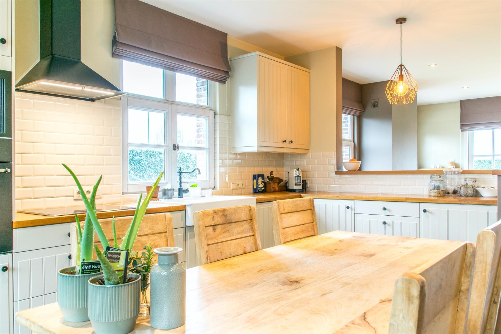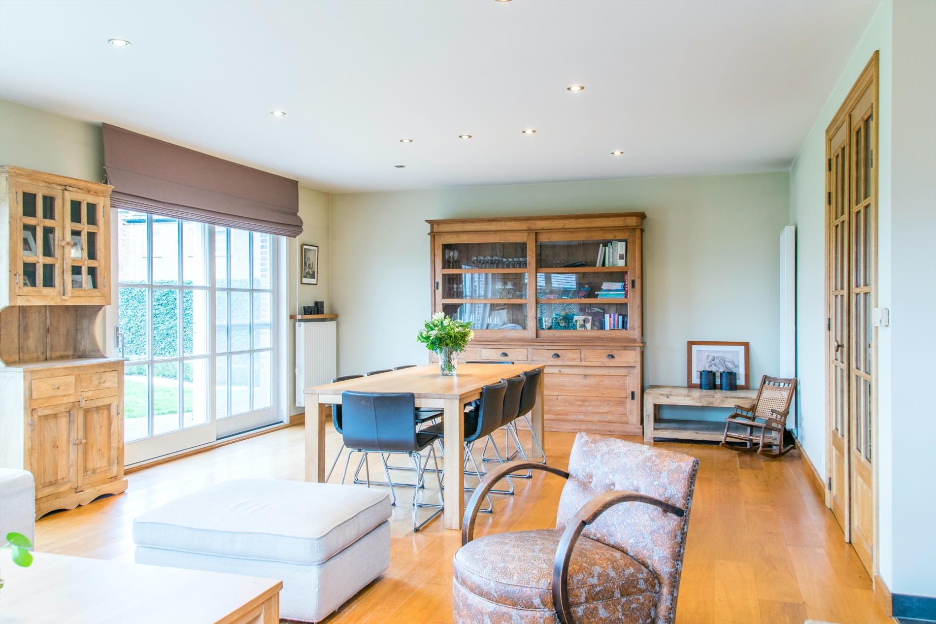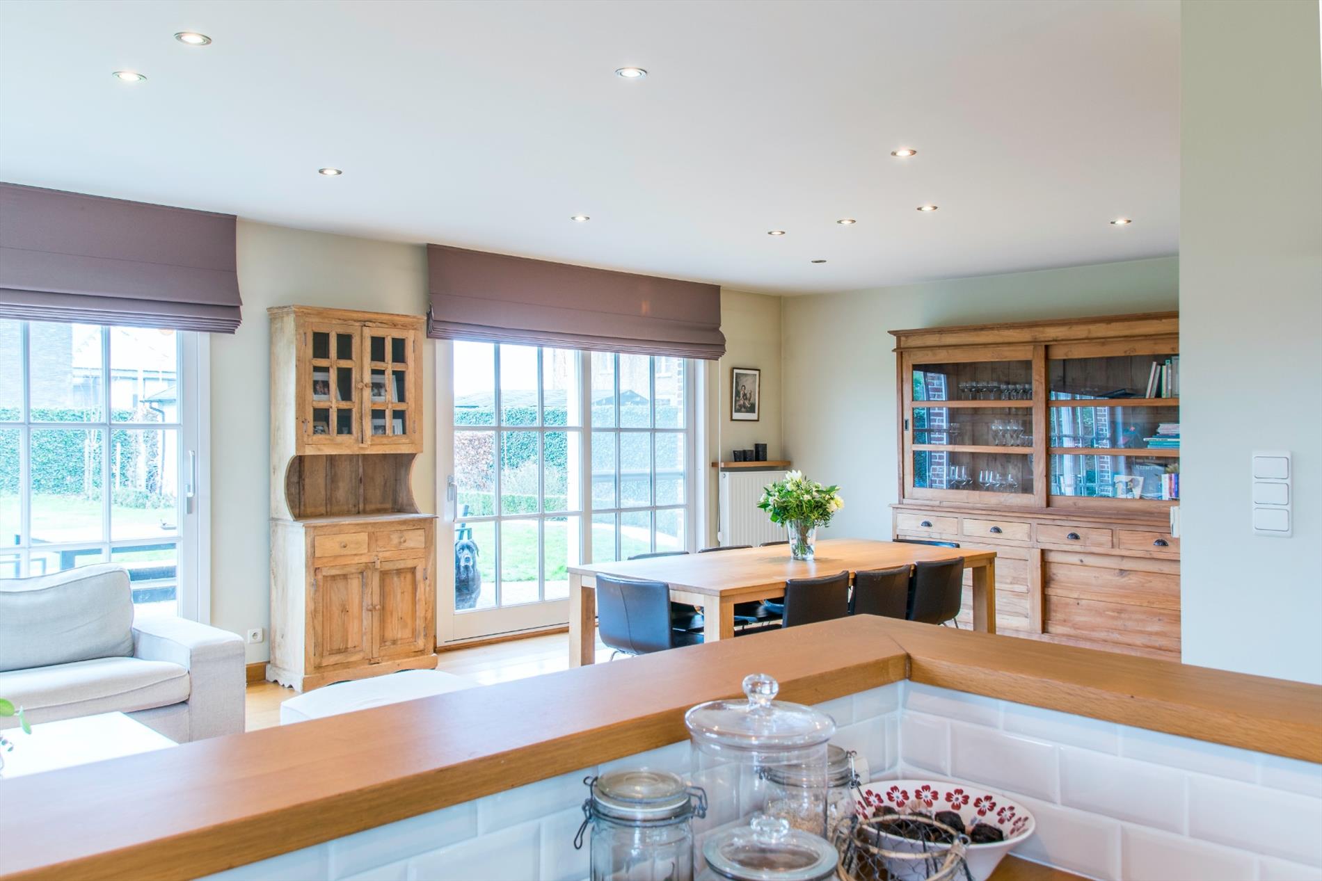 Via de zeer verzorgde voortuin komt u in de statige inkomhal met gastentoilet die voorzien is van een rustieke kerkvloer en een majestueuze dubbele glazen deur in eik. Van hieruit komt u binnen in de zonovergoten woonkamer die voorzien van volhouten, eiken parket, ingebouwde gashaard en 3 schuiframen die u naar 2 terrassen brengt. Ook van binnenuit zal u genieten van de prachtige zonsondergangen.
