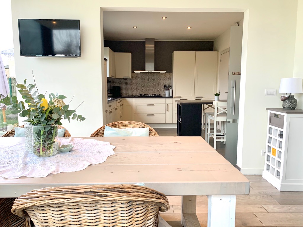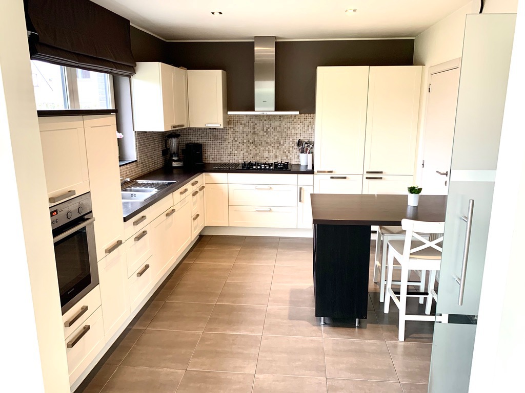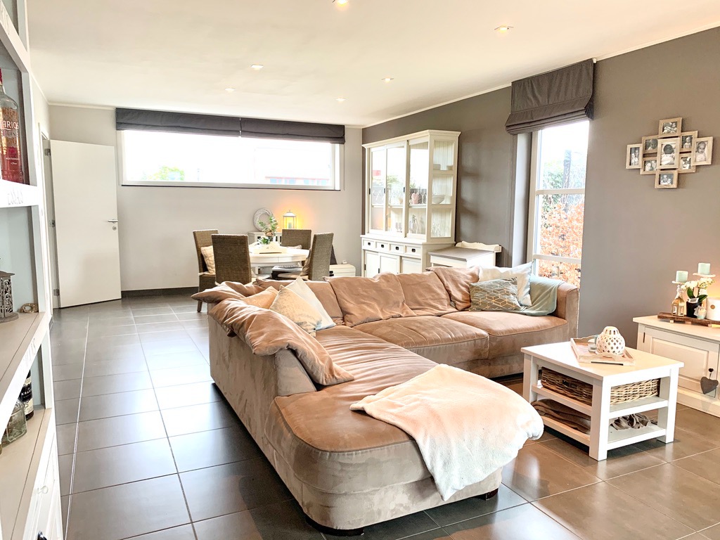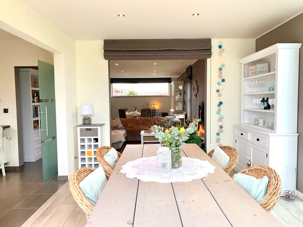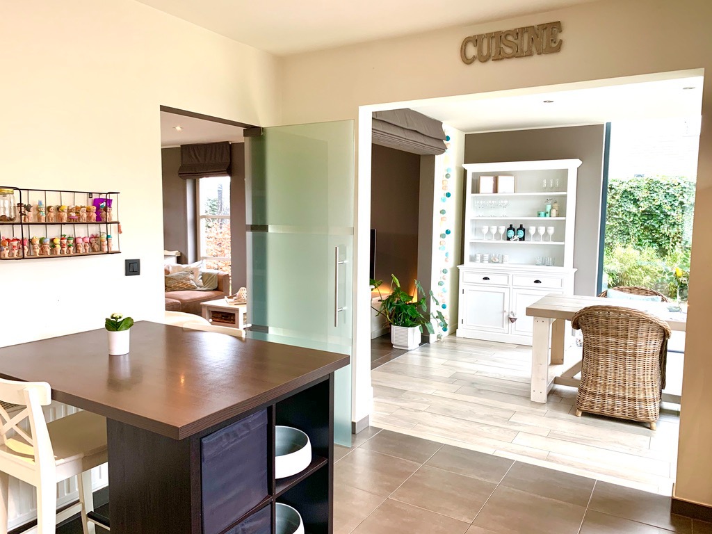 Via de voortuin kan u naar de ingang van de woning. Van zodra u binnenkomt in de inkomhal voel je de warmte en gezelligheid al hangen. De inkomhal is voorzien van ingemaakte kasten en een gastentoilet, van hieruit ga je naar de woonkamer met aansluitend een aparte bureauruimte. De zonovergoten bijbouw dat grenst aan de woonkamer en keuken is hier een absolute meerwaarde, hier geniet je in de winter van de binnenkomende zonnestralen en in de zomer kan je het aanzien als een overdekt terras aangezien de schuiframen volledig open kunnen. De aanpalende open keuken is zeer praktisch ingericht en voorzien van alle nodige toestellen en een aparte berging.