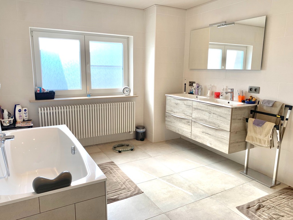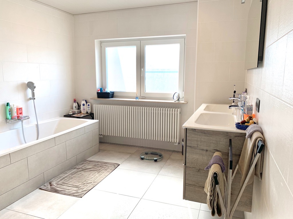 Op de eerste verdieping zijn 3 ruime slaapkamers, aparte bergruimte en een pracht van een badkamer met inloopdouche, dubbel lavabo-meubel, ligbad, handdoek droger en 2de toilet. Er is ook een zeer grote zolder over de hele woning die volledig geïsoleerd is. De tuin begint vooraan incl oprit en loopt door aan de zijkant van de woning tot achteraan, deels afgesloten door een poortje, ook terras met zonneluifel en tuinhuis aanwezig. Extra's: Isolatie spouwmuren, overal rolluilken, nieuwe ramen en buitendeuren incl vliegenramen, dakgoten vernieuwd, aardgas aangelegd, nieuwe alarm installatie met meldkamer, enz.
