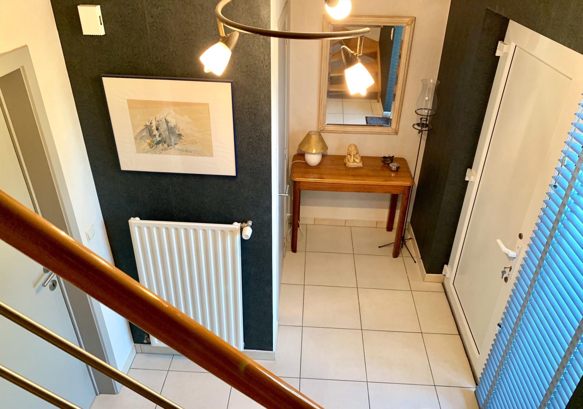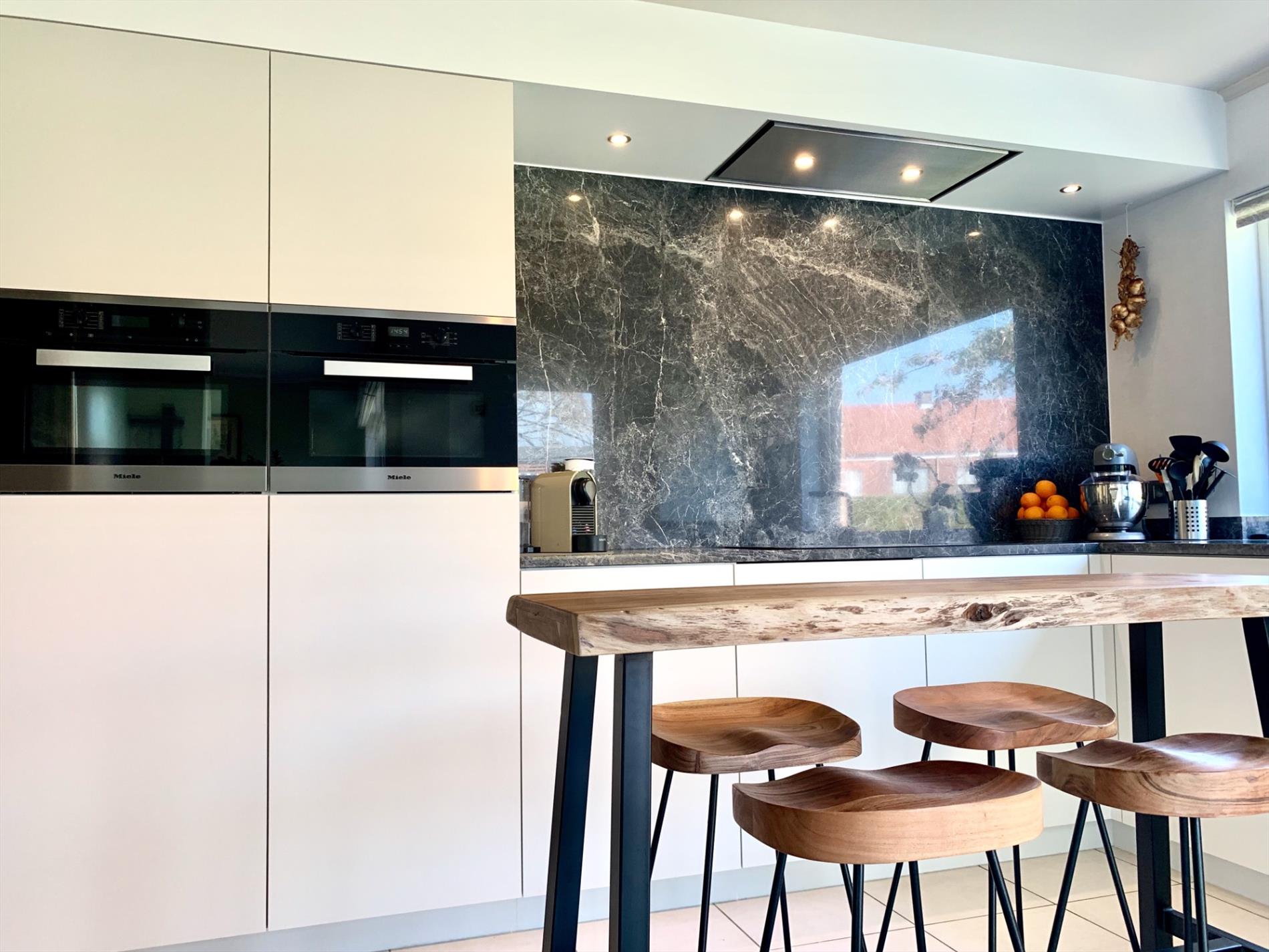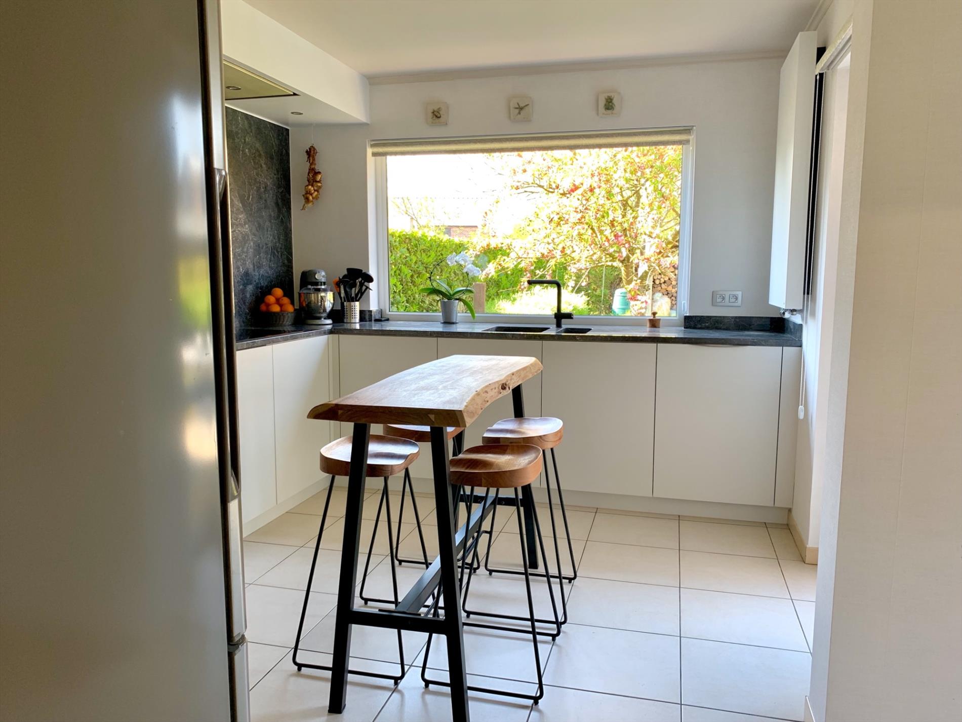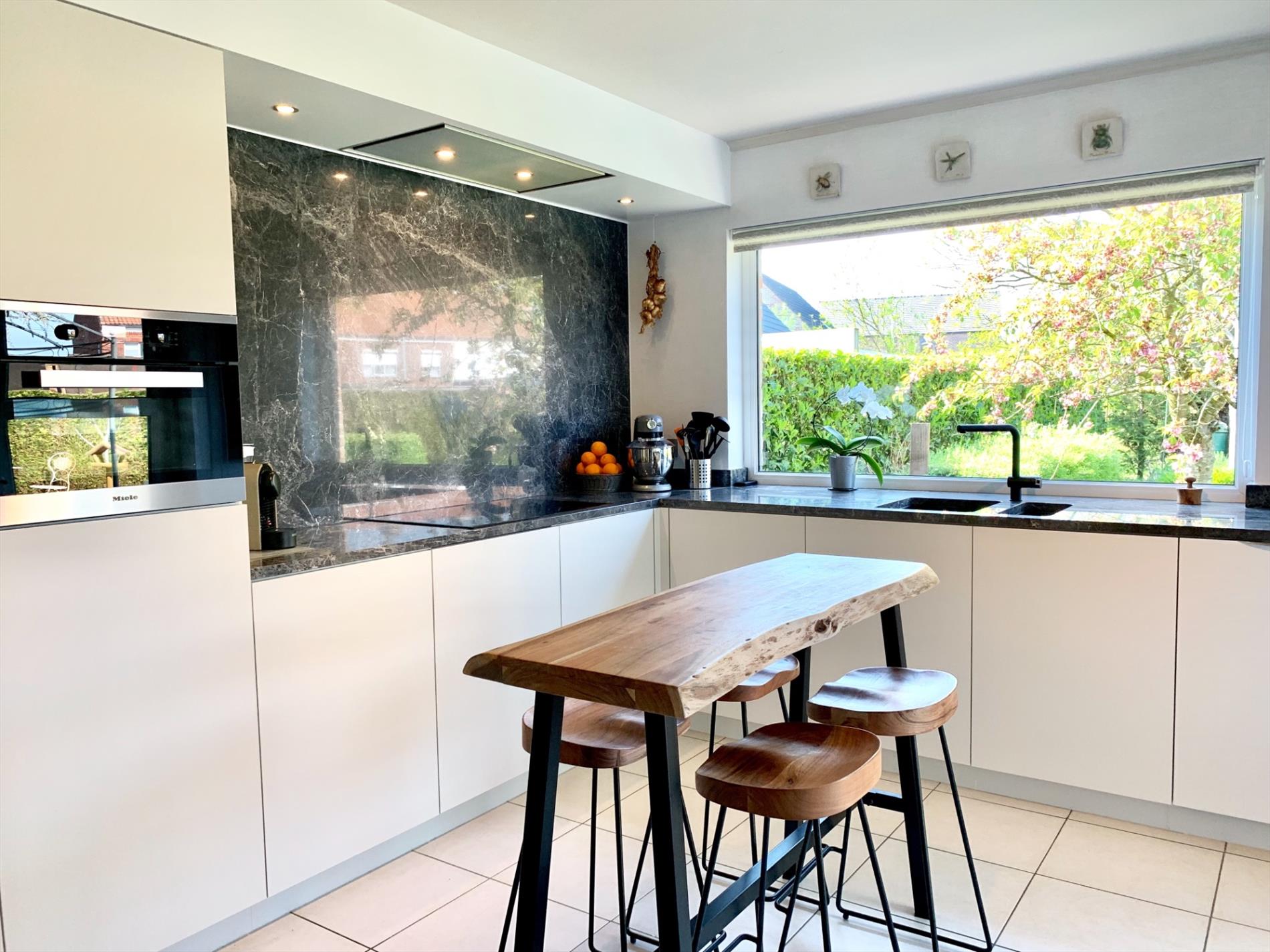 In de inkomhal bevindt zich het gastentoilet. De lichtrijke woonkamer heeft de hele dag door zon door de vele glaspartijen. Het absolute pareltje in deze woning is de magnifieke open keuken, deze is nog maar sinds vorig jaar geplaatst en bevat alle nodige toestellen. Ook de marmeren wand en werkblad, incl de ingebouwde spots zijn zeker een troef. De keuken is van hoogwaardige kwaliteit. Zowel van in de living als van hieruit kan u naar buiten. Aansluitend is een praktische ruime berging met ingemaakte kasten en loopt u door naar de garage.