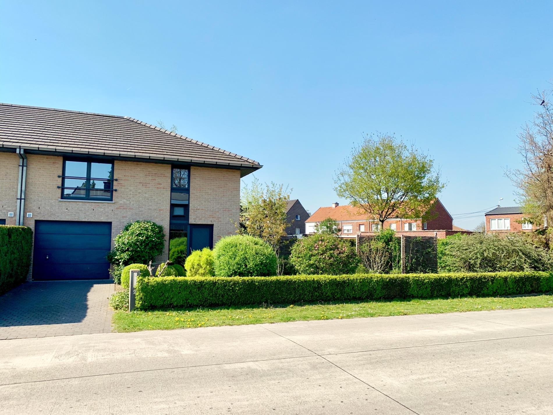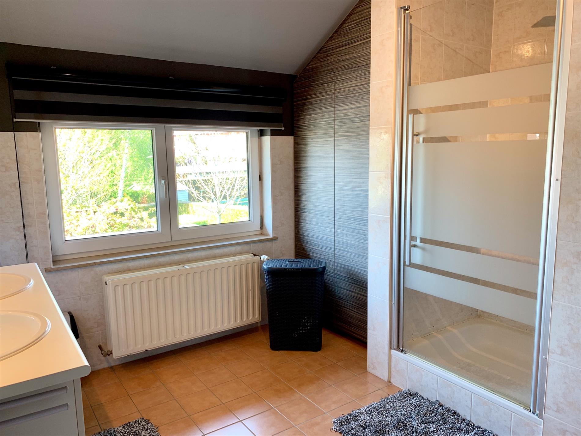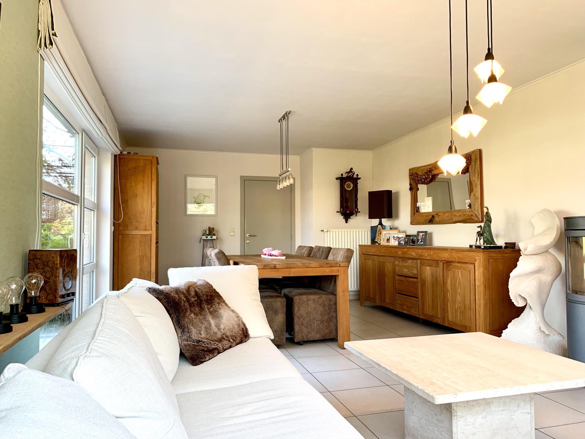 In de inkomhal bevindt zich het gastentoilet. De lichtrijke woonkamer heeft de hele dag door zon door de vele glaspartijen. Het absolute pareltje in deze woning is de magnifieke open keuken, deze is nog maar sinds vorig jaar geplaatst en bevat alle nodige toestellen. Ook de marmeren wand en werkblad, incl de ingebouwde spots zijn zeker een troef. De keuken is van hoogwaardige kwaliteit. Zowel van in de living als van hieruit kan u naar buiten. Aansluitend is een praktische ruime berging met ingemaakte kasten en loopt u door naar de garage.