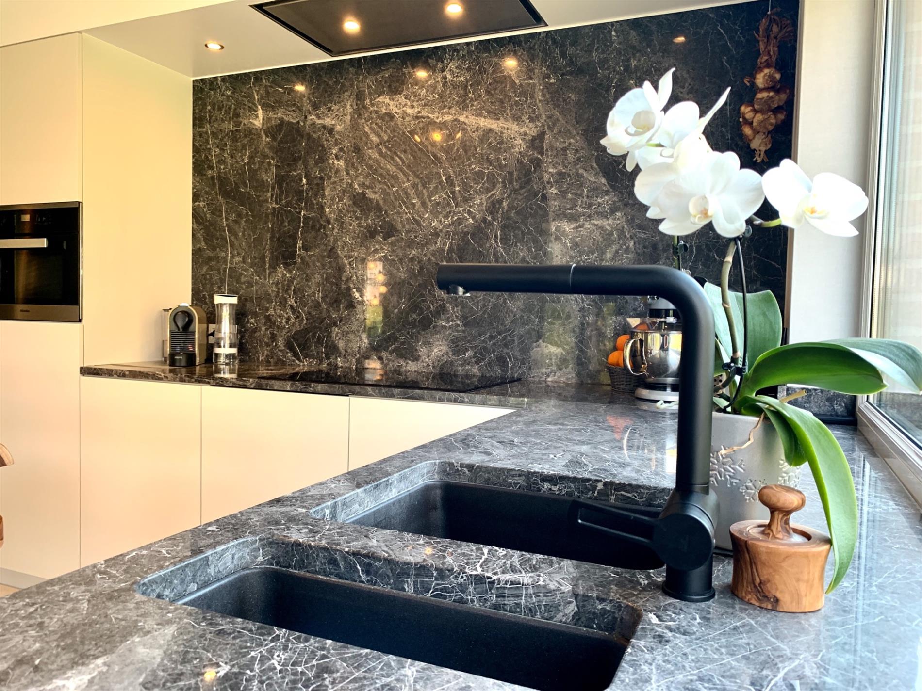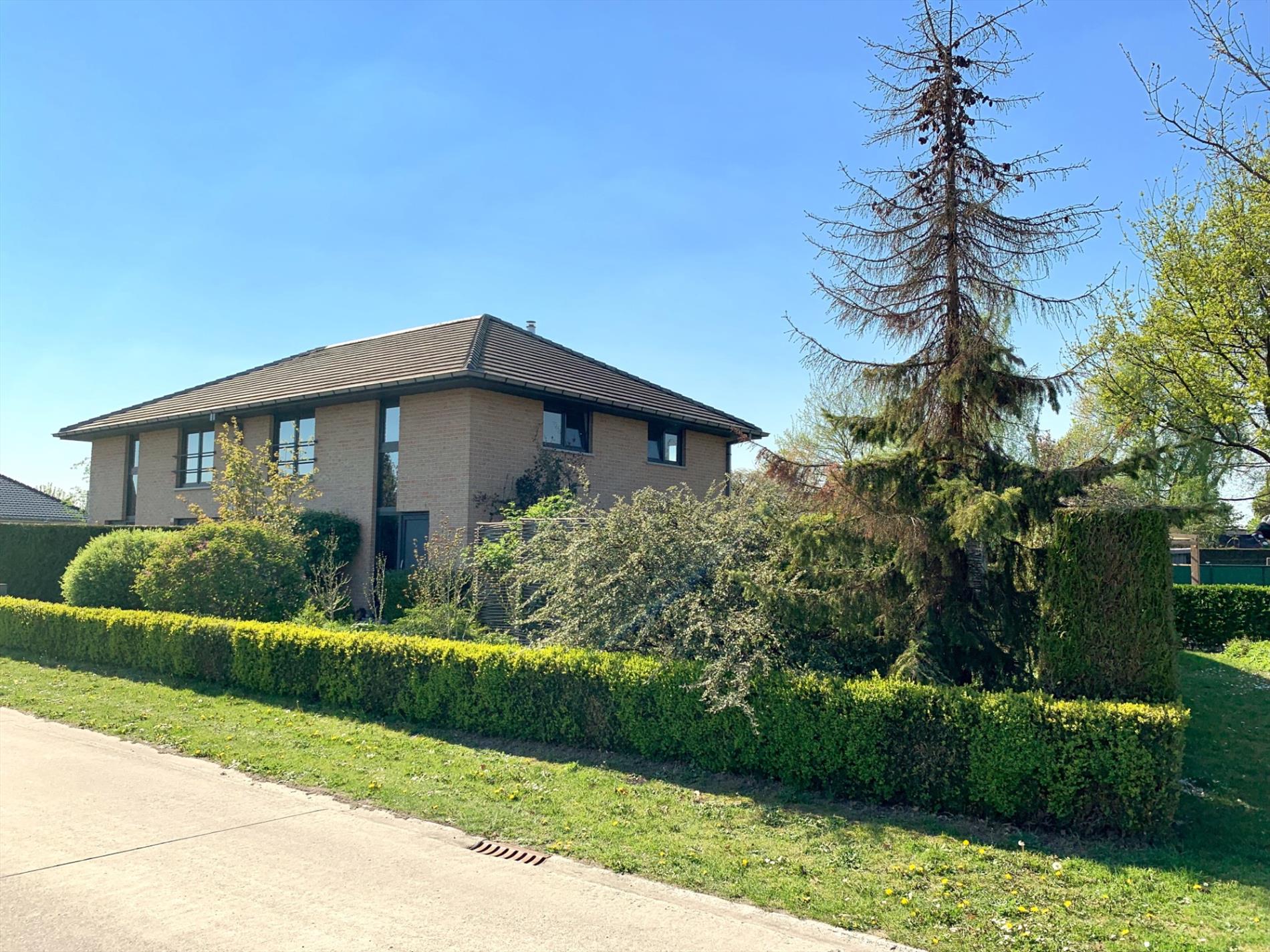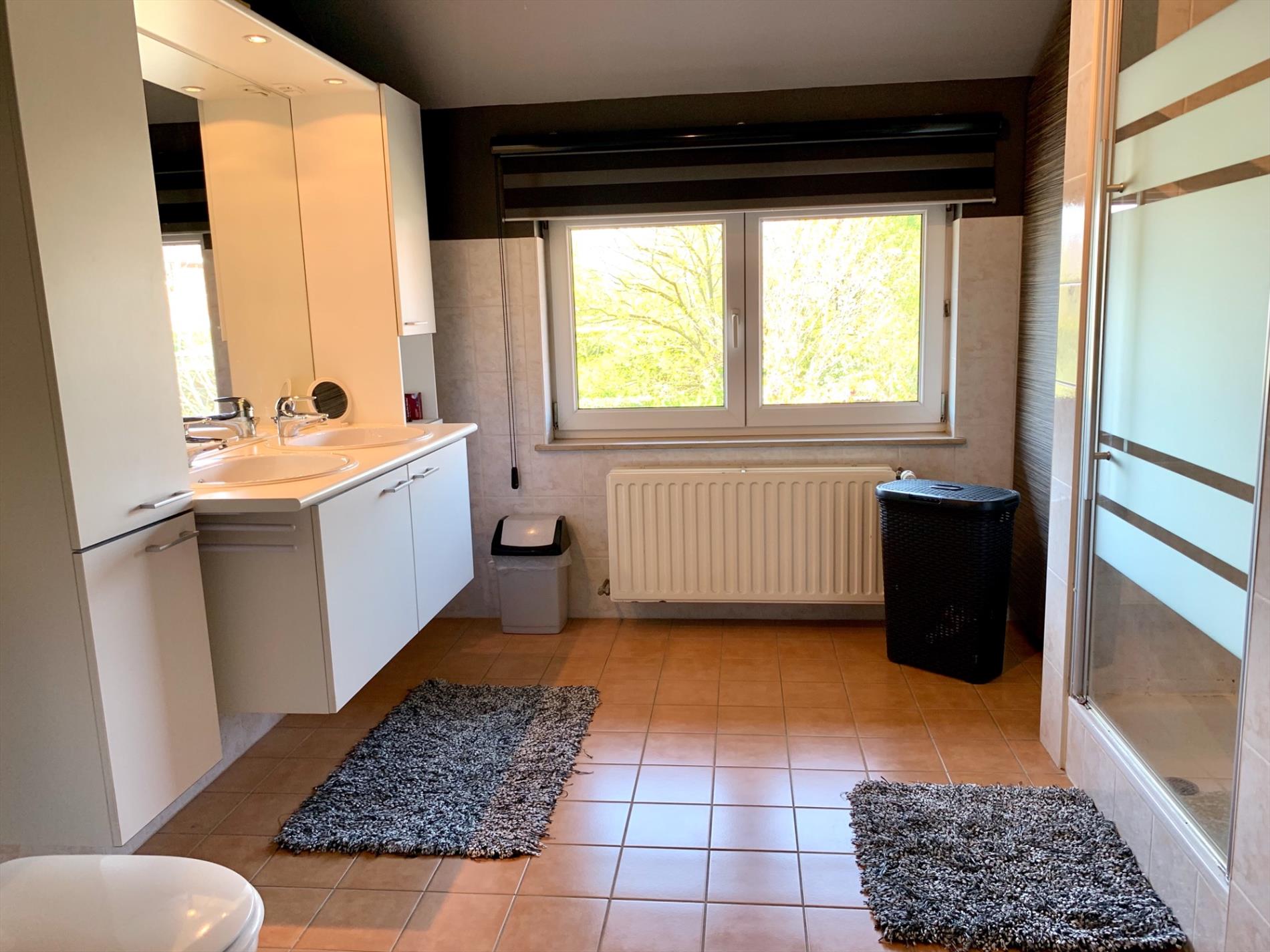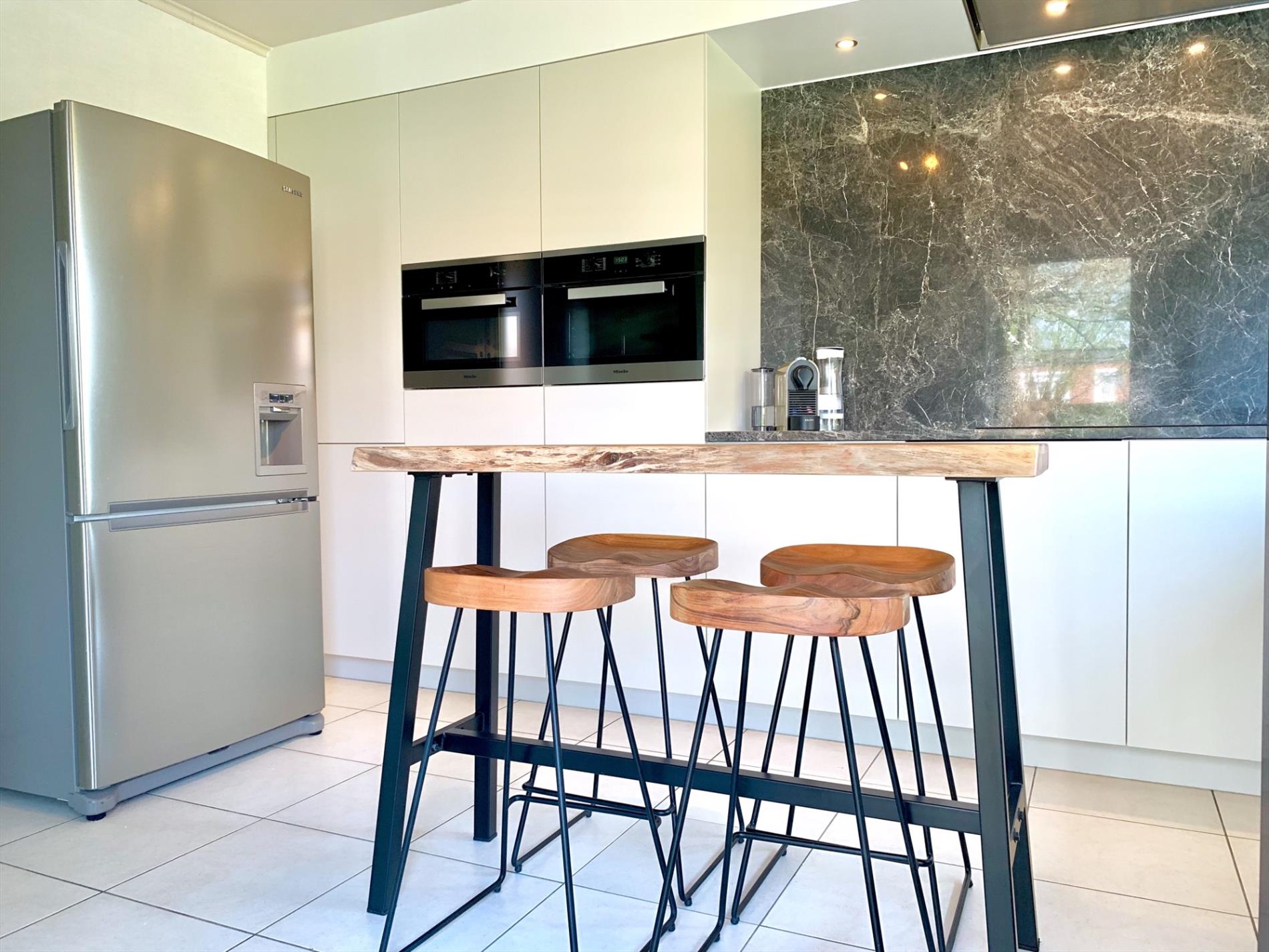 In de inkomhal bevindt zich het gastentoilet. De lichtrijke woonkamer heeft de hele dag door zon door de vele glaspartijen. Het absolute pareltje in deze woning is de magnifieke open keuken, deze is nog maar sinds vorig jaar geplaatst en bevat alle nodige toestellen. Ook de marmeren wand en werkblad, incl de ingebouwde spots zijn zeker een troef. De keuken is van hoogwaardige kwaliteit. Zowel van in de living als van hieruit kan u naar buiten. Aansluitend is een praktische ruime berging met ingemaakte kasten en loopt u door naar de garage.