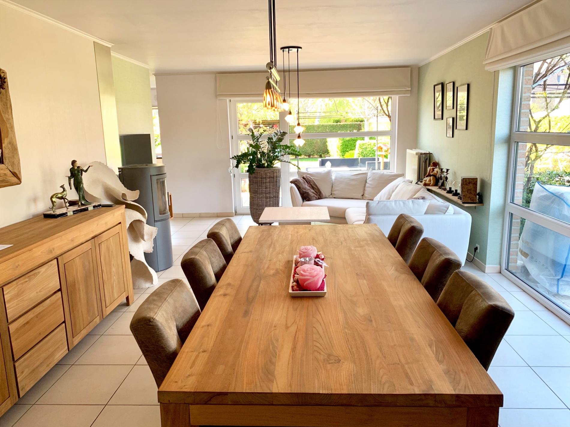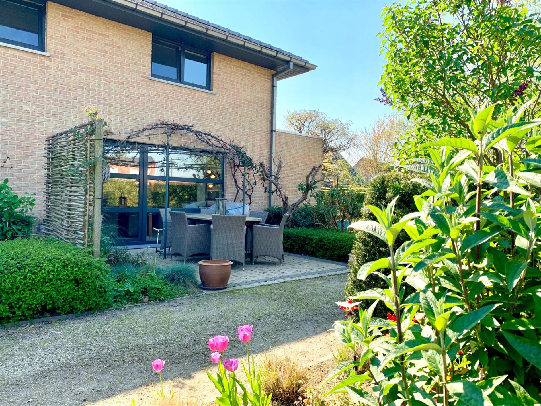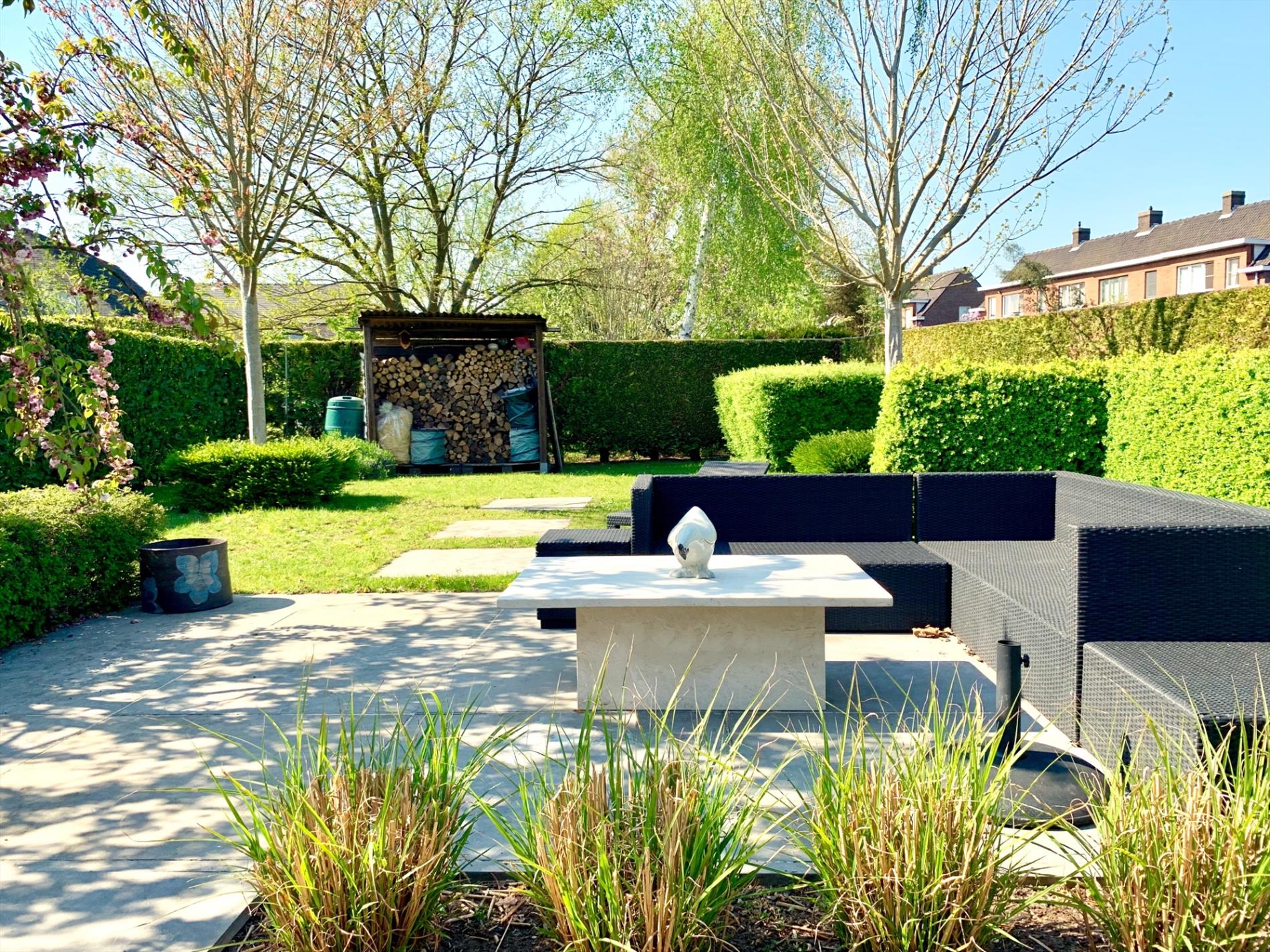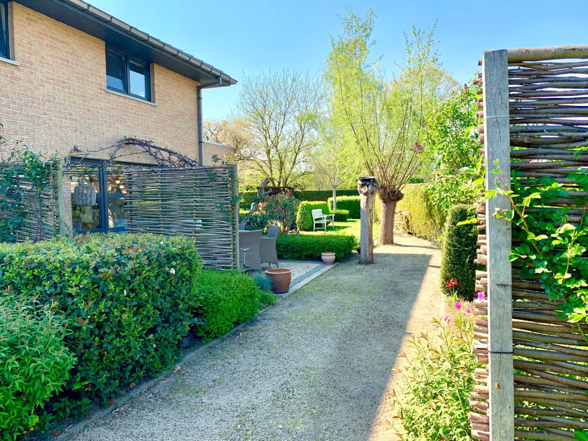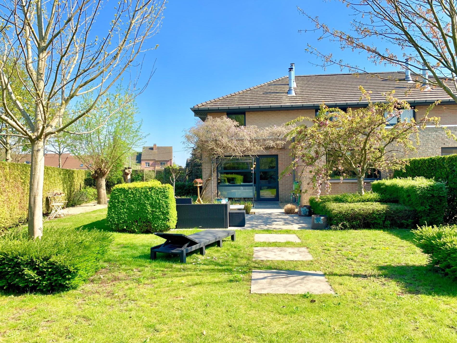 Buiten kan u genieten van 2 terrassen waar u altijd ofwel zon,ofwel schaduw heeft. De fraai aangelegde grote tuin is een bloemenpracht en een absolute meerwaarde.