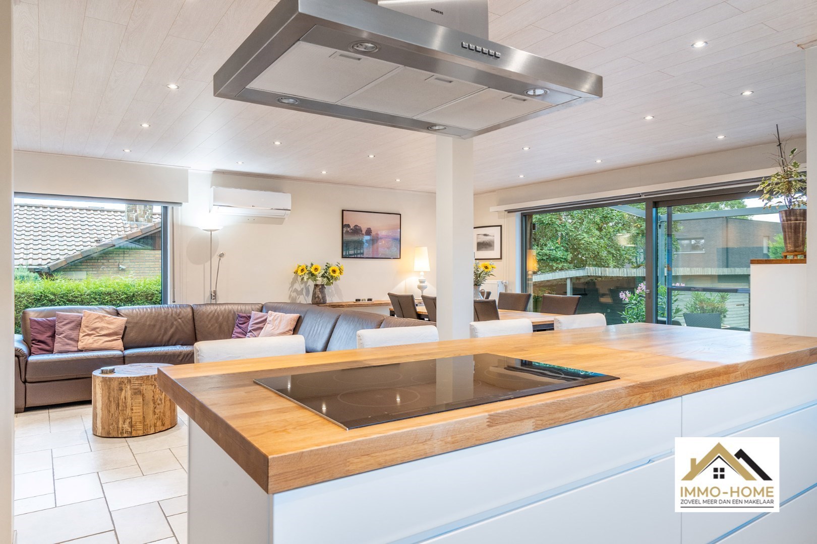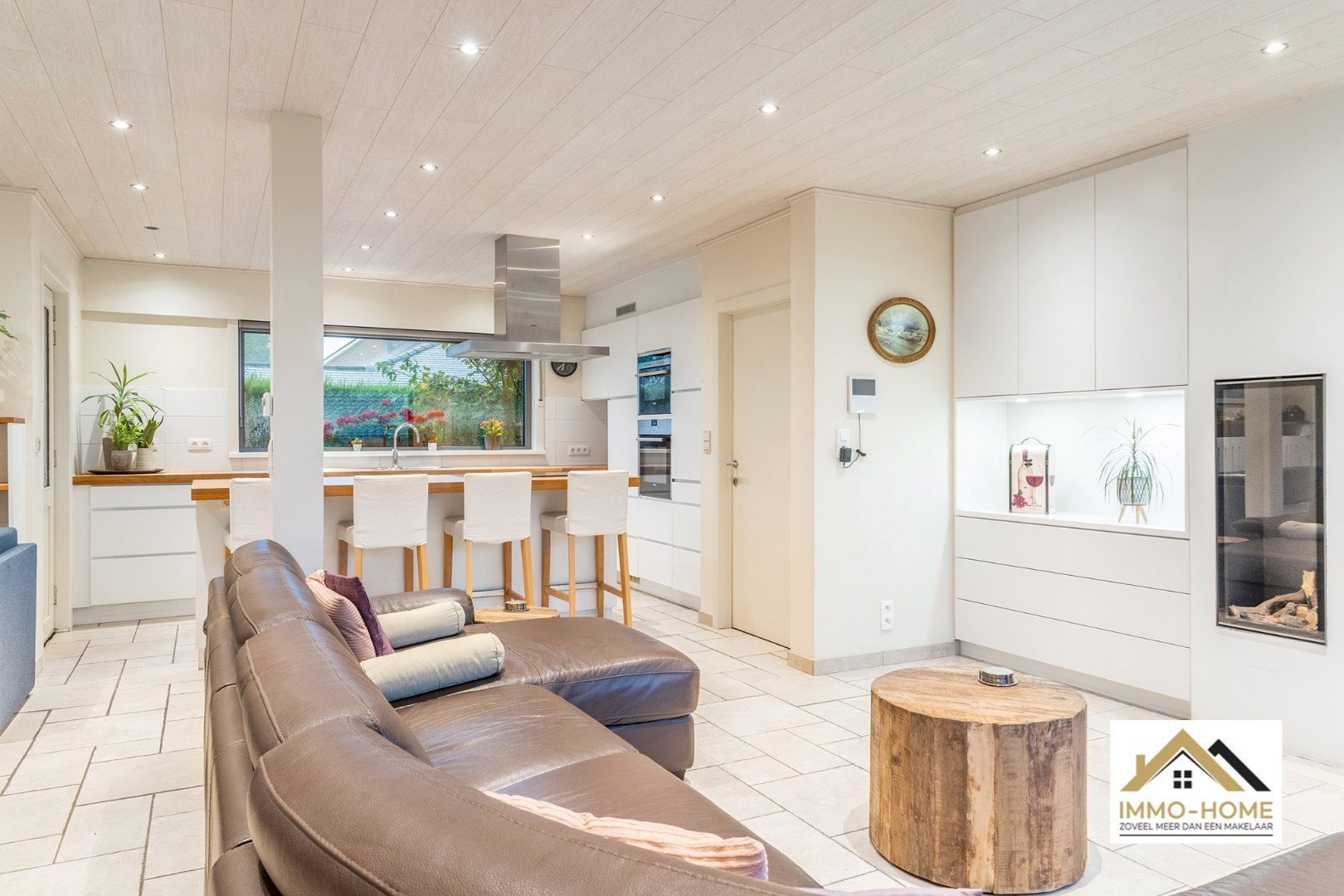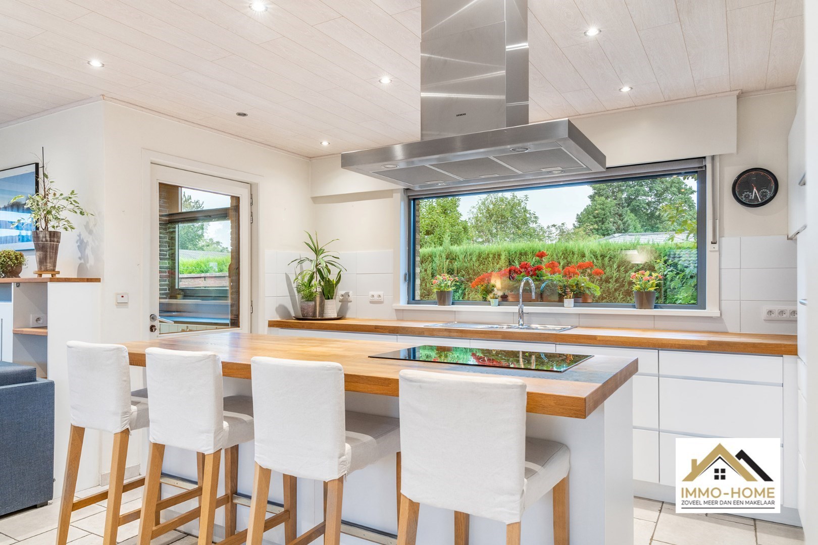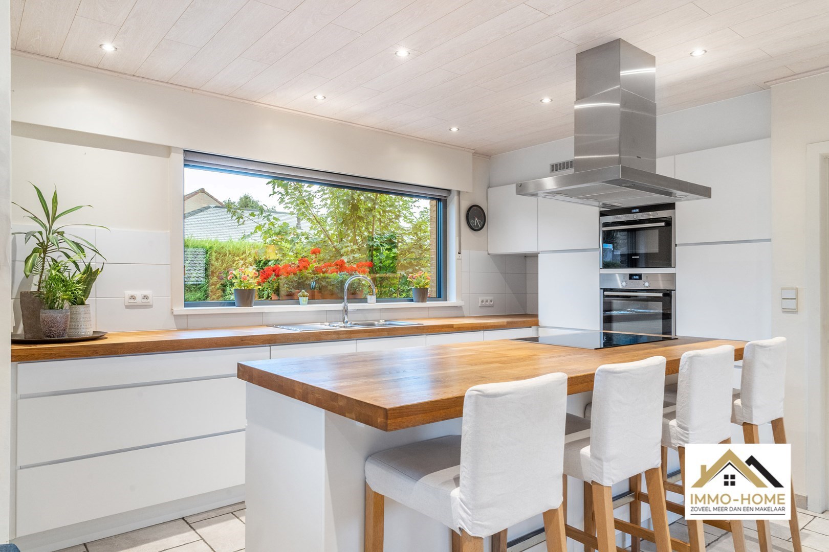 Schrijf u inVia de statige inkomhal, die je bereikt aan de rechterkant van het pand, kom je tot in alle ruimtes van deze zeer rustig gelegen woning. De grote open leefruimte met open keuken heeft een heel aangenaam gevoel, onder andere door de vele raampartijen. Het ruime overdekte terras (met automatische sluiting) bereik je via zowel het grote schuifraam als via een aparte deur aan de keuken. In de doorgang is een kleine buitenkeuken beschikbaar. De keuken zelf is voorzien van alle moderne comfort, en het grote kookeiland neemt een prominente plaats in. De vele extra kastruimte is uiteraard mooi meegenomen. De maatwerkkasten met ingemaakte haard zorgen voor extra sfeer in de zithoek. Via de half-verhoogde overloop bereik je de drie mooie slaapkamers en de badkamer. Eén slaapkamer beschikt bovendien over een en-suite badkamer met eigen toilet. Onderaan de woning is er voorzien in een grote wasplaats/berging (met toegang tot de tuin) en bureel. De woning beschikt over een garage voor één wagen (terwijl er op de oprit plaats is voor meerdere wagens) en bijkomende extra opbergruimte. Die is er ook in het tuinhuis, waar je onder het aansluitende afdak nog een extra gezellige zithoek hebt. Je voorziet in je eigen energie met de 40 zonnepanelen, en in de belangrijkste ruimtes is er airco. Inschrijvingen via mail naar tommy@immo-home.be, geen telefonische inschrijvingen! Volg ons op Fb en insta. Voor meer info: www.immo-home.be