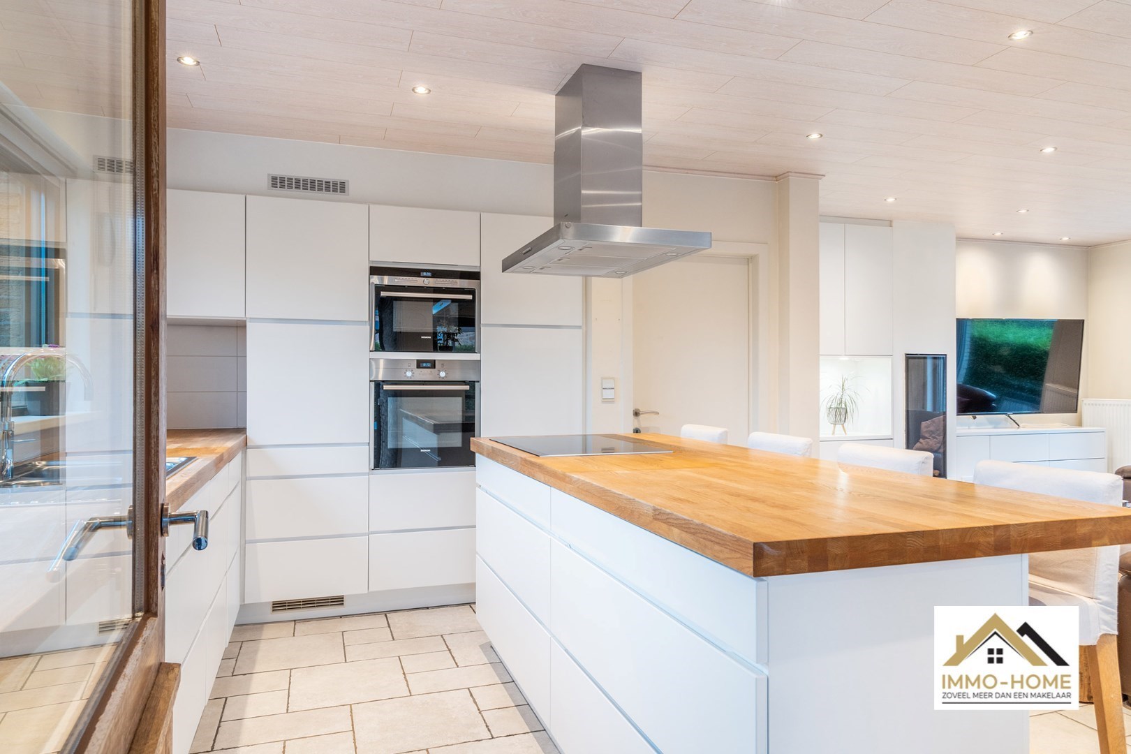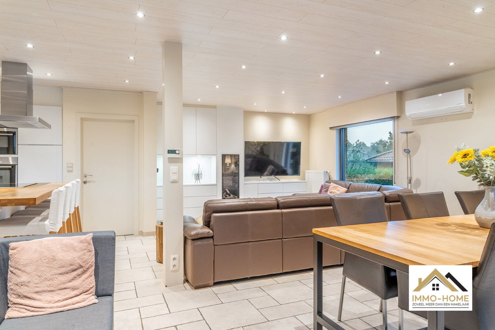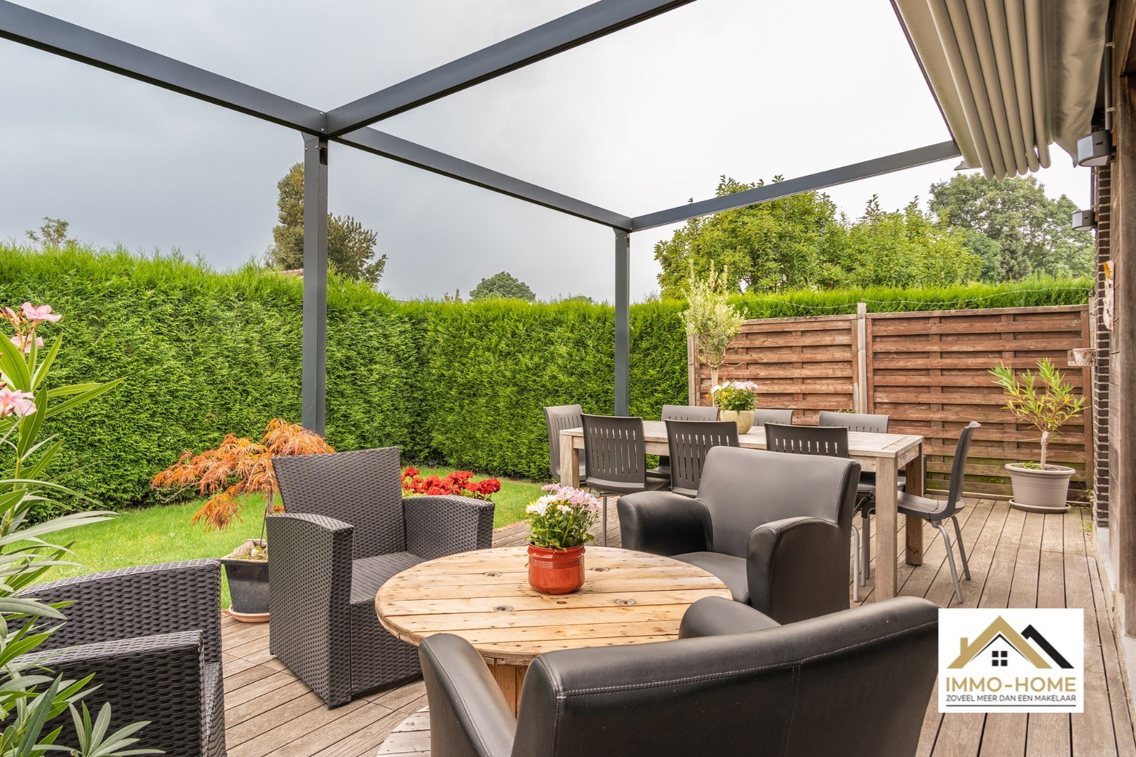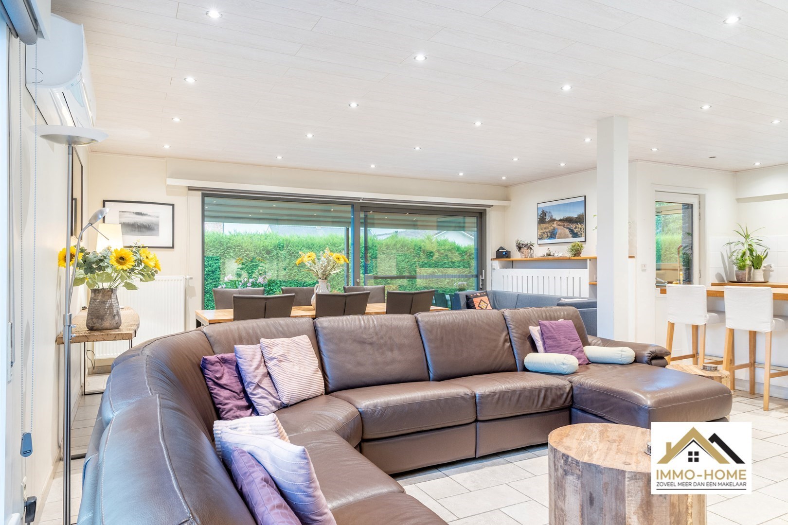 Schrijf u inVia de statige inkomhal, die je bereikt aan de rechterkant van het pand, kom je tot in alle ruimtes van deze zeer rustig gelegen woning. De grote open leefruimte met open keuken heeft een heel aangenaam gevoel, onder andere door de vele raampartijen. Het ruime overdekte terras (met automatische sluiting) bereik je via zowel het grote schuifraam als via een aparte deur aan de keuken. In de doorgang is een kleine buitenkeuken beschikbaar. De keuken zelf is voorzien van alle moderne comfort, en het grote kookeiland neemt een prominente plaats in. De vele extra kastruimte is uiteraard mooi meegenomen. De maatwerkkasten met ingemaakte haard zorgen voor extra sfeer in de zithoek. Via de half-verhoogde overloop bereik je de drie mooie slaapkamers en de badkamer. Eén slaapkamer beschikt bovendien over een en-suite badkamer met eigen toilet. Onderaan de woning is er voorzien in een grote wasplaats/berging (met toegang tot de tuin) en bureel. De woning beschikt over een garage voor één wagen (terwijl er op de oprit plaats is voor meerdere wagens) en bijkomende extra opbergruimte. Die is er ook in het tuinhuis, waar je onder het aansluitende afdak nog een extra gezellige zithoek hebt. Je voorziet in je eigen energie met de 40 zonnepanelen, en in de belangrijkste ruimtes is er airco. Inschrijvingen via mail naar tommy@immo-home.be, geen telefonische inschrijvingen! Volg ons op Fb en insta. Voor meer info: www.immo-home.be