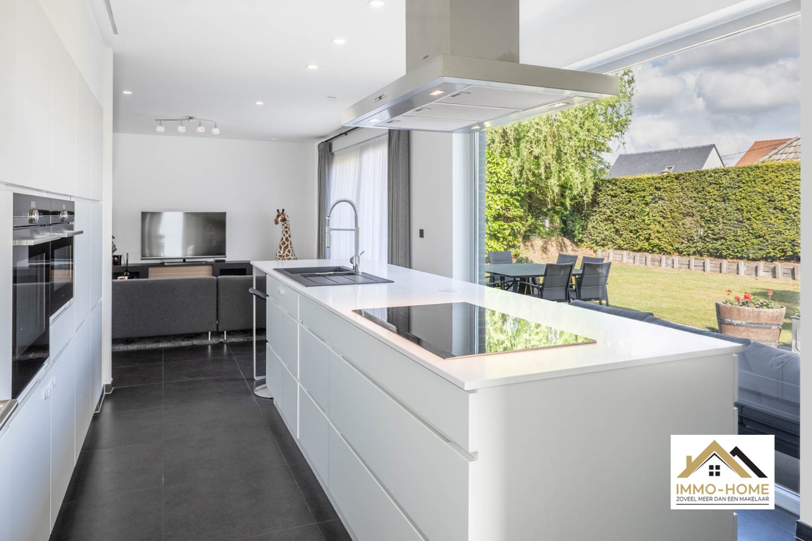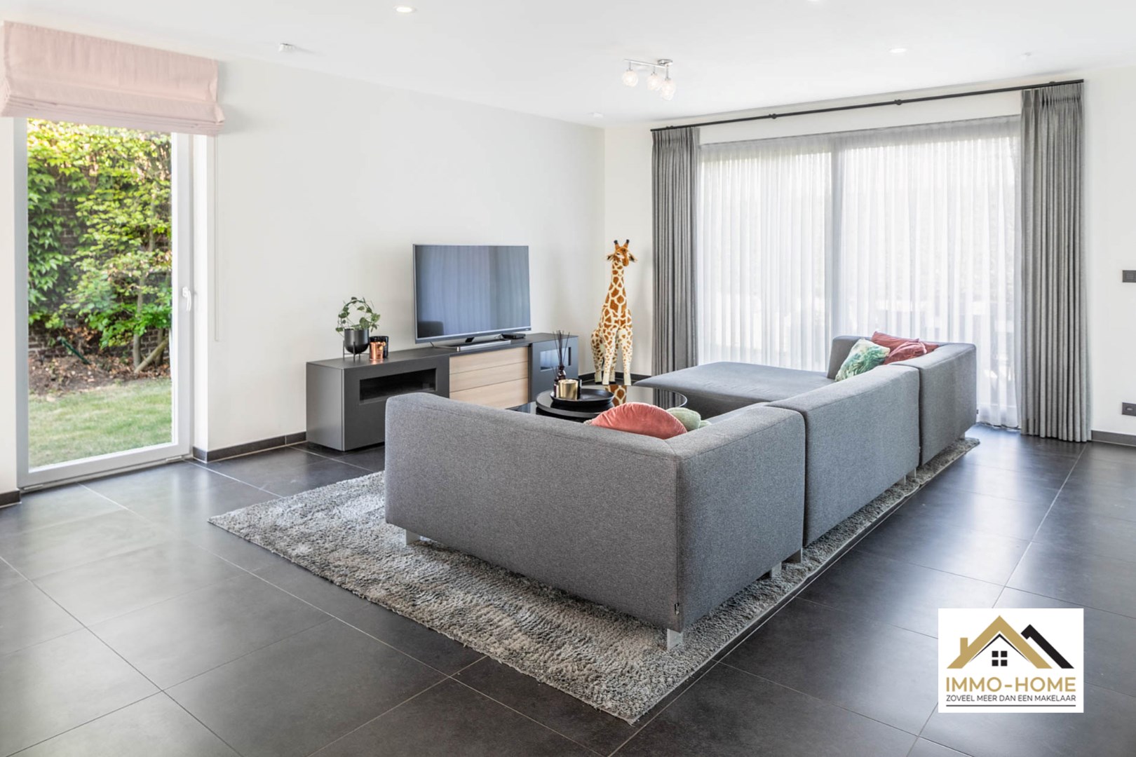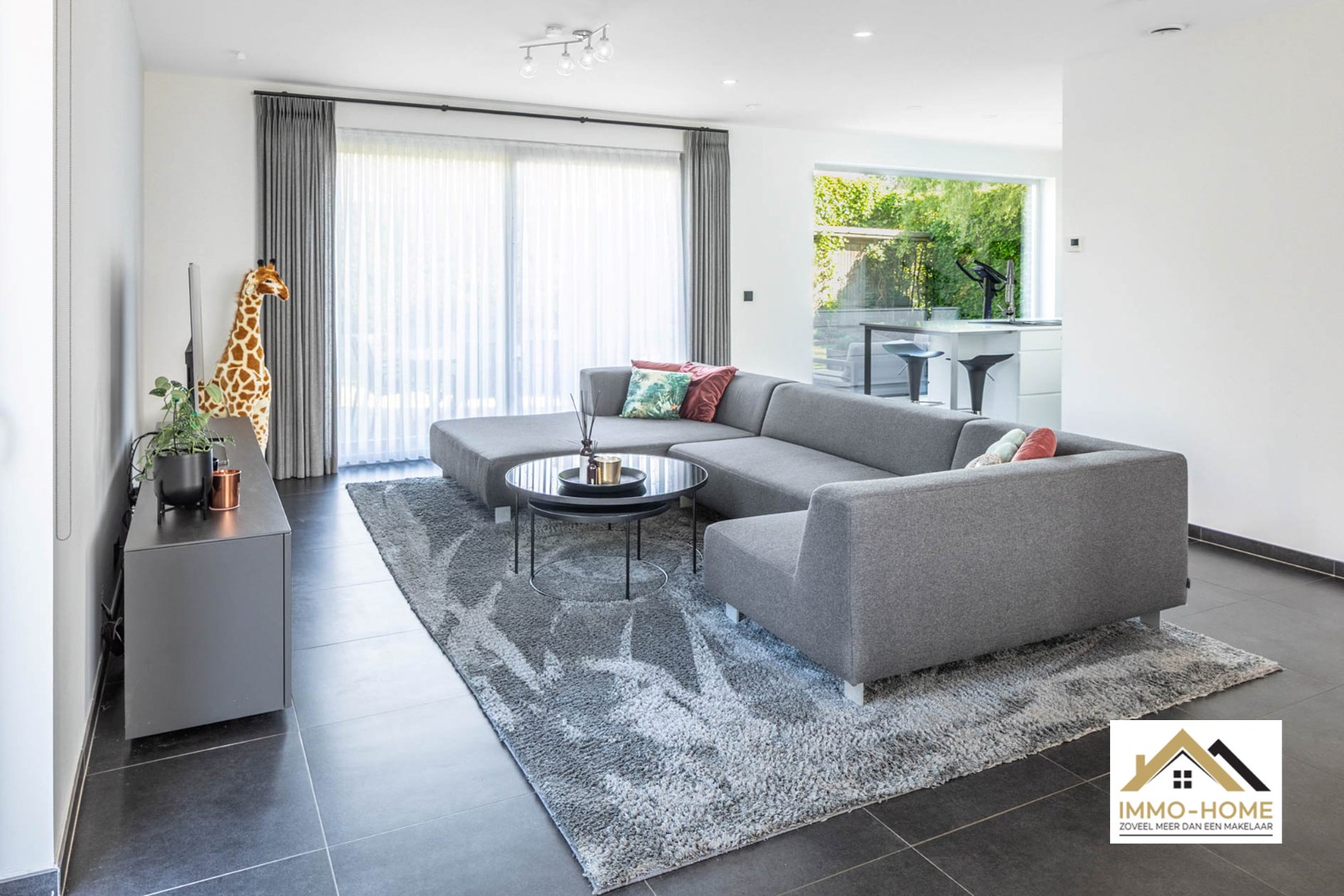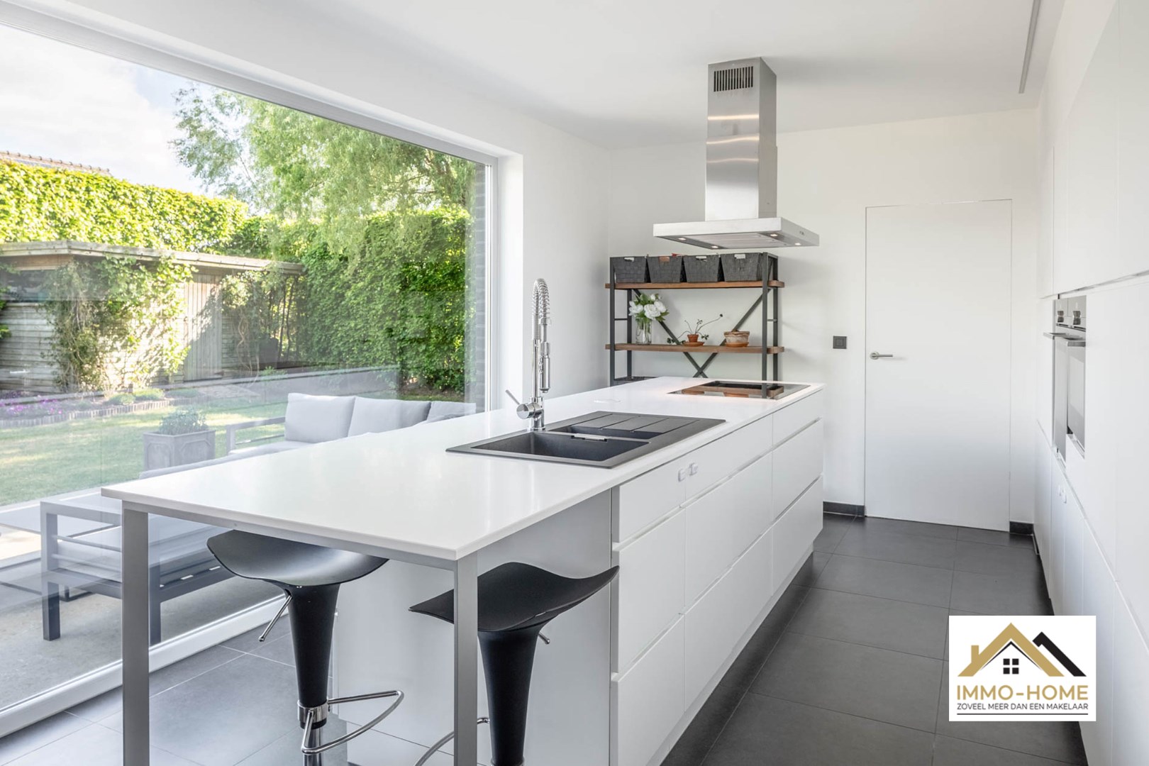 Bij het betreden van de woning kom je terecht in een lichtrijke inkomhal met gastentoilet en trap naar boven. De glazen deur geeft toegang tot de ruime leefruimte, waar grote raampartijen zorgen voor een aangename lichtinval doorheen de dag. De zwarte tegelvloer (vloerverwarming warmtepomp met passieve koeling) benadrukt het eigentijdse karakter van de woning en loopt door tot in de open keuken, die volledig uitgerust is met moderne toestellen en een centraal kookeiland. Vanuit de keuken kijk je uit op de tuin via een raam dat tot op de grond reikt, wat zorgt voor een mooi zicht en een vlotte connectie met het buitengebeuren.