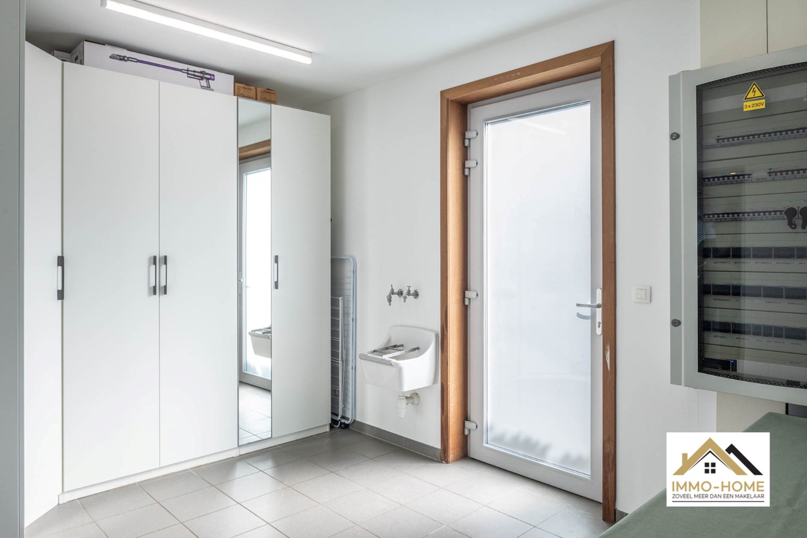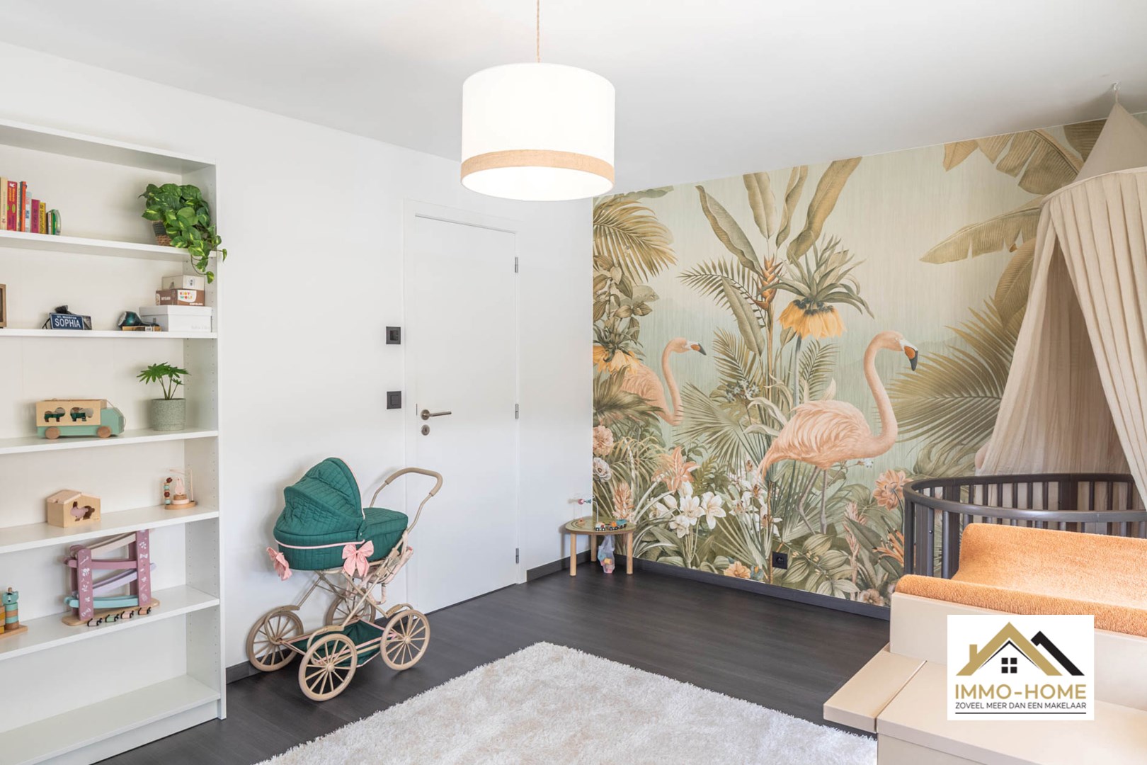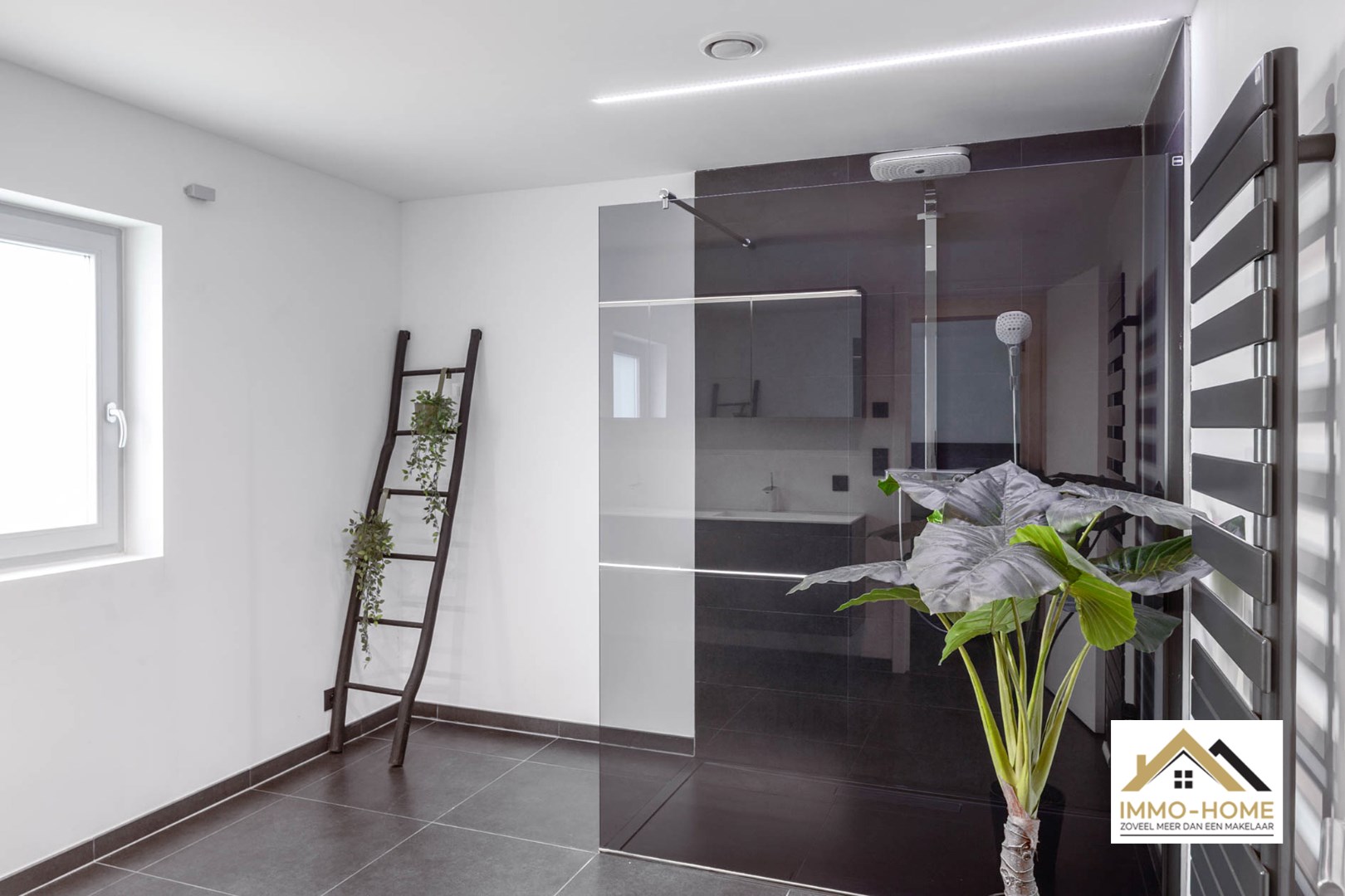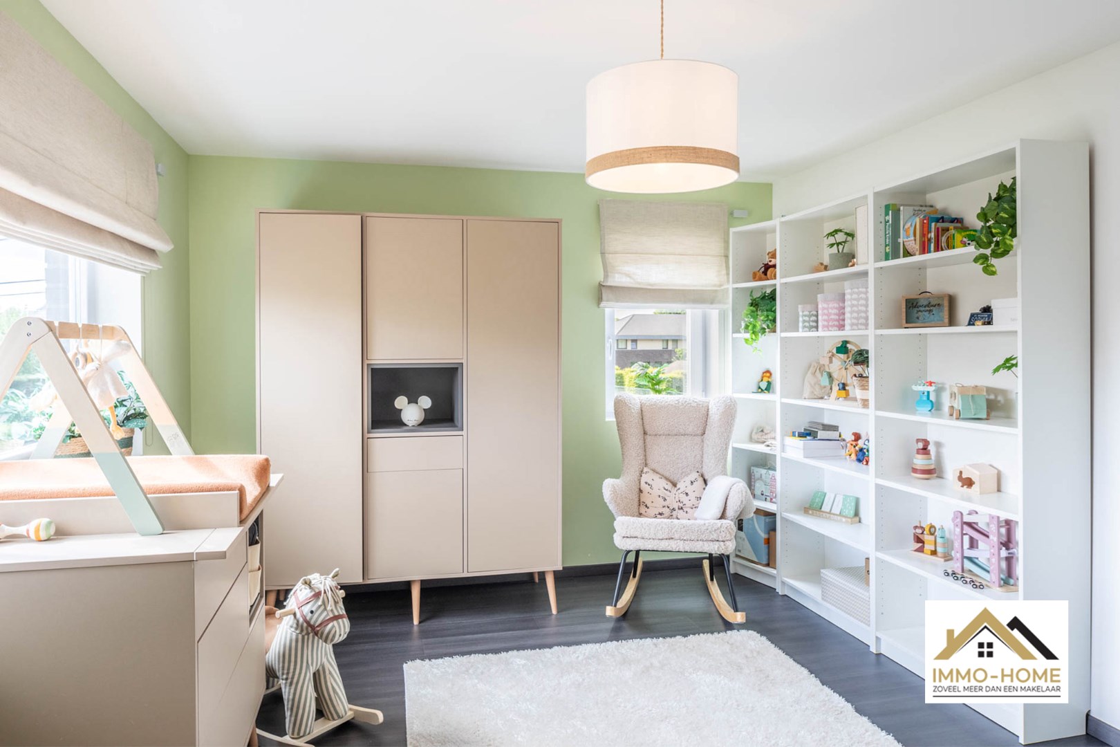 Aansluitend bevindt zich een ruime berging, slim opgedeeld in twee functionele zones, met directe toegang tot de tuin. Op de eerste verdieping zijn er drie grote slaapkamers, waarvan één met een ingebouwde dressing. De badkamer is modern ingericht met een inloopdouche met glazen wand en een dubbel lavabomeubel. Ook op deze verdieping zijn een afzonderlijk toilet en een bergruimte voorzien.