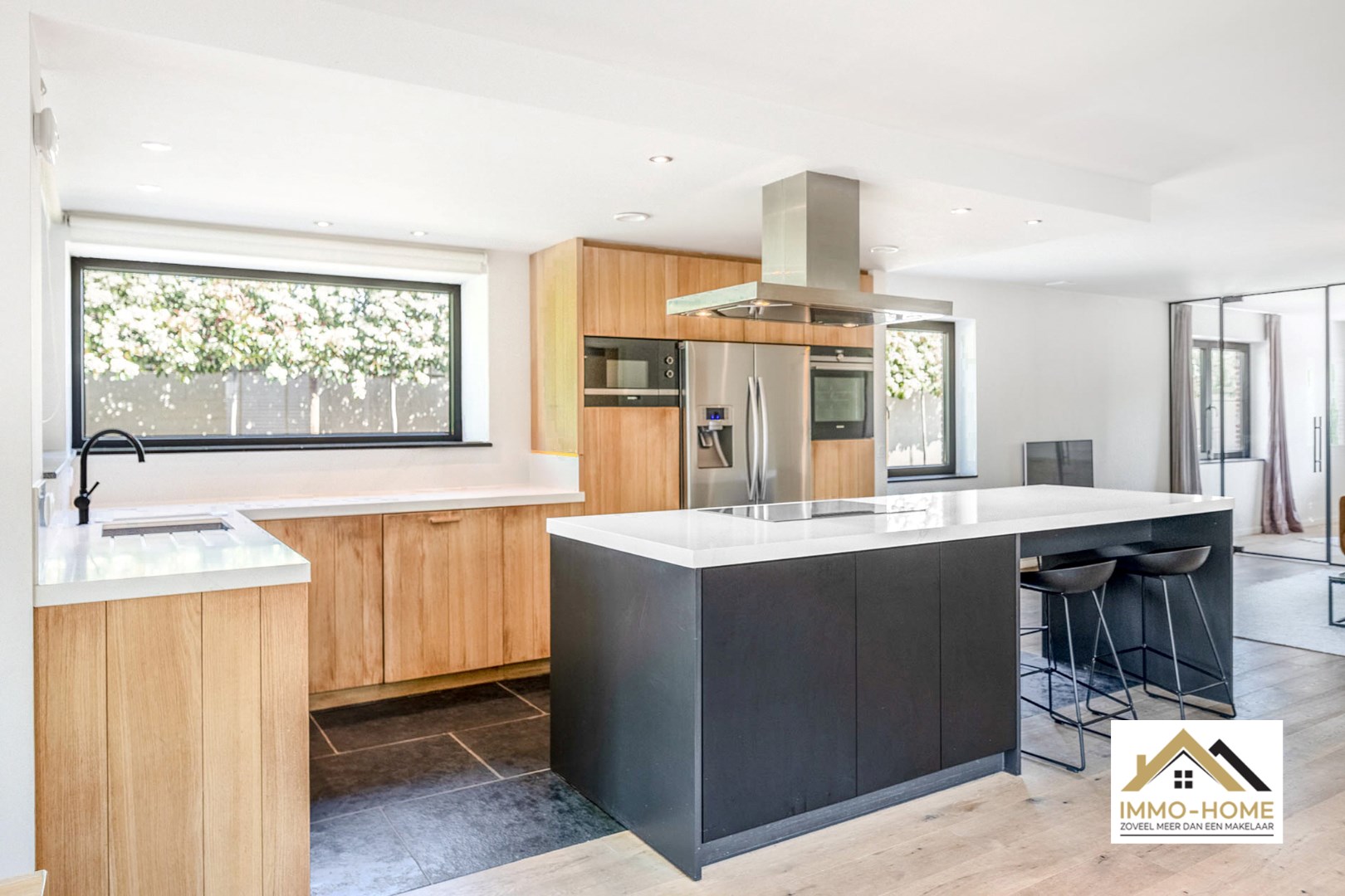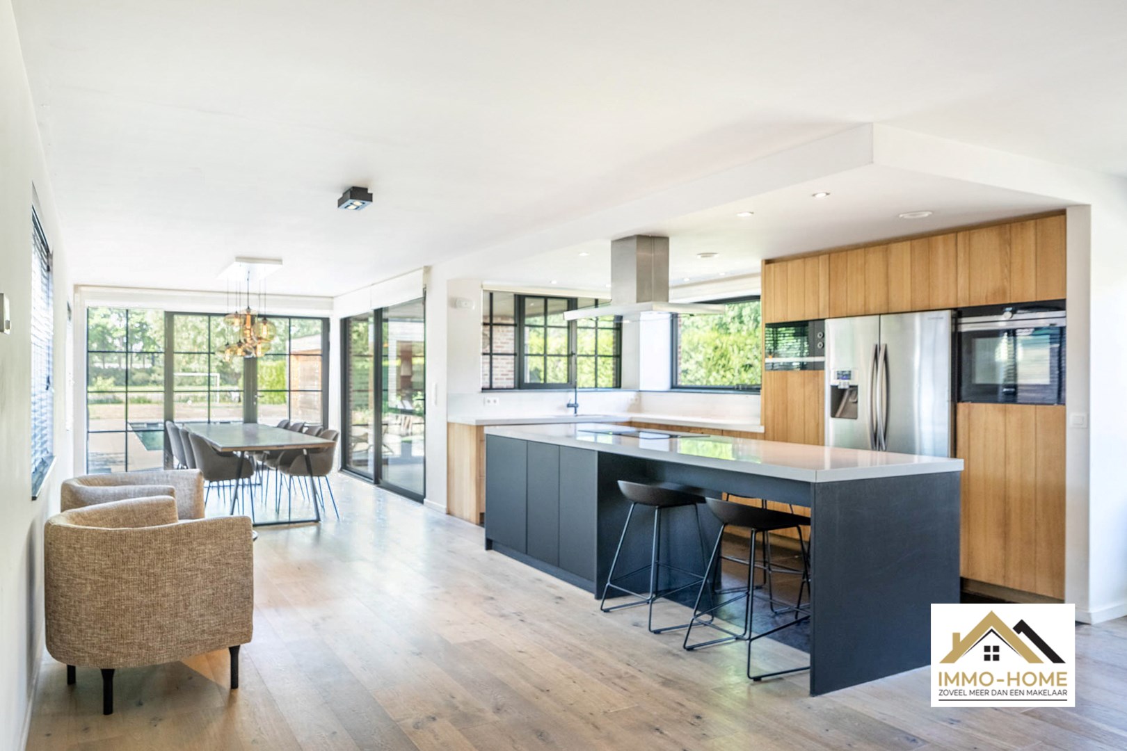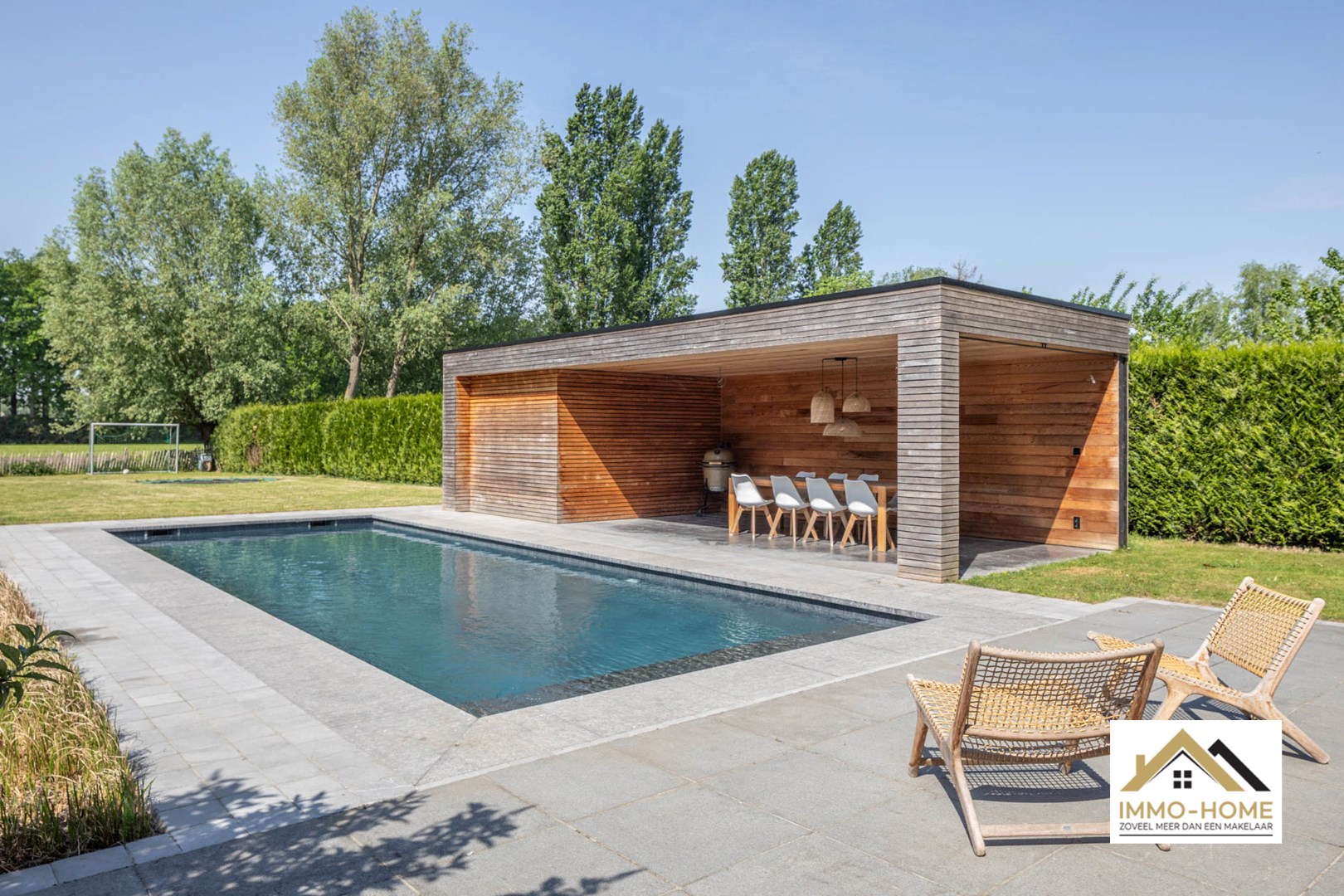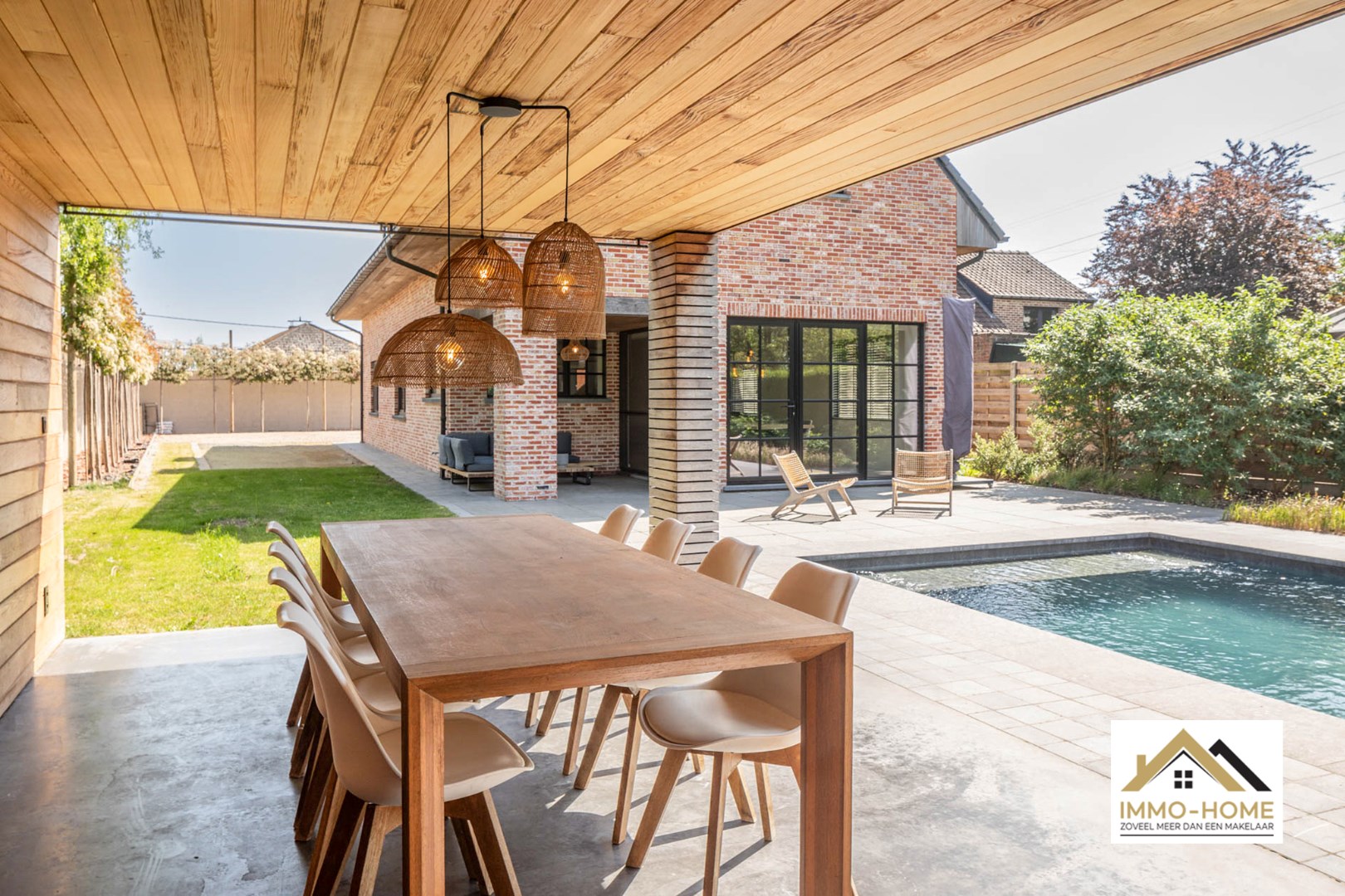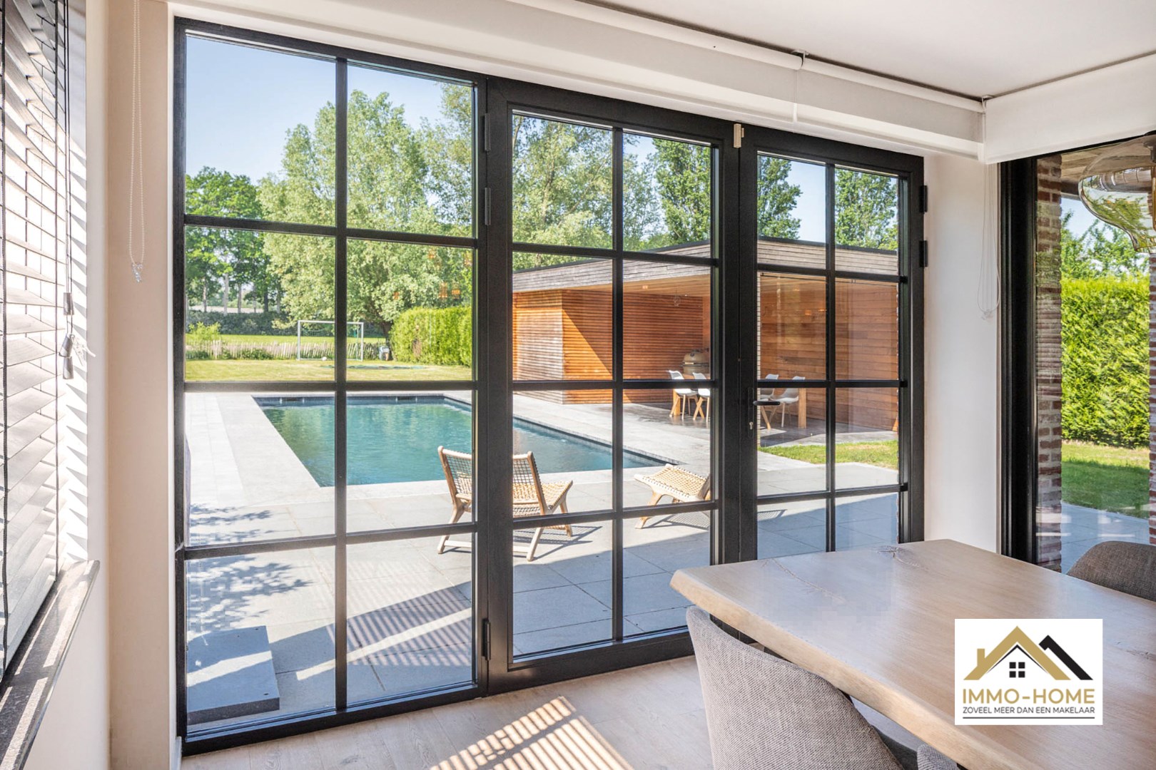 Schrijf u inIn het landelijke Lochristi, verscholen op een tweede bouwlijn, bevindt zich deze stijlvolle villa die onmiddellijk charmeert door de uitzonderlijke privacy en rust. Bij het betreden via een gemeenschappelijke weg van het domein voel je meteen de sereniteit en ruimte die deze eigendom te bieden heeft. De royale inkomhal met hoge traphal vormt het hart van de woning en geeft via elegante stalen glazen deuren toegang tot zowel de leefruimte als het bureau. Het bureau is ruim en praktisch ingericht, ideaal voor thuiswerk of rustige momenten. De leefruimte is licht en open, met een gezellige zithoek en een moderne, volledig uitgeruste keuken met centraal kookeiland. Aansluitend bevindt zich de eethoek, die uitkijkt op de tuin en het uitnodigende zwembad – een plek waar binnen en buiten naadloos in elkaar overvloeien. Vanuit de living bereik je een ruime wasplaats met doorgang naar de garage en de tuin, wat zorgt voor extra praktisch comfort. Op de bovenverdieping bevinden zich drie volwaardige slaapkamers, elk met grote ramen die zorgen voor een overvloed aan natuurlijk licht. Verder is er een apart toilet en een ruime badkamer met inloopdouche, ligbad en dubbel lavabomeubel. De masterbedroom bevindt zich in een afzonderlijke vleugel, en beschikt over een royale dressing en een eigen badkamer met toilet, douche en dubbel lavabomeubel – een echte privé-oase. Buiten geniet je van een sfeervol overdekt terras, ideaal voor zwoele zomeravonden, én een ruim zonneterras met zicht op het prachtige zwembad. Het houten poolhouse biedt een gezellige plek om te genieten van bbq en gezellig tafelen en is voorzien van een berging voor zwembadonderhoud en tuingerief. De woning kijkt uit over de achterliggende akkers – een adembenemend decor dat je elke dag opnieuw tot rust brengt. Extra troeven zijn de petanquebaan, meerdere parkeerplaatsen op de oprit en de 20 zonnepanelen op het dak die bijdragen aan een duurzame energievoorziening. Een buitengewone woonbeleving dankzij de doordachte indeling, overvloedige lichtinval, luxueuze afwerking en unieke ligging in het groen. Inschrijven voor bezoekdag op zaterdag 24/05 via mail naar tommy@immo-home.be, geen telefonische inschrijvingen! Volg ons op Fb en Insta. Voor meer info: www.immo-home.be. GRATIS SCHATTING & GRATIS FINANCIEEL ADVIES