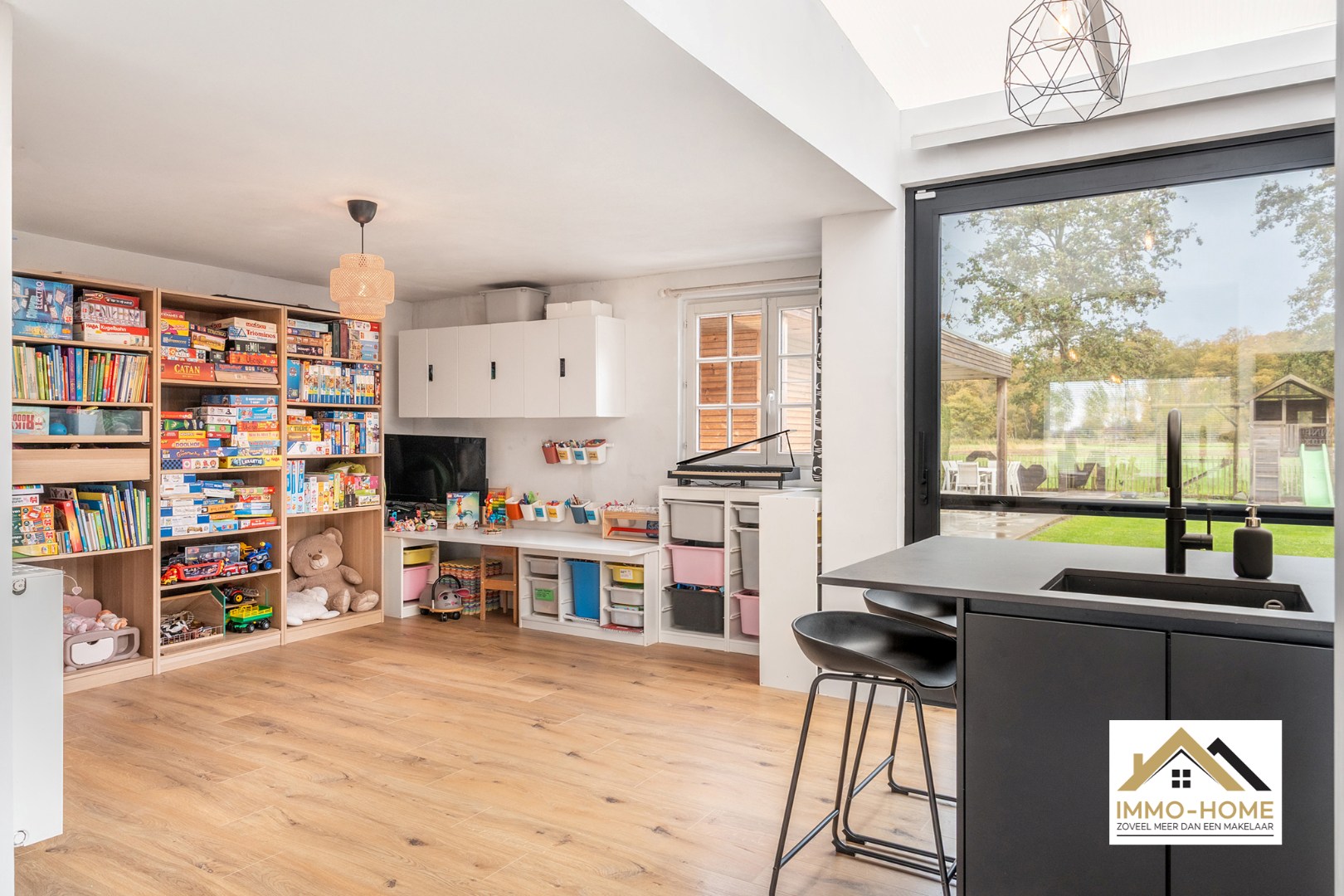 Op zoek naar een mooie instapklare woning in een groene omgeving? Zoek niet verder! De ruime inkomhal, voorzien van een vestiaire/berging, onthult meteen de eigenheid van dit pand: de inrichting is een smaakvolle combinatie van authentieke elementen en moderne accenten. De volledig open leefruimte bestaat uit een gezellige eet- en zithoek vooraan en een prachtige keuken achteraan. Het riante kookeiland vormt het hart van die keuken, maar het fenomenale uitzicht op de tuin en de achterliggende bossen van Puyenbroeck, zijn minstens even indrukwekkend. Dankzij de gevelbrede en hoge raampartij heb je directe toegang tot de tuin. Naast de keuken bevindt zich een ruime leefhoek die polyvalent kan ingezet worden, en een extra berging/opslagplaats. Ook de stijlvolle badkamer bevindt zich op het gelijkvloers. Het grote ligbad is een echte blikvanger, net als de riante inloopdouche met infraroodstraler. Op de eerste verdieping biedt de royale overloop, met ingewerkte dressing, toegang tot drie mooie slaapkamers en een extra sanitaire ruimte met extra berging. Bijkomende bergruimte is ook nog voorzien op zolder en in het ruime tuinhuis. In de tuin vinden we een gezellige lounge, van waaruit je geniet van het sublieme landschap. Tot slot voorzie je in je eigen energie dankzij de zonnepanelen op het dak van het tuinhuis. Bezoekdag: 15/11:Inschrijven via mail naar tommy@immo-home.be, geen telefonische inschrijvingen! Volg ons op Fb en Insta. Voor meer info: www.immo-home.be. GRATIS SCHATTING & GRATIS FINANCIEEL ADVIES