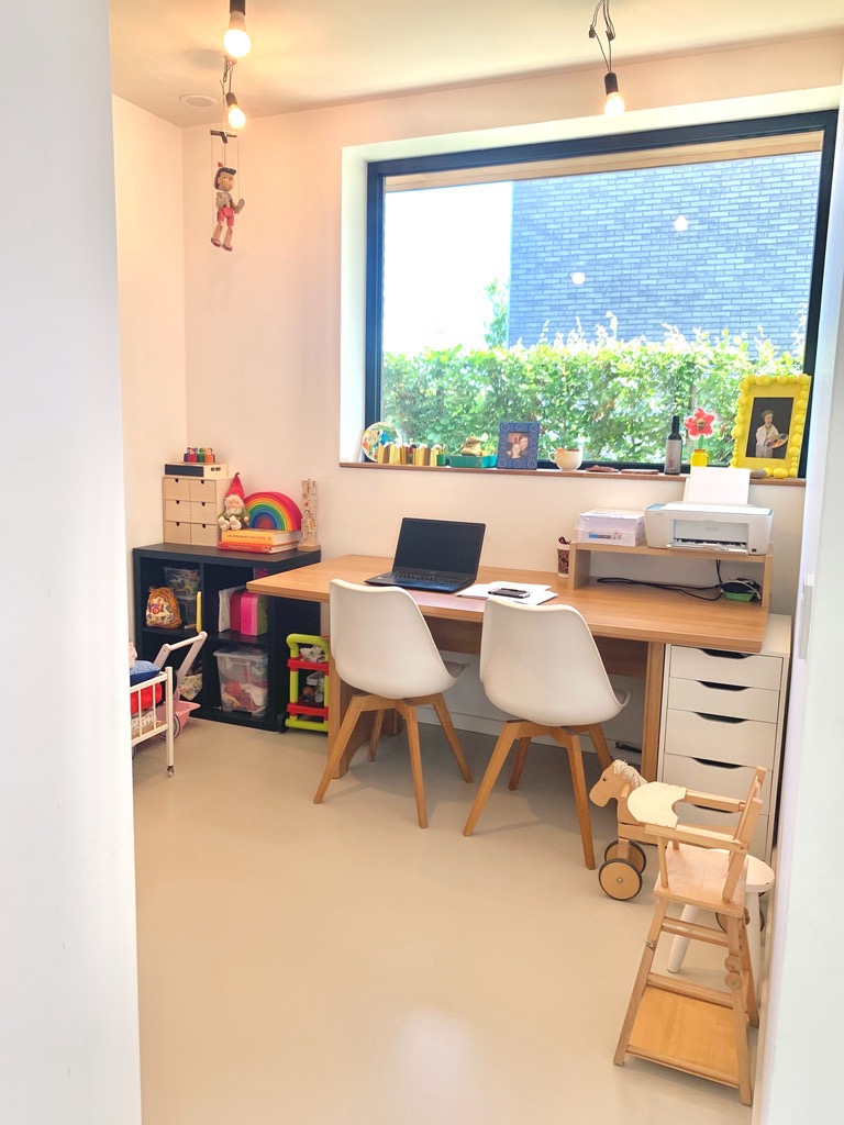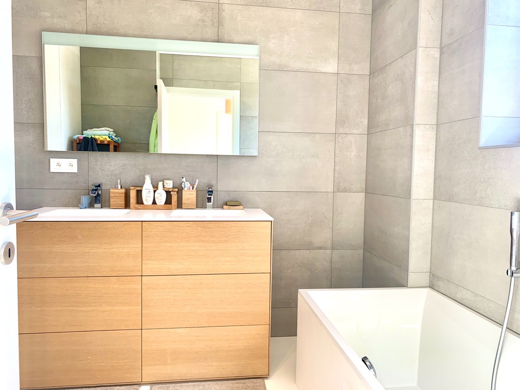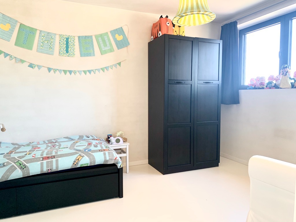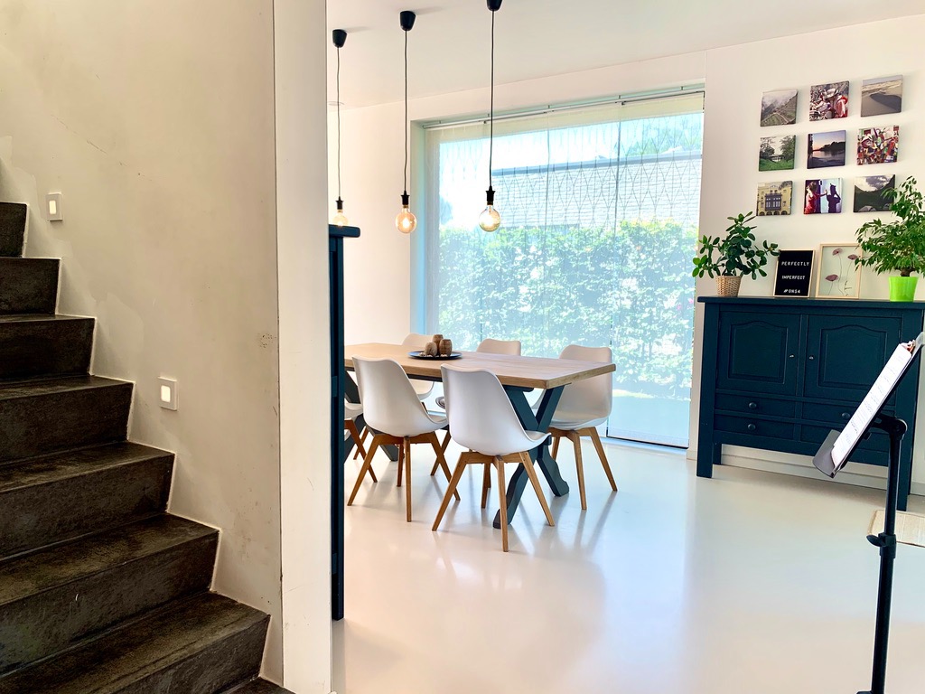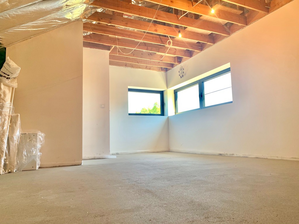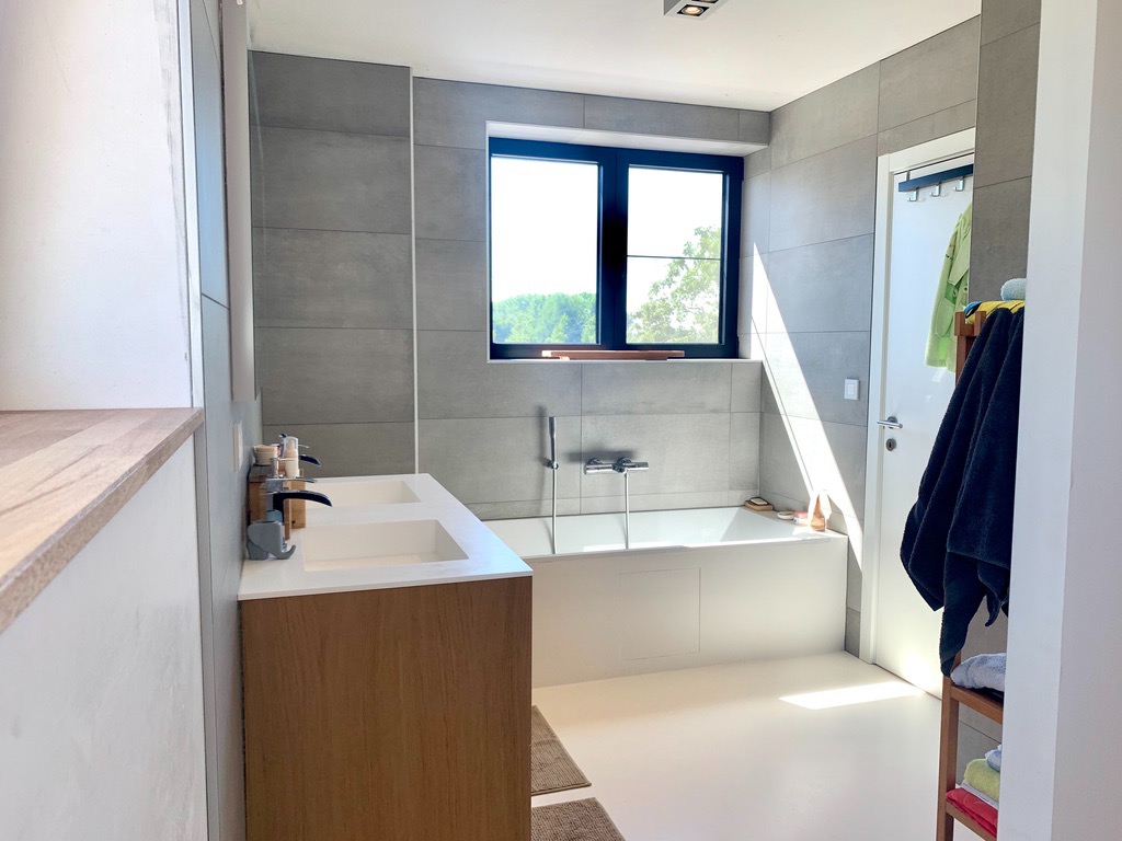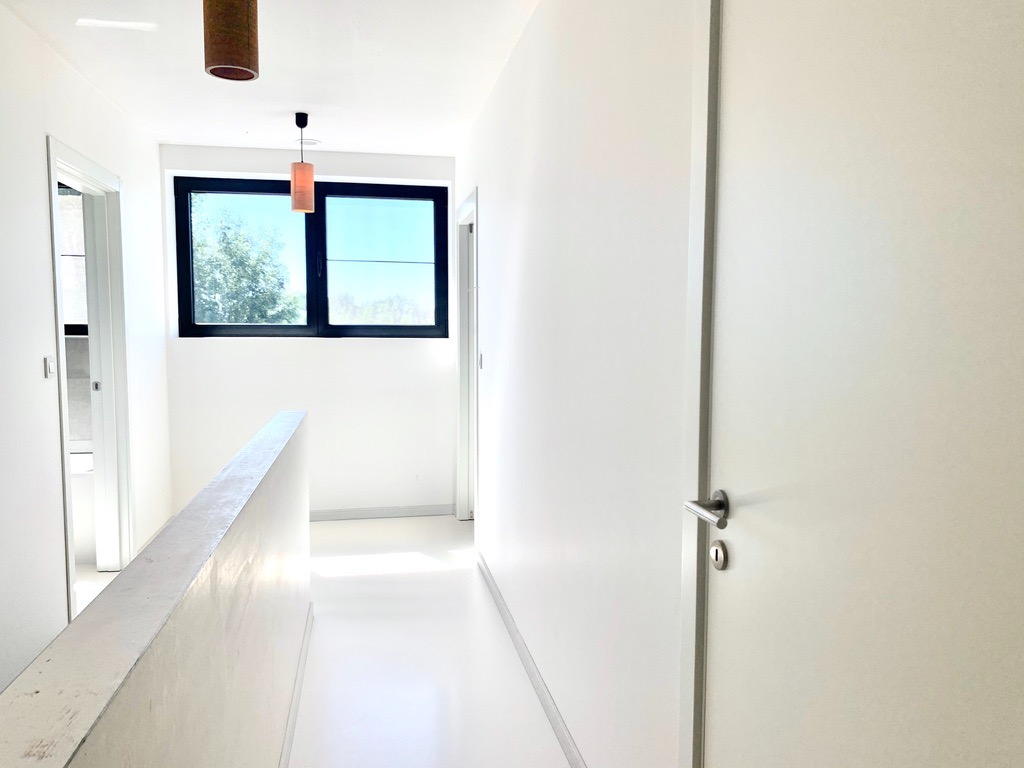 Via de gepolierde betonnen trap komt u op de eerste verdieping (ook epoxy en vloerverwarming) die voorzien is van 3 slaapkamers en een praktisch ingerichte badkamer met ligbad, dubbel lavabo-meubel, inloopdouche en aparte ruimte voor wasmachine/droogkast. Ook het bad en douche zijn uitbekleed met epoxy. Via de 2de betonnen trap gaat u naar de zolder die bijna afgewerkt is. Hier is de 4de slaapkamer voorzien met mogelijkheid tot 2de extra badkamer.