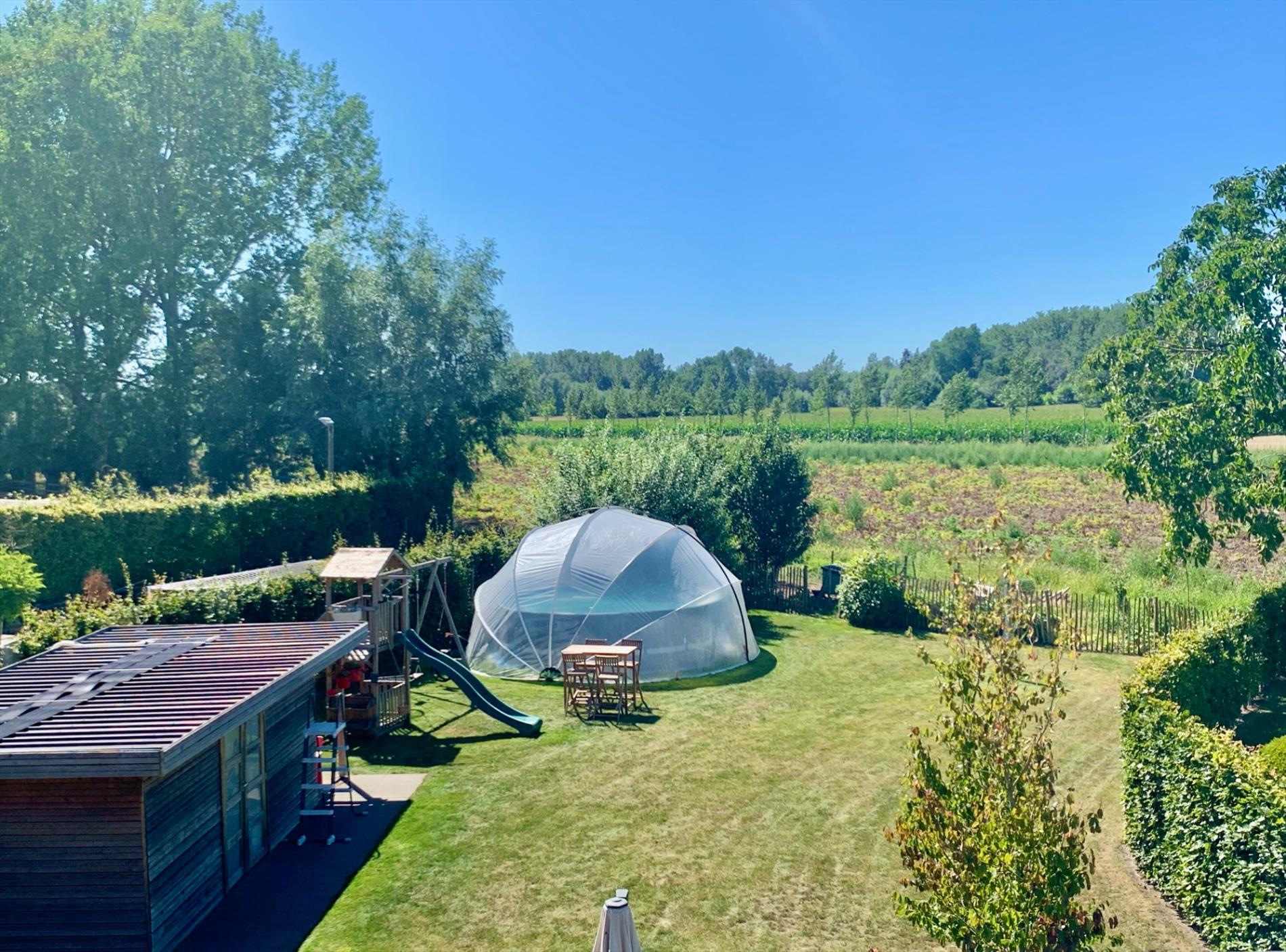 Ook de aangelegde tuin is een enorme meerwaarde met het grote terras, tuinhuis en vooral het landelijk uitzicht.