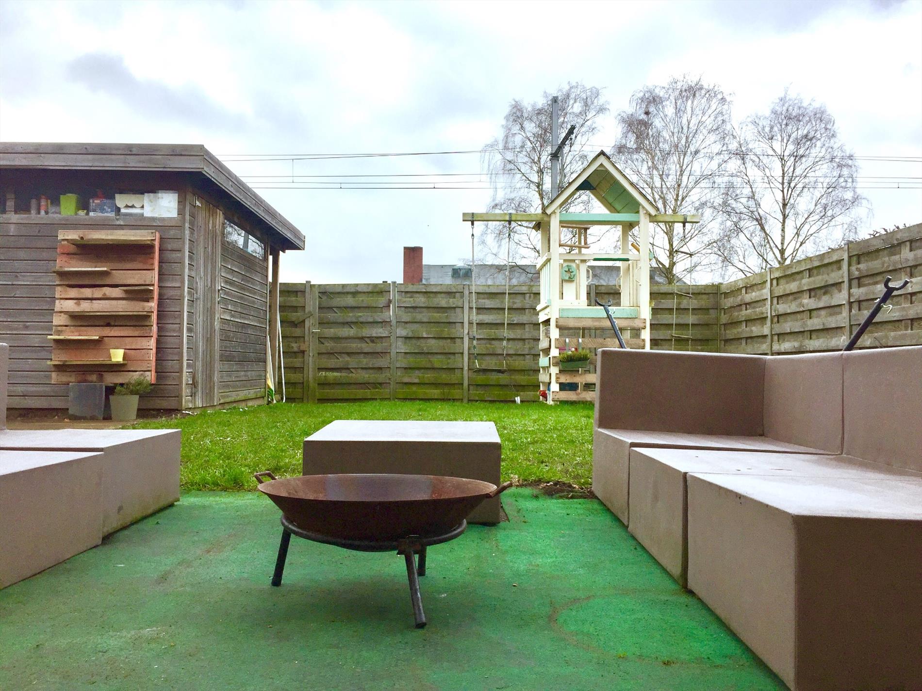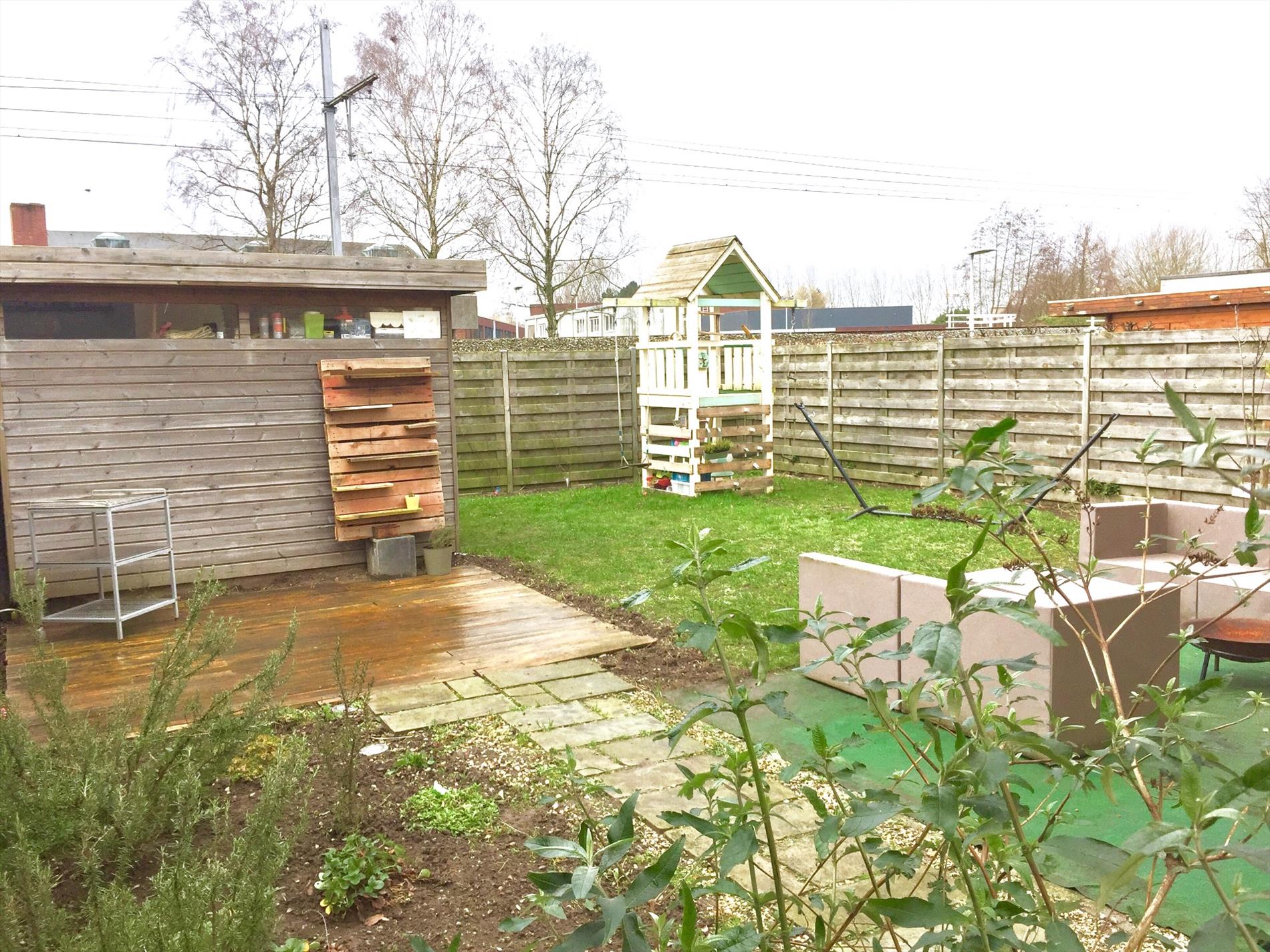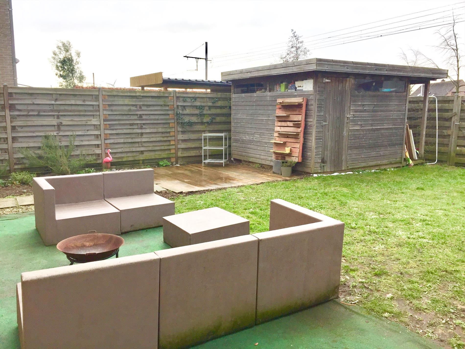De tuin is voorzien van een leuk tuinhuis en een houten terrasje. Ook de afsluiting is in hout, daarin is een poortje voorzien om zo rechtstreeks weg te kunnen op het aanpalend fietspad. Aan de zijkant van de woning is nog een houten tuinberging voorzien.