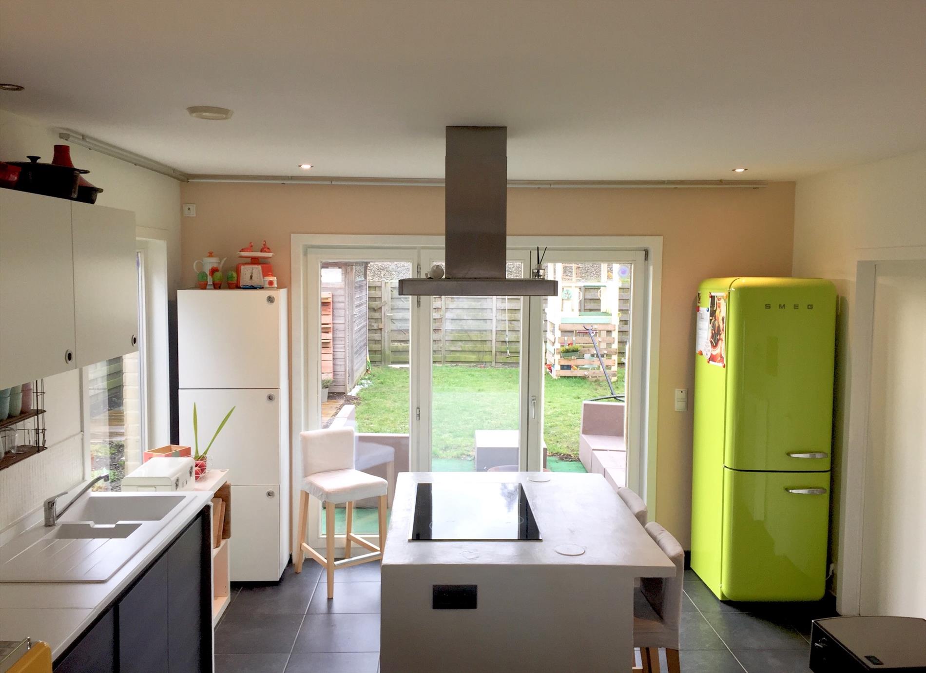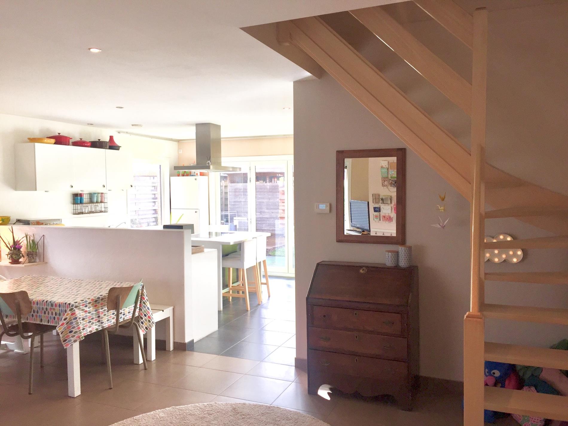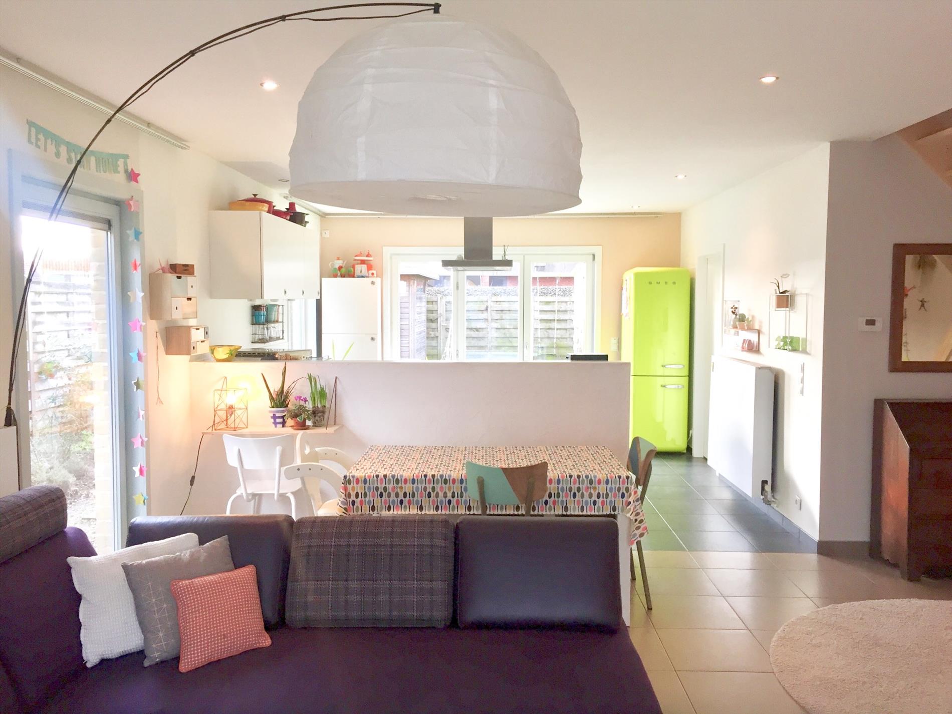 Op het gelijkvloers bevinden zich een inkomhal met ingemaakte kasten, een zeer ruime living en een strakke open keuken met eiland en een aanpalende ruime berging en een apart toilet. Vanuit deze berging kan u rechtstreeks in de tuin. De enorme lichtinval in de keuken is een enorm pluspunt. Ook van hieruit kan u rechtstreeks via de dubbele ramen naar buiten.