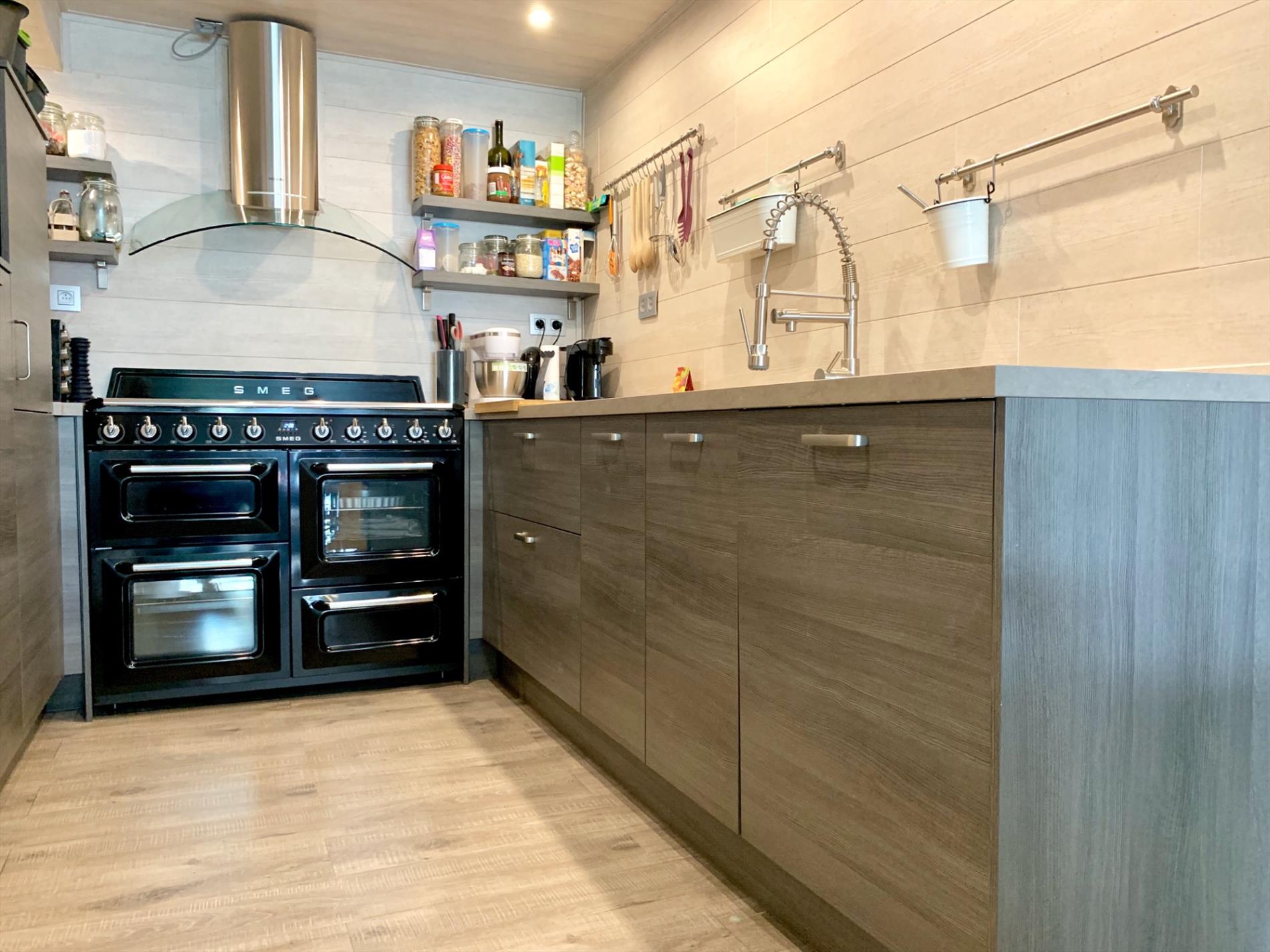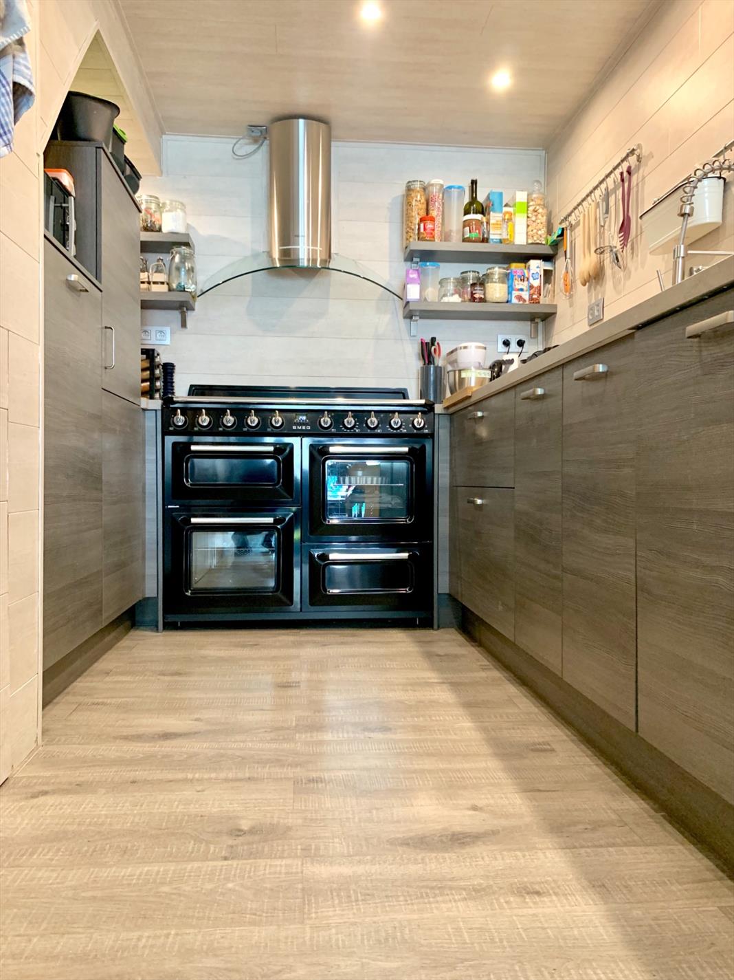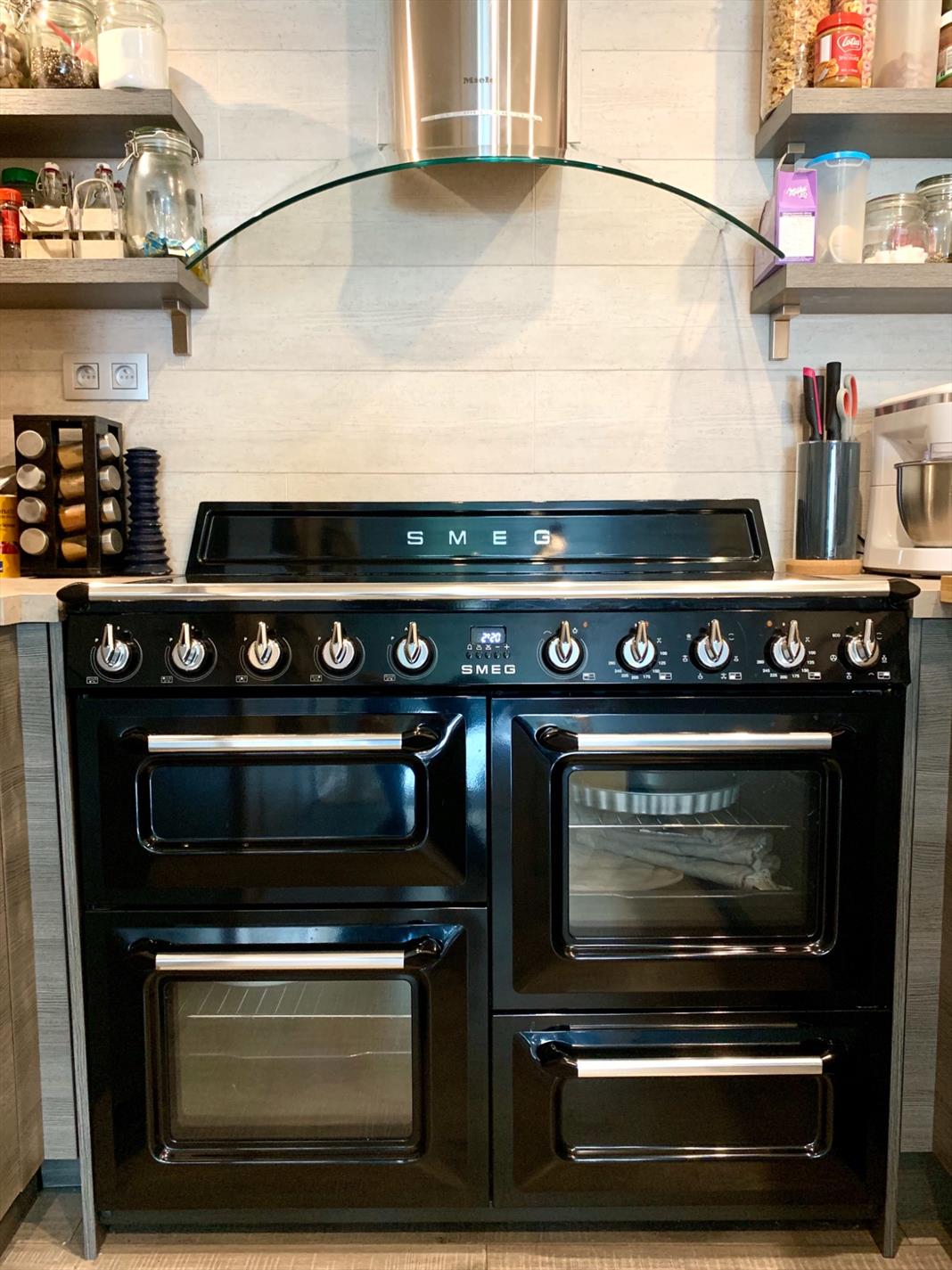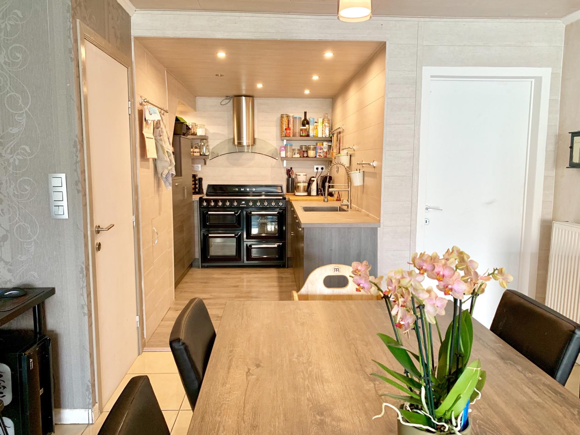 In de inkomhal heeft u een aparte berging, gastentoilet en een nis als vestiaire. De ruime, lichtrijke woonkamer heeft een schuifraam dat uitgeeft op de tuin. De volledig nieuwe open keuken is het pareltje van deze woning. De keuken is voorzien van veel ingemaakte kasten en alle nodige toestellen waaronder het prachtige SMEG-kookfornuis. Deze is voorzien van 2 ovens, 1 grill, opbergschuif en een 5-bekken inductie-kookplaat.