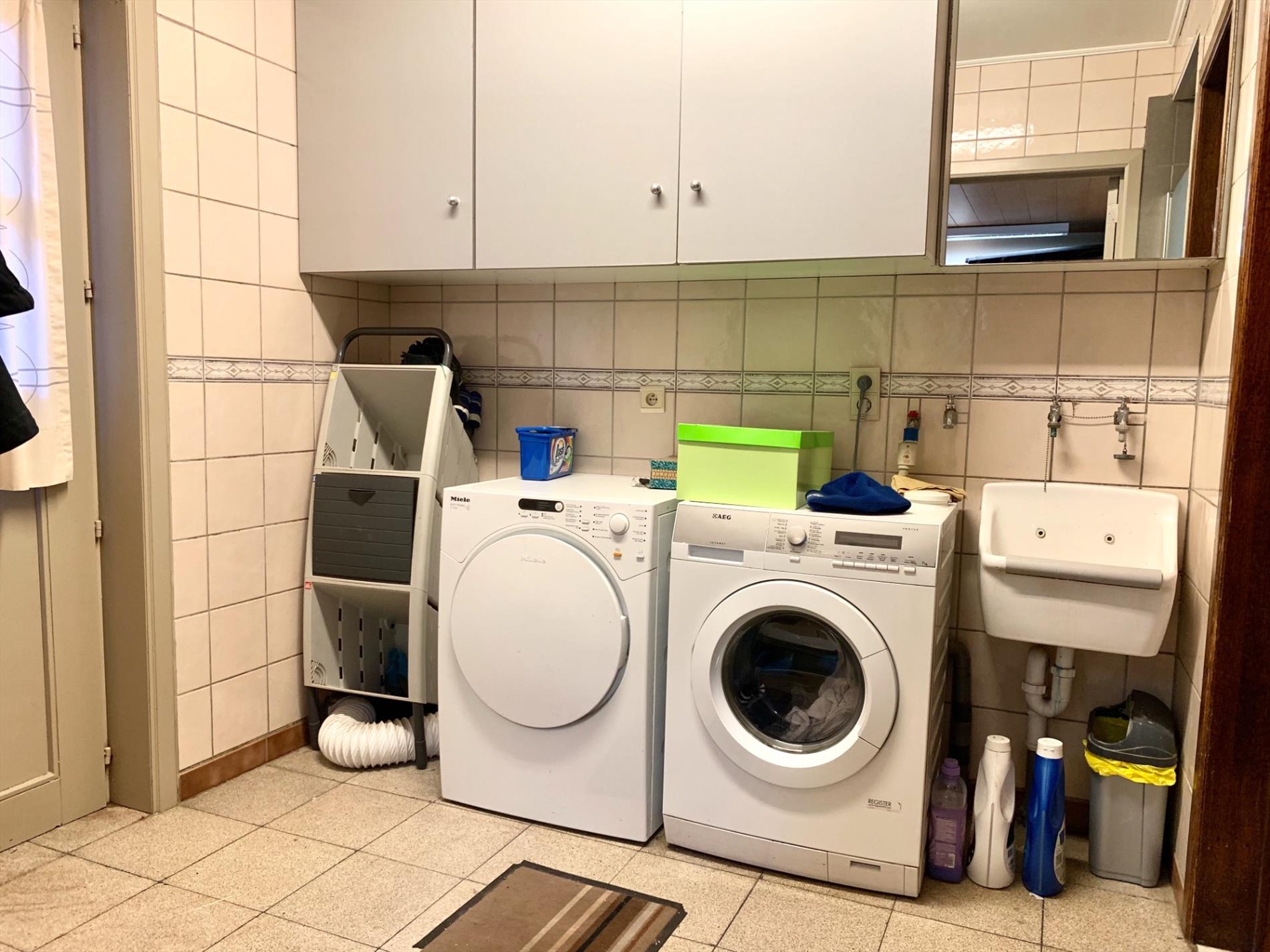 Op het gelijkvloers bevinden zich, een ruime inkomhal met gastentoilet, zeer ruime L-woonkamer met veel lichtinval en een gezellige kachel, aansluitend een grote keuken met alle nodige toestellen en een koele berging. Achteraan een zeer grote slaapkamer, een wasplaats met incl een inloopdouche (mogelijkheid tot 2de badk) en toegang tot een (praktijk)-ruimte/bureau of eventueel een 5de slaapkamer. Deze ruimte heeft een aparte toegang.