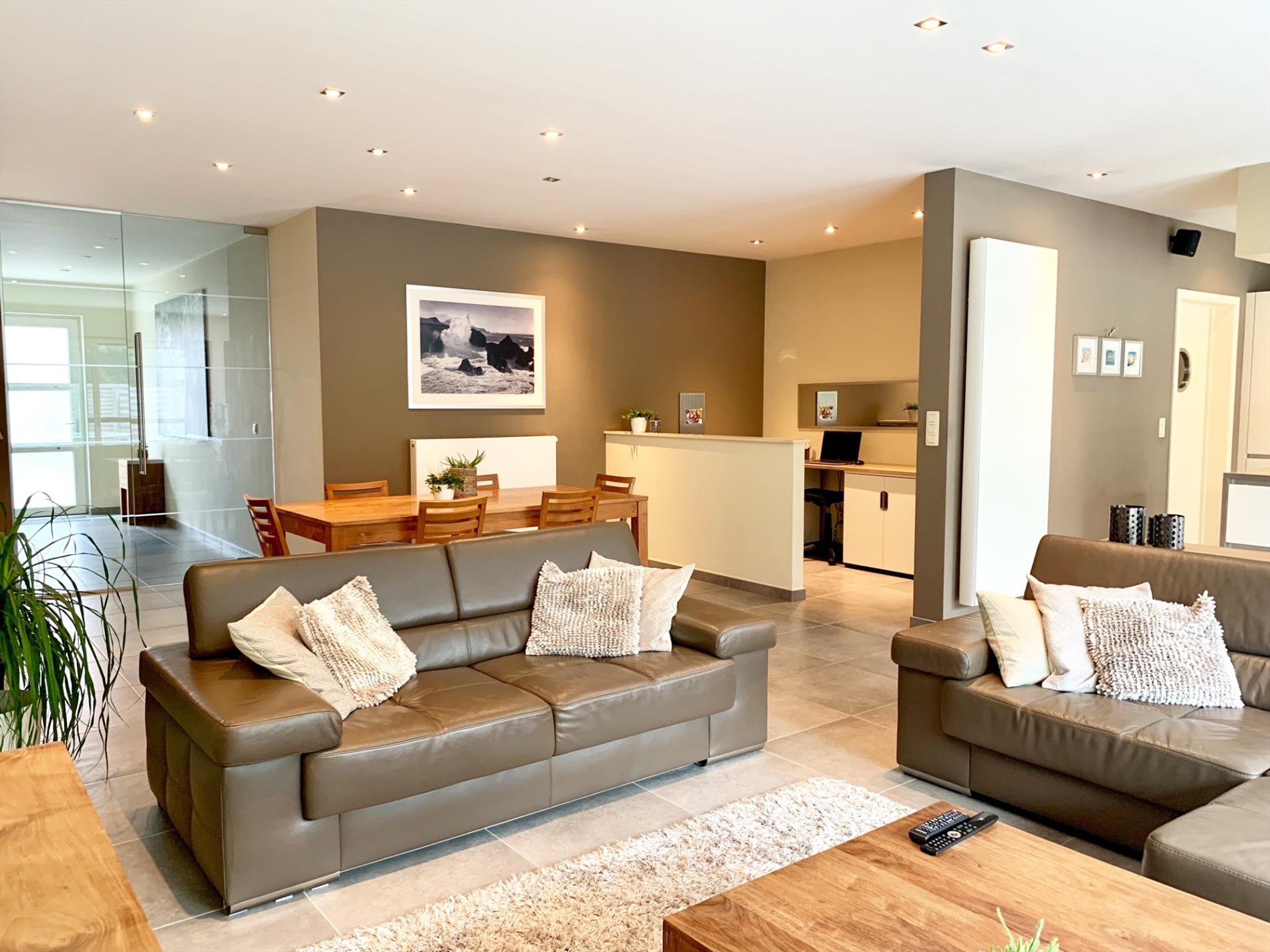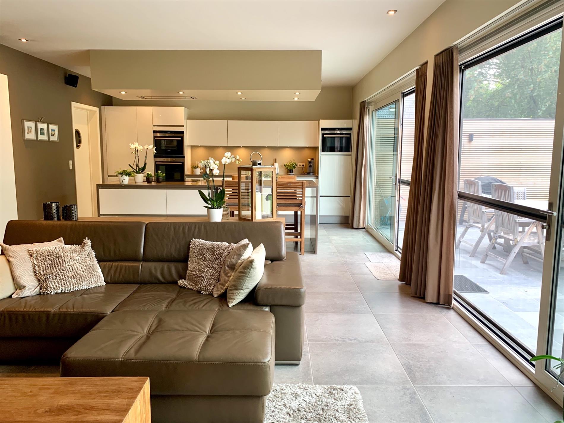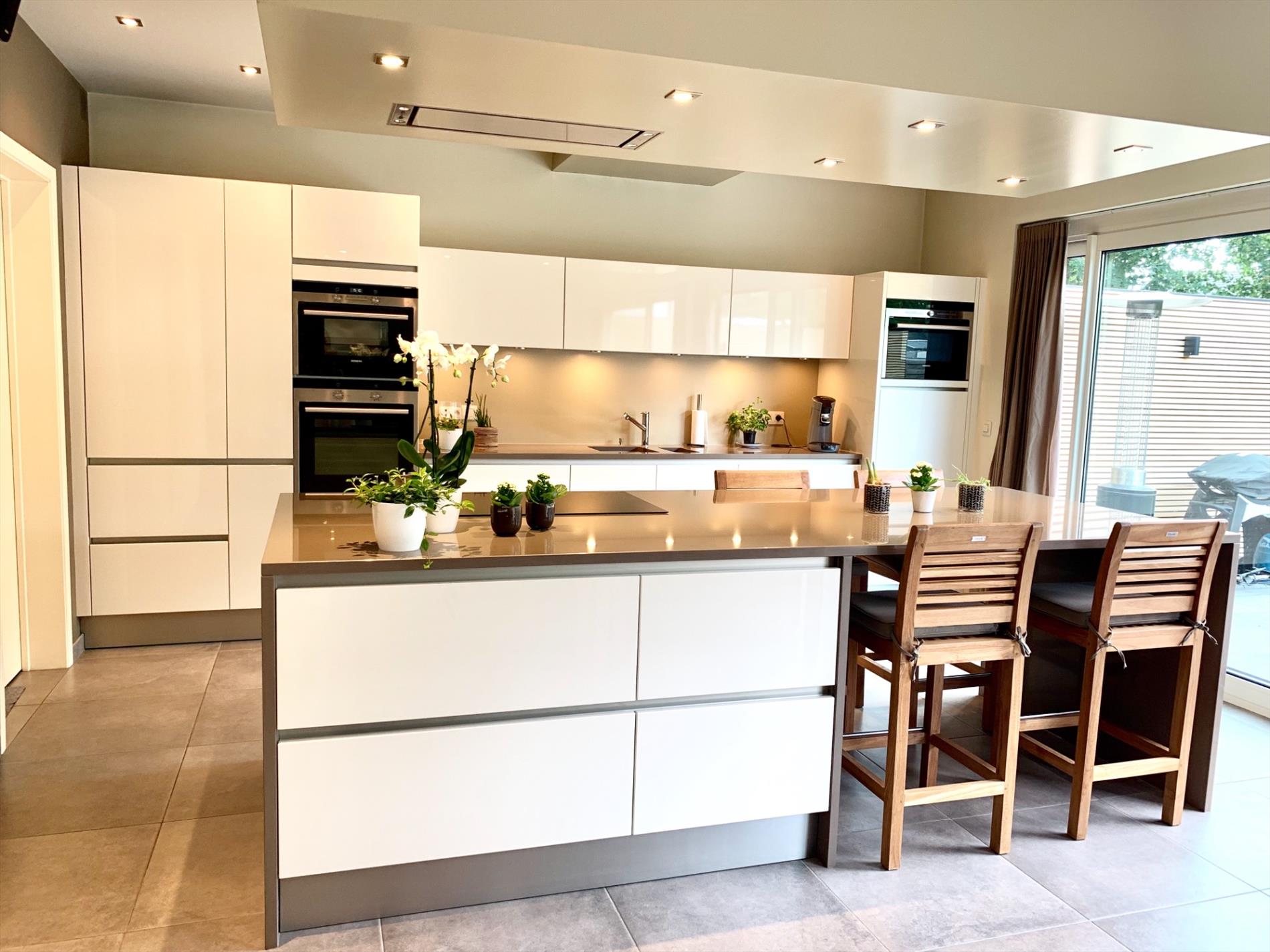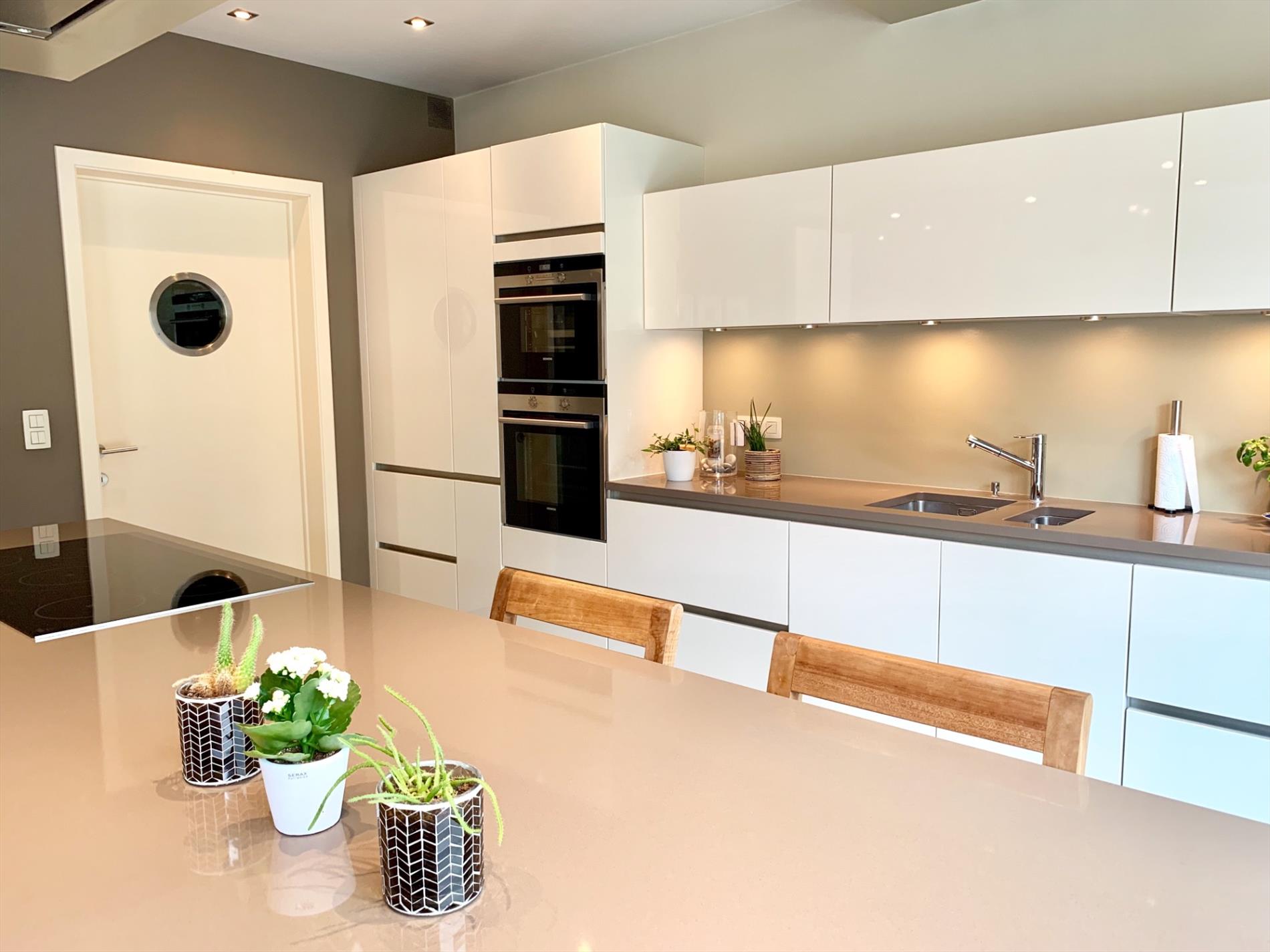 Achter de hoogwaardige keuken die voorzien is van alle nodige toestellen, bevinden zich nog een extra ruime wasplaats en zeer praktische dubbele garage met veel bergruimte en 2 auto staanplaatsen incl elect. poort.