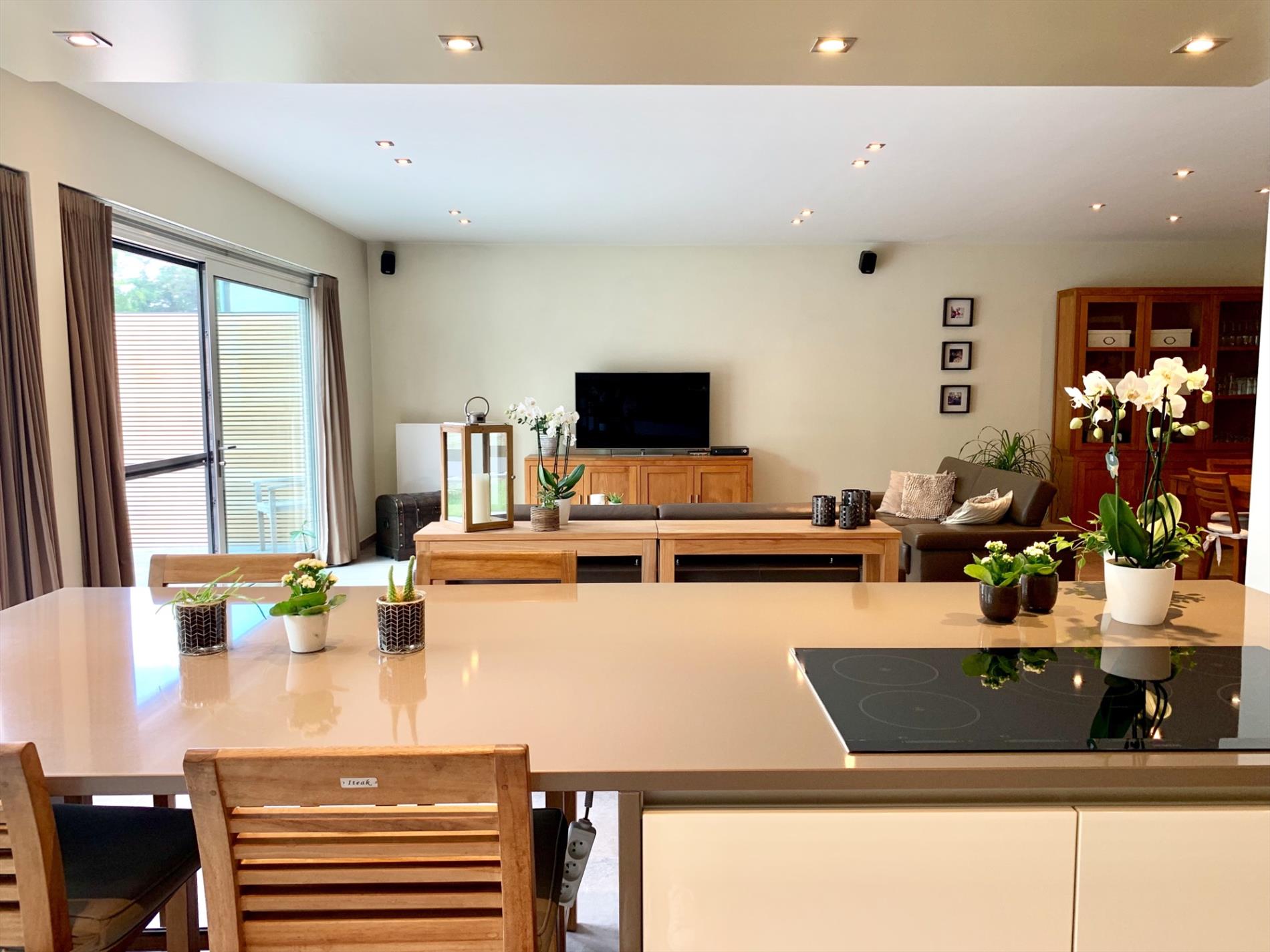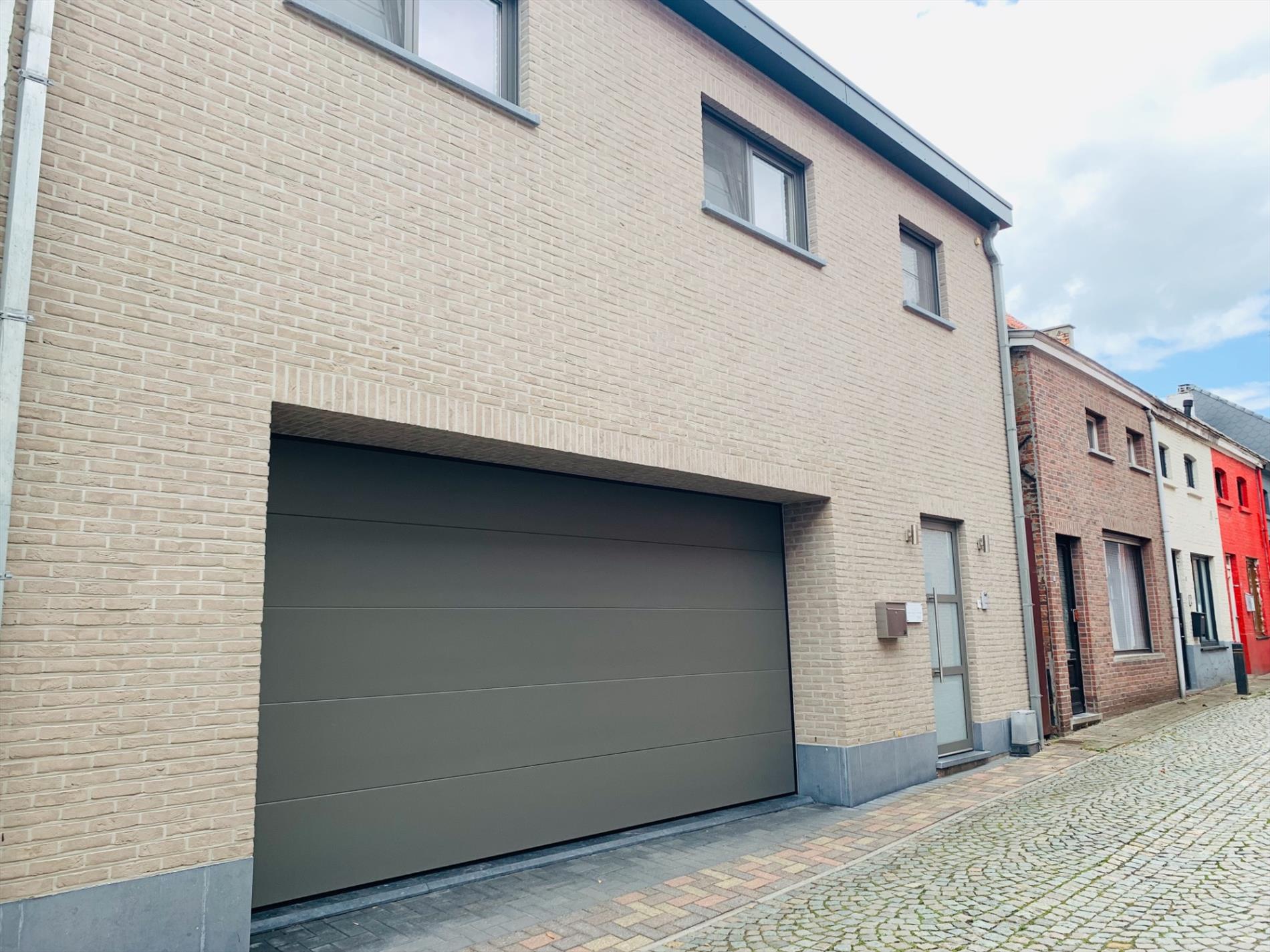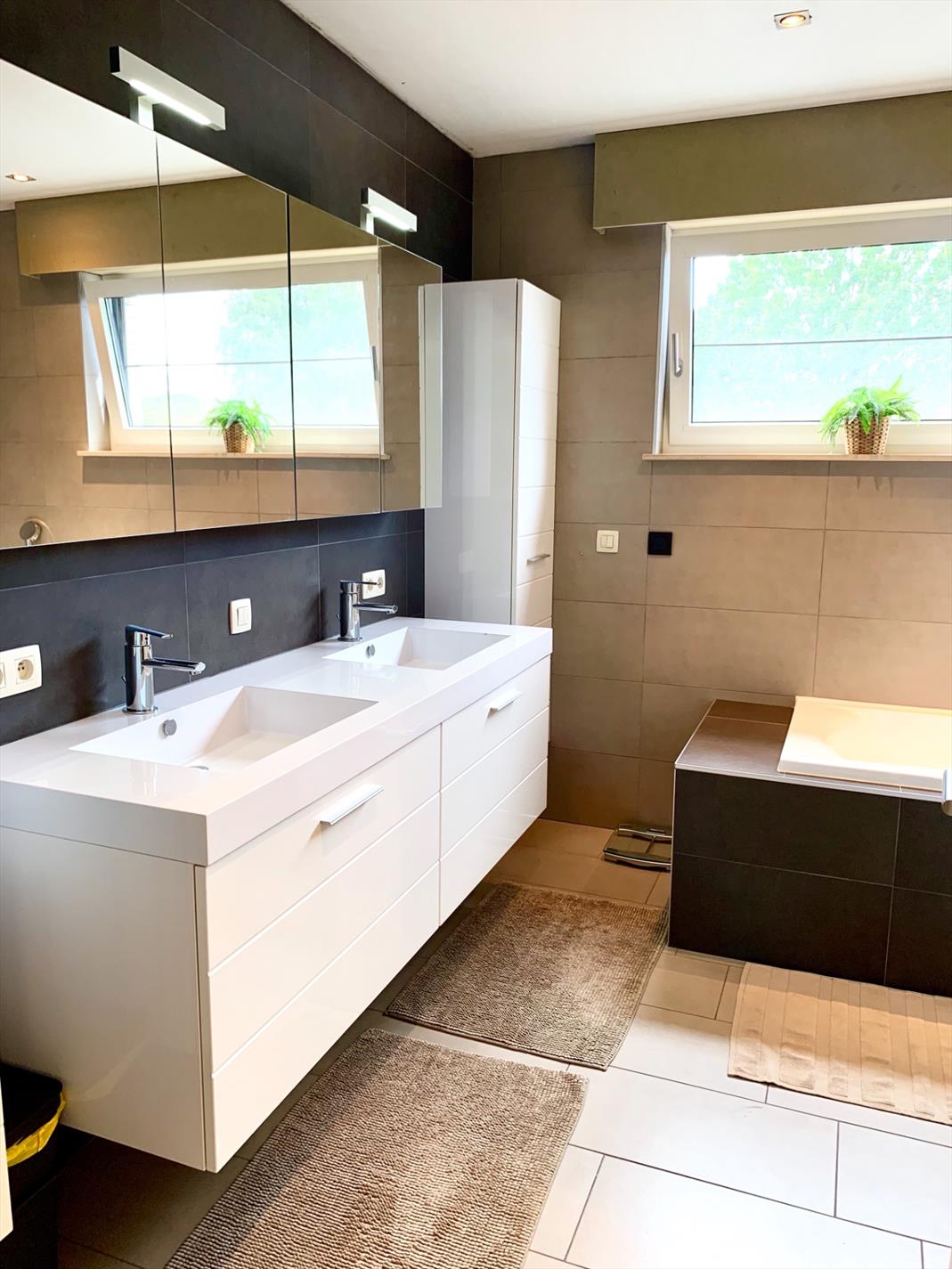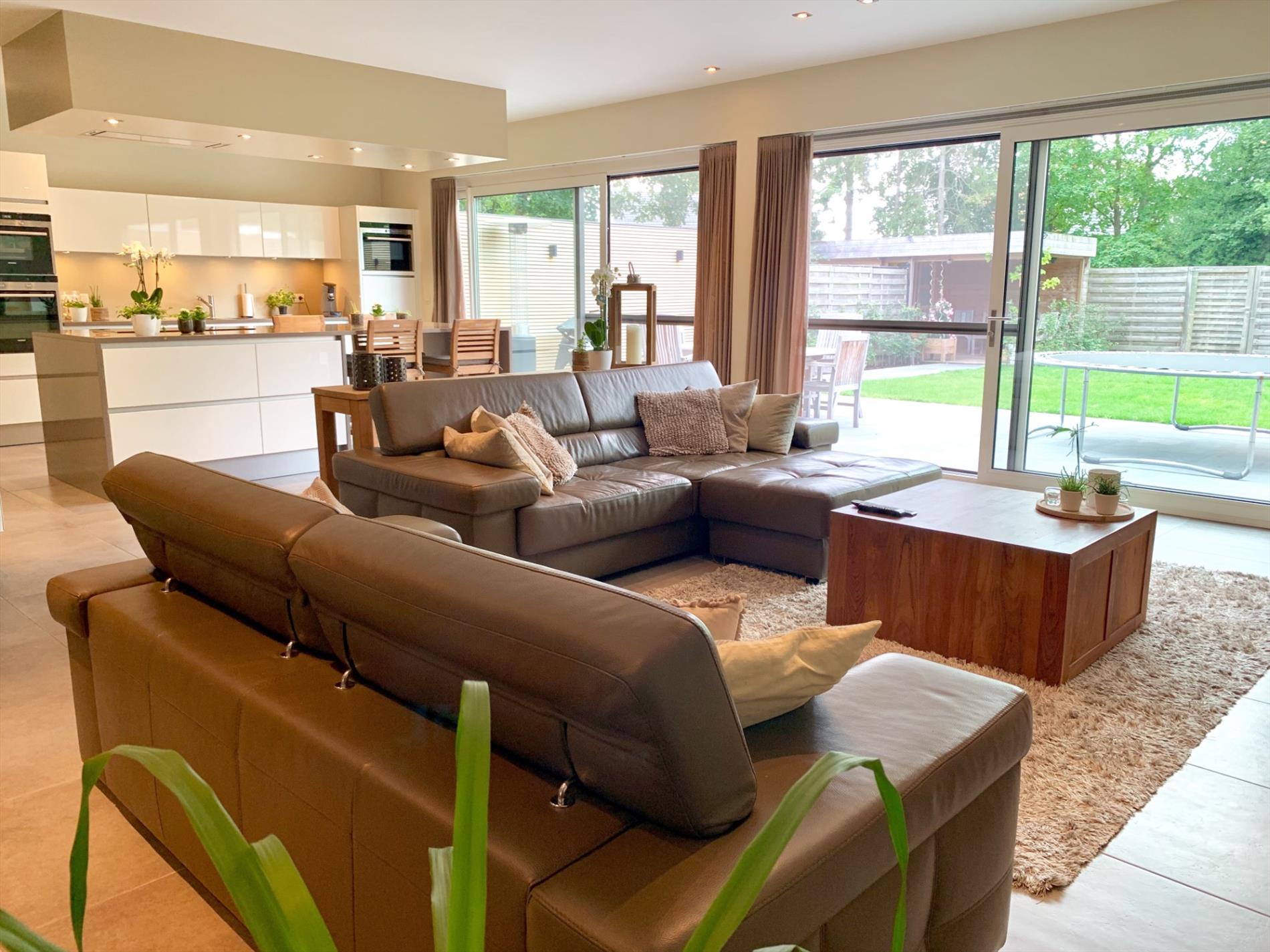 Achter de hoogwaardige keuken die voorzien is van alle nodige toestellen, bevinden zich nog een extra ruime wasplaats en zeer praktische dubbele garage met veel bergruimte en 2 auto staanplaatsen incl elect. poort.