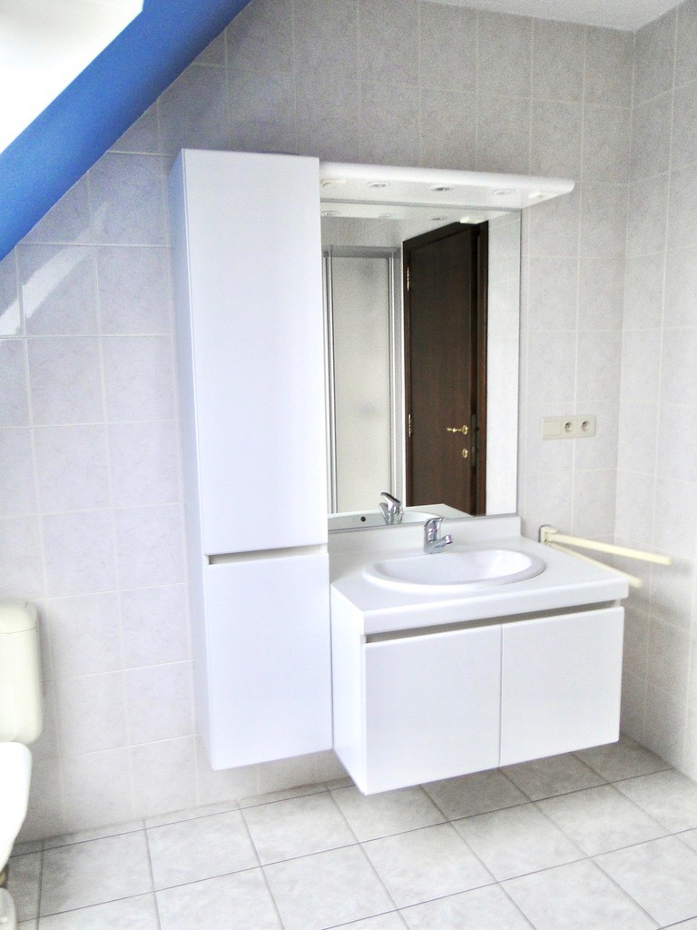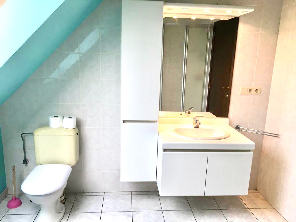 Anderzijds betreft het een jonge woning, van het bouwjaar 2001, die op het gelijkvloers een ruime woonkamer en keuken aanbiedt, met nog inkomhal met gastentoilet en 1 slaapkamer/bureau en badkamer.