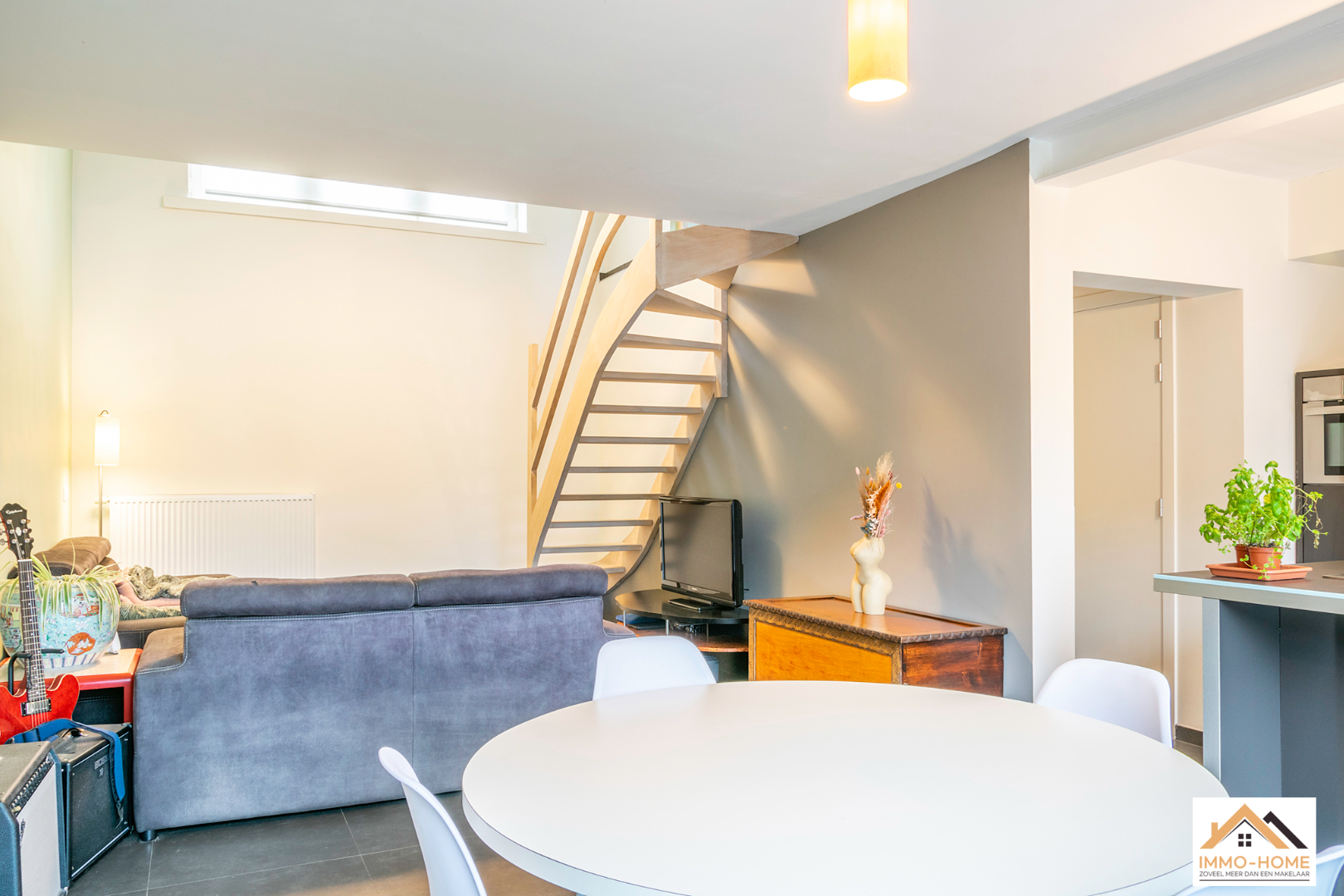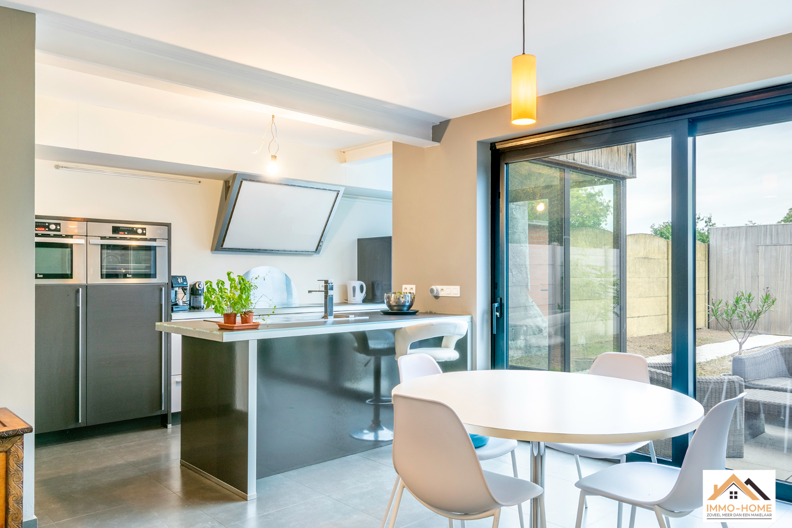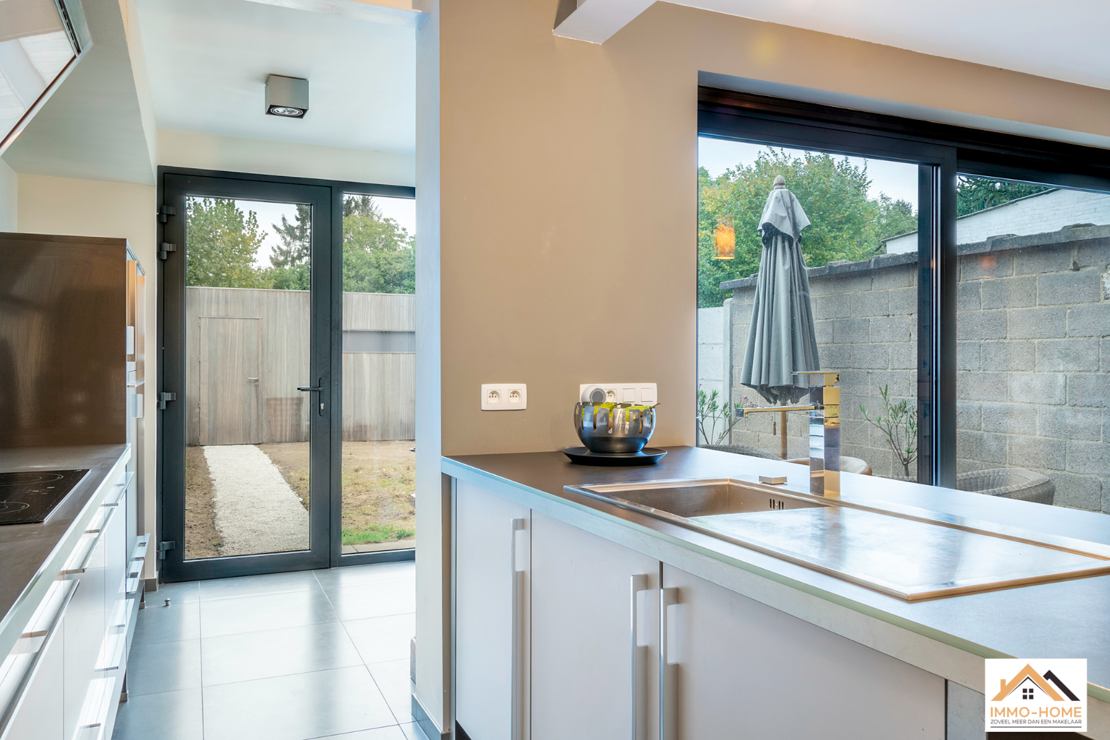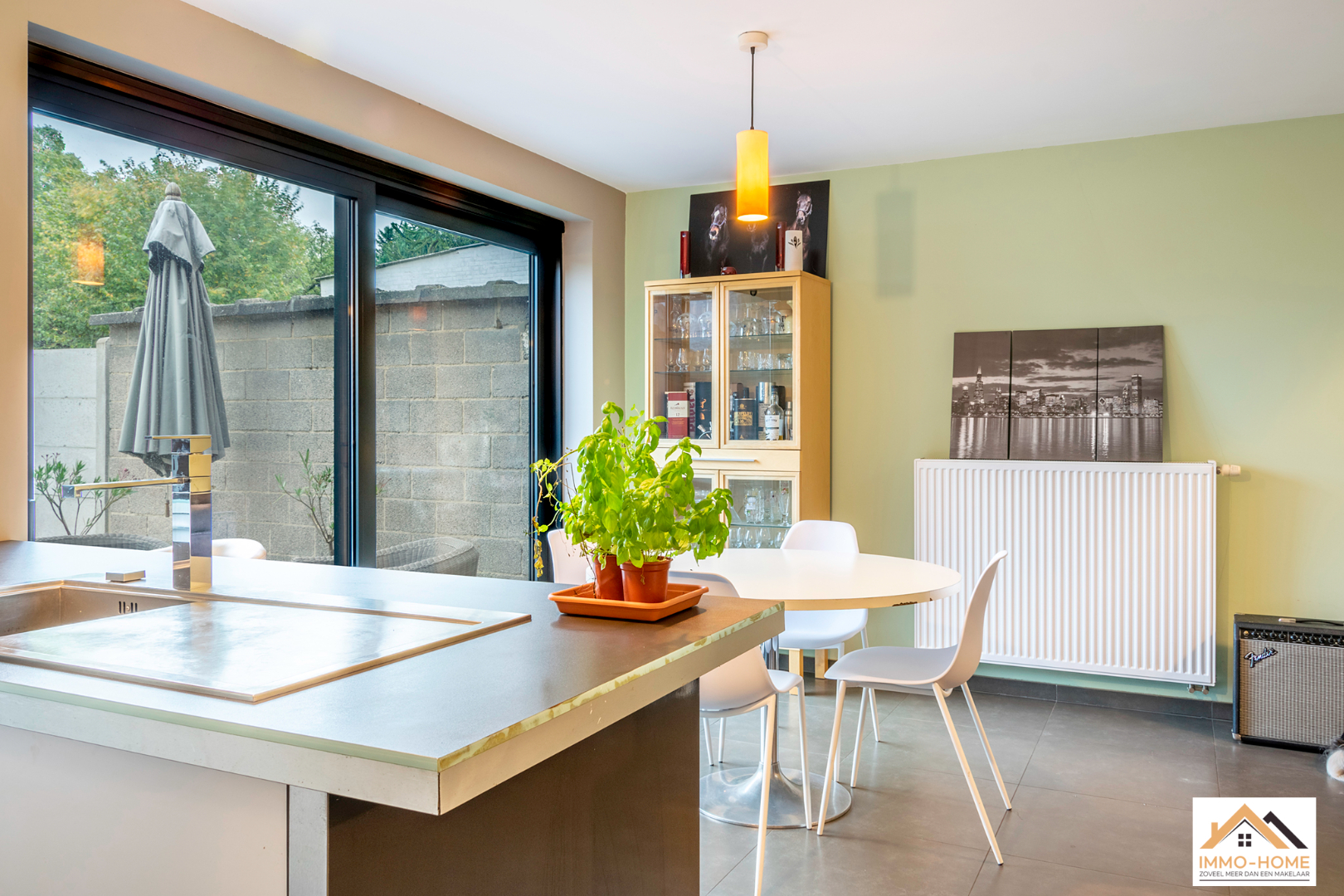 Schrijf u inAchter de anonieme gevel van deze rijwoning zit een verrassende parel verborgen. De inkomhal is het centrale punt van de woning, je merkt hier al meteen dat het daglicht doorheen de volledige woning zijn weg kan vinden. Via een trap kom je op het niveau eronder in een lichtrijke leefruimte terecht, die door de grote raampartijen uitkijkt op de tuin. De open keuken is voorzien van alle moderne comfort en met een handige berging/wasplaats. Ook het gastentoilet bevindt zich op dit niveau. Op het oude gelijkvloers is er een aangename multifunctionele ruimte met zithoek ingericht, met heel veel lichtinval en een mooi uitzicht op het achterliggende groen. De verdieping erboven wordt gevuld met twee grote slaapkamers, waarvan één met een aansluitende badkamer. Een tweede badkamer (met extra toilet) is nog af te werken, de leidingen zijn alvast voorzien. Achteraan in de tuin staat een nieuwe grote garage met automatische poort, die bereikbaar is via een gemeenschappelijke private weg naast het woningblok. Bezoekdag 17/12: Inschrijvingen via mail naar tommy@immo-home.be, geen telefonische inschrijvingen! Volg ons op Fb en insta. Voor meer info: www.immo-home.be