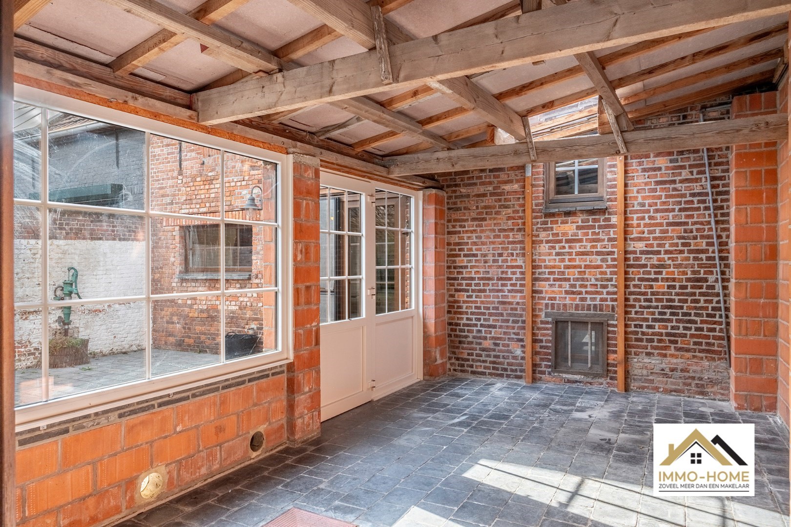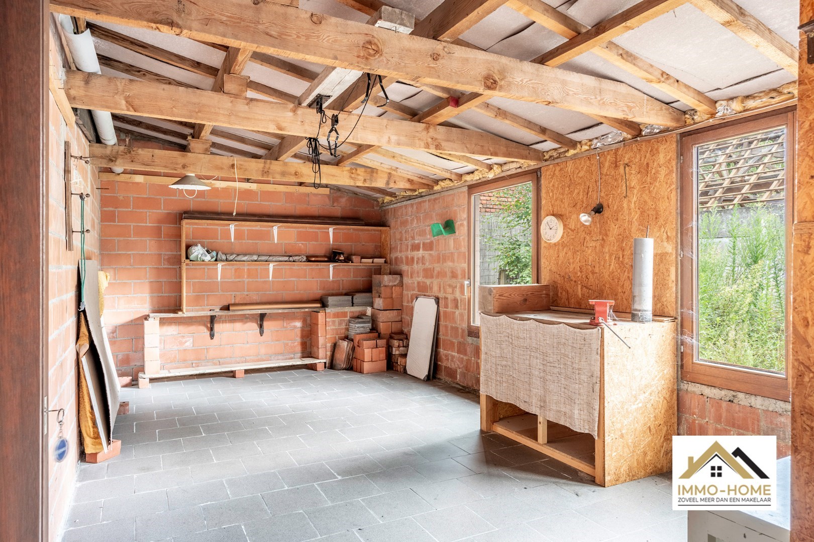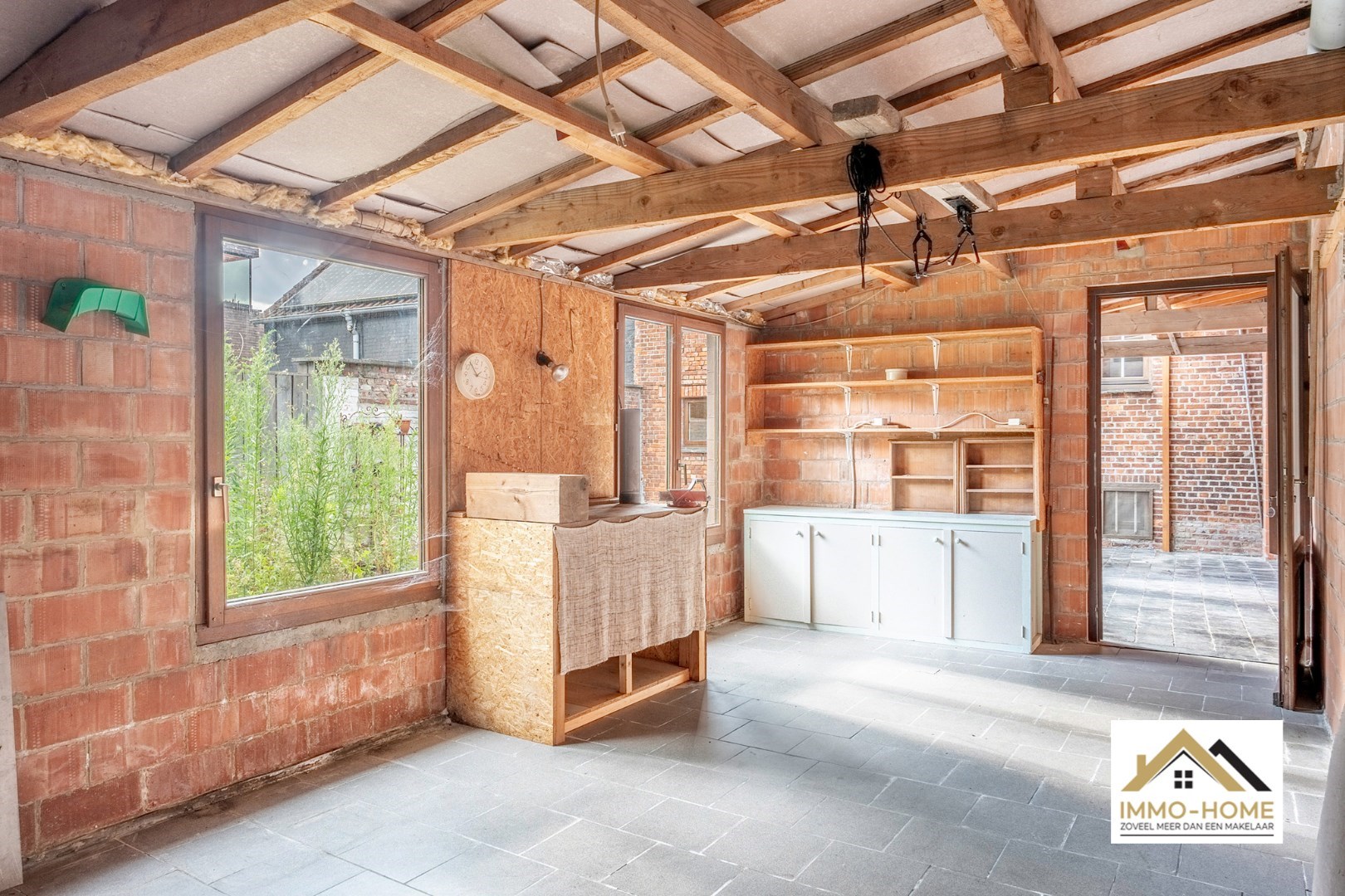 Schrijf u inDit reeds deels gerenoveerde pand bevindt zich in de dorpskom van het landelijke Zaffelare. Je komt binnen in de grote leefruimte, met een haardplaats als centrale aandachtstrekker. De aanpalende keuken is praktisch ingericht en van hieruit heb je een heel leuk contact met het terras en de kleine tuin. Via de trap passeer je de badkamer, waar er naast de douche en het toilet ook plaats is voor de wasmachine, en zo kom je tot op de zolderverdieping die nu is ingericht als enige slaapkamer. Alle aansluitingen zijn voorzien, net als heel wat ingemaakte kasten en een aparte bureelruimte. De zichtbare authentieke dakstructuur zorgt voor een speciale sfeer en beleving. Achteraan de woning is er een recent bijgebouw, waar momenteel een overdekt terras is ondergebracht dat mooi aansluit op het buitengedeelte. Daarnaast is er een ruime multifunctionele werkplaats/opslagruimte voorzien, en nog meer opbergruimte is er in de kelder. Inschrijvingen via mail naar larissa@immo-home.be , geen telefonische inschrijvingen! Volg ons op Fb en insta. Voor meer info: www.immo-home.be GRATIS SCHATTING GRATIS FINANCIEEL ADVIES