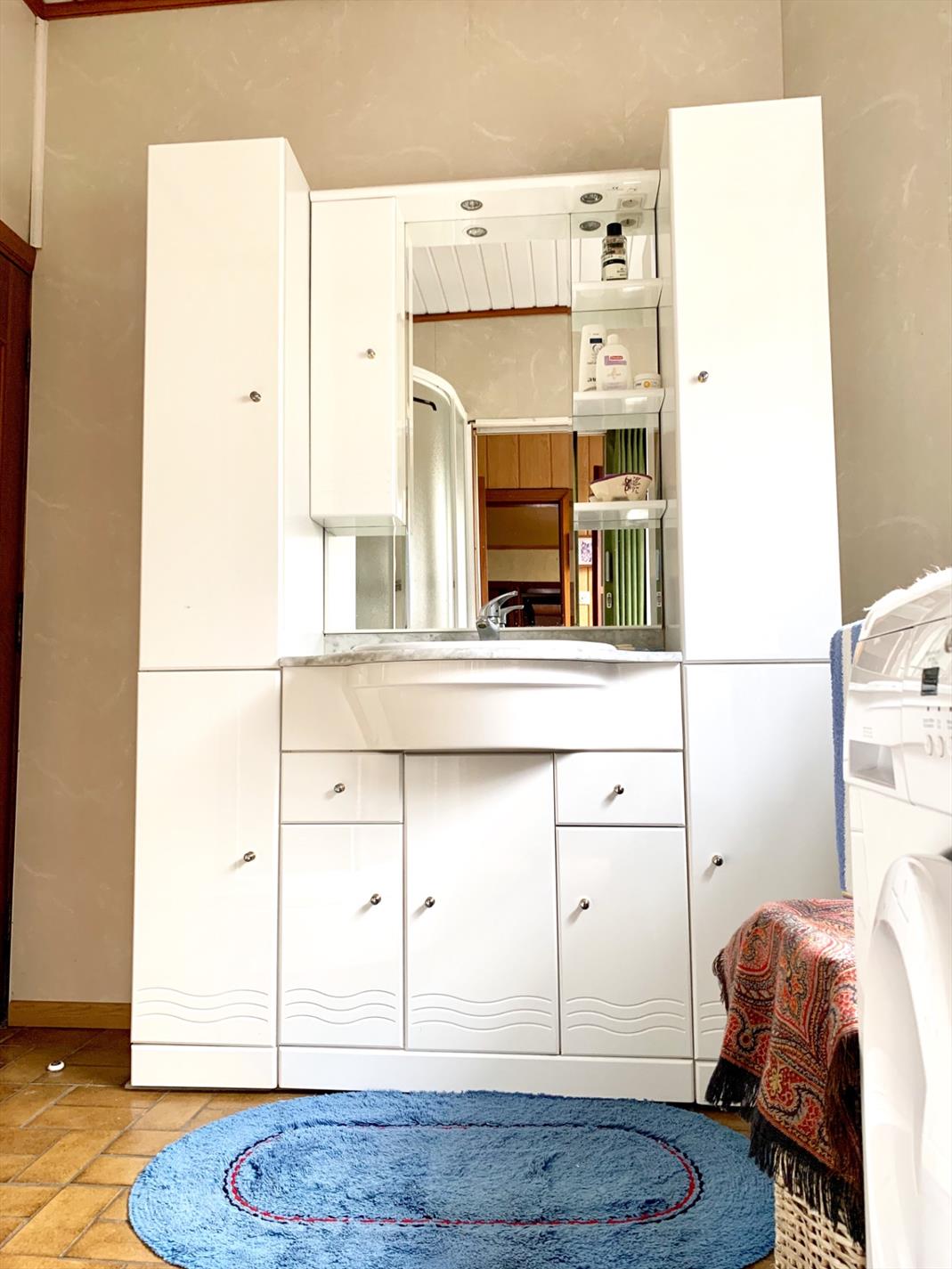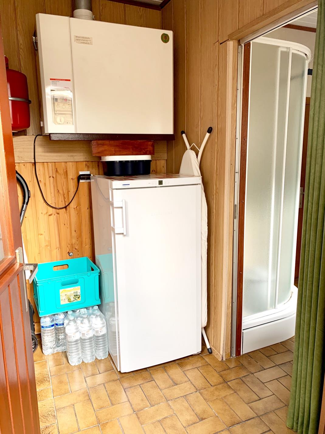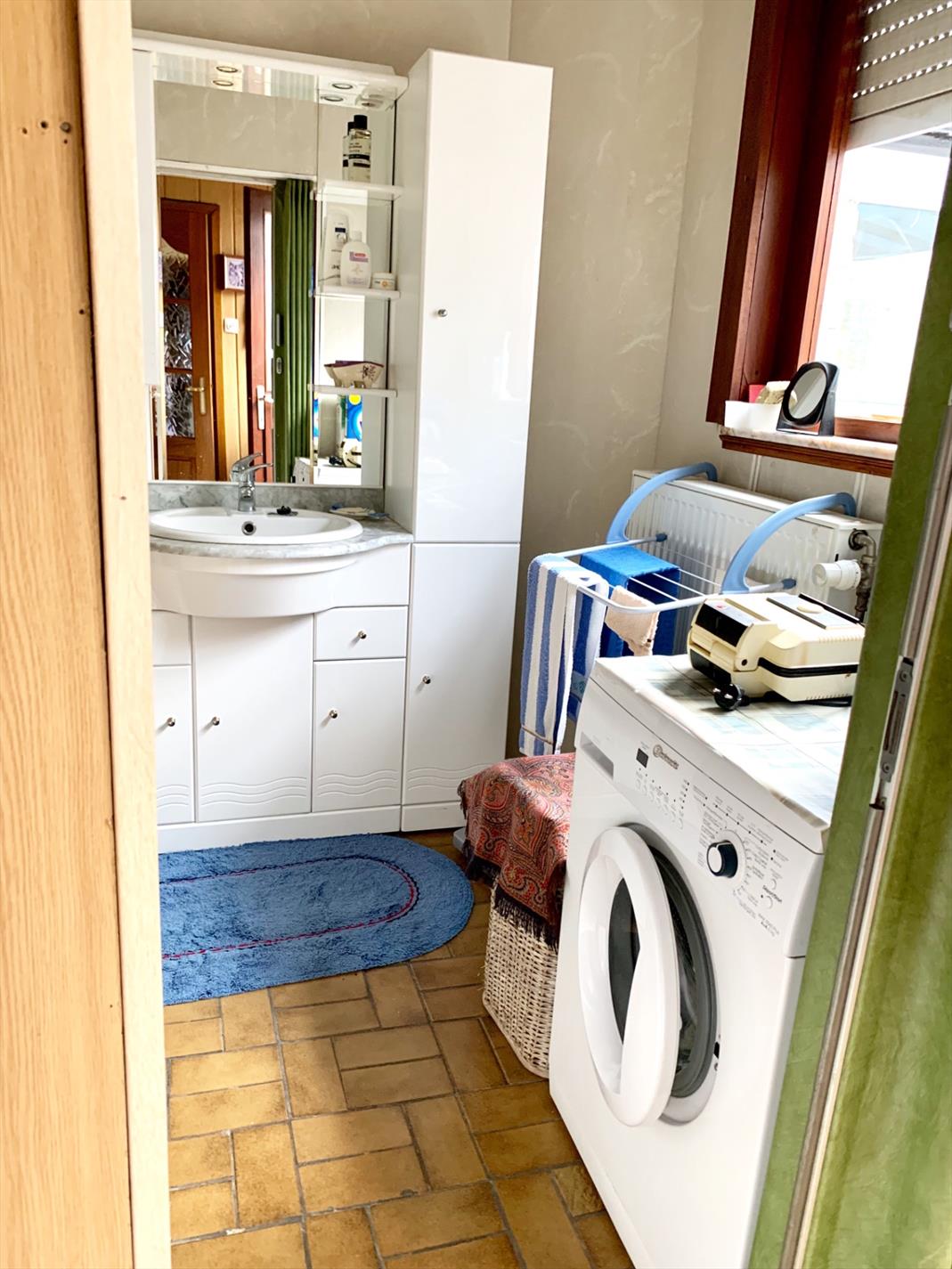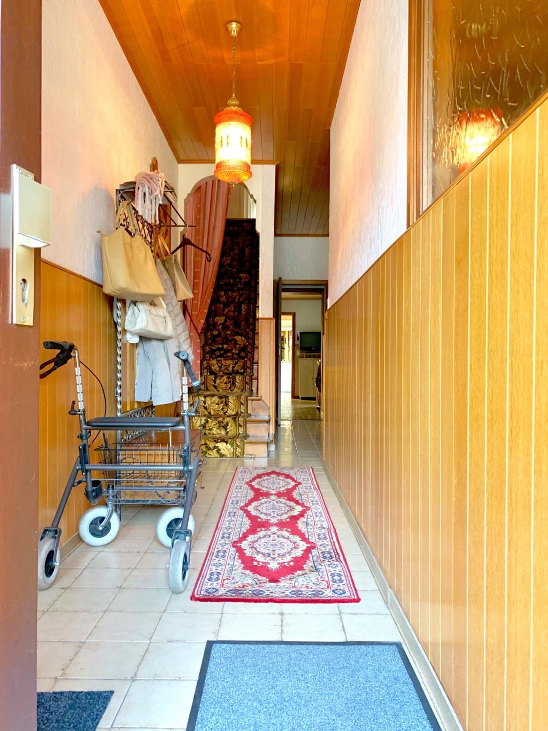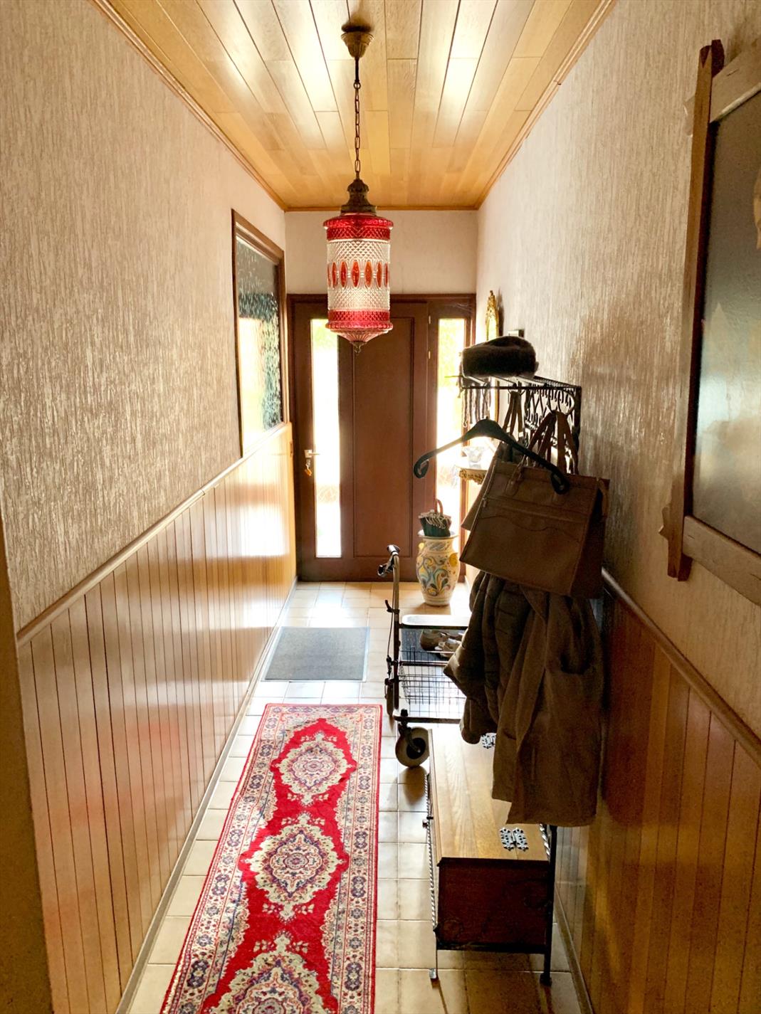 Aan de voorzijde zijn 2 ingangen, enerzijds de inkomhal, anderzijds een kleine berging met doorgang naar woonkamer. De leefruimte is ook te bereiken via de inkomhal en de ruime keuken met kelder. Achter de keuken bevinden zich de wasplaats, de badkamer met douche, lavabo-meubel en apart afgesloten toilet. Ook de veranda ligt achter de keuken.