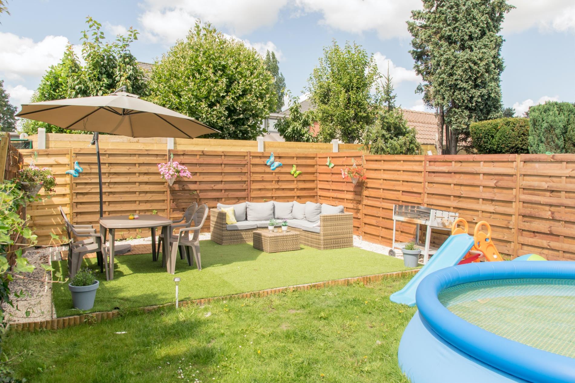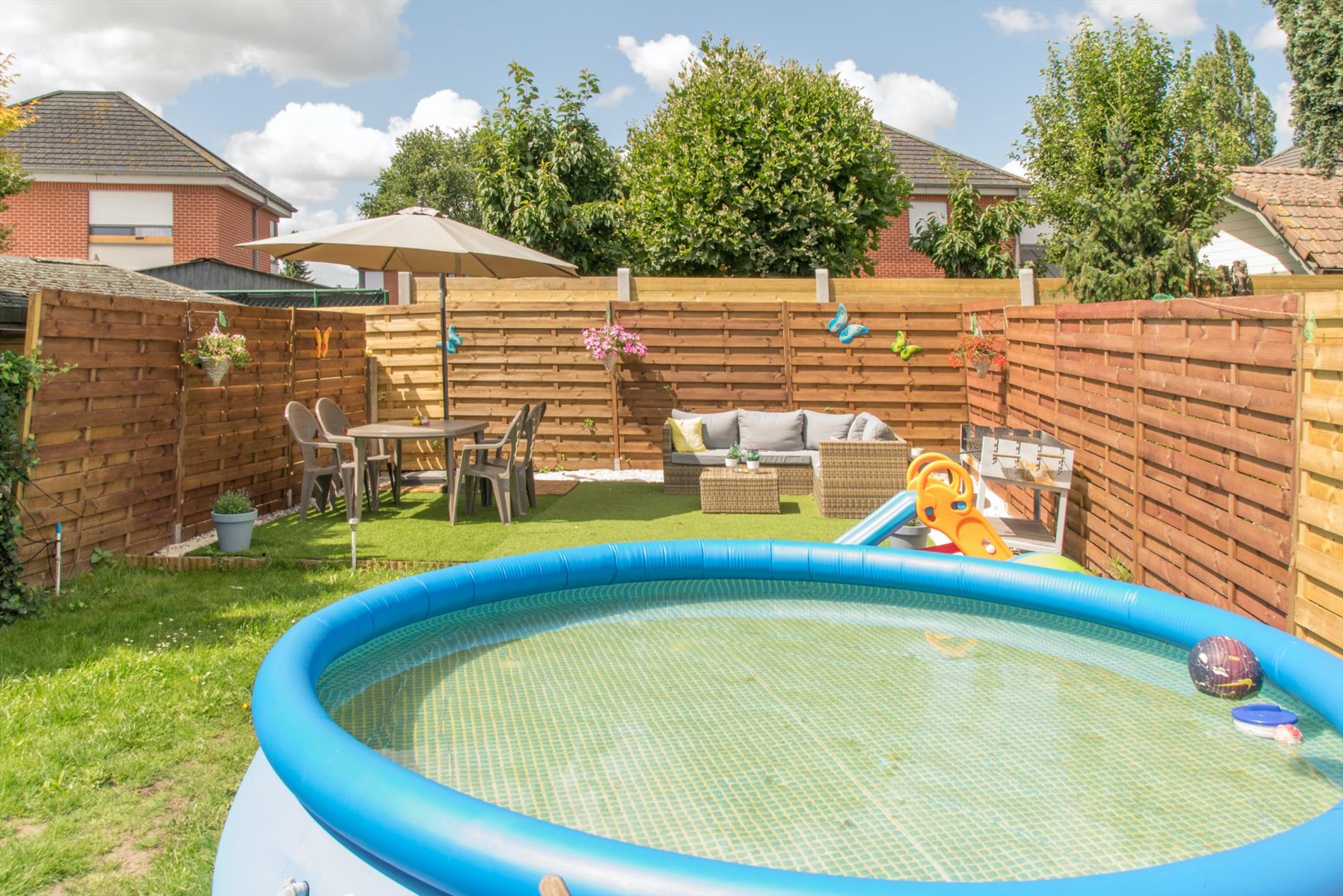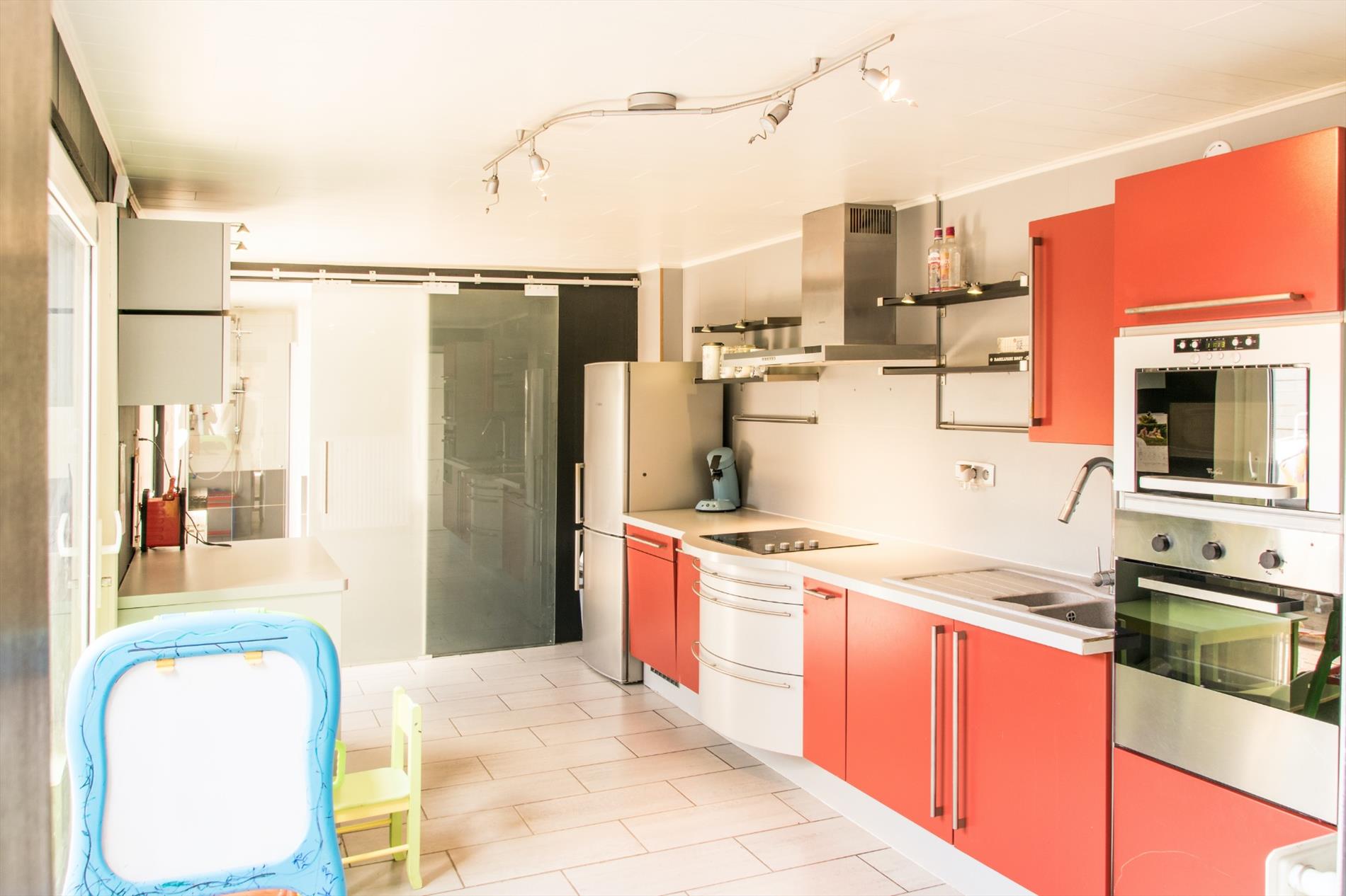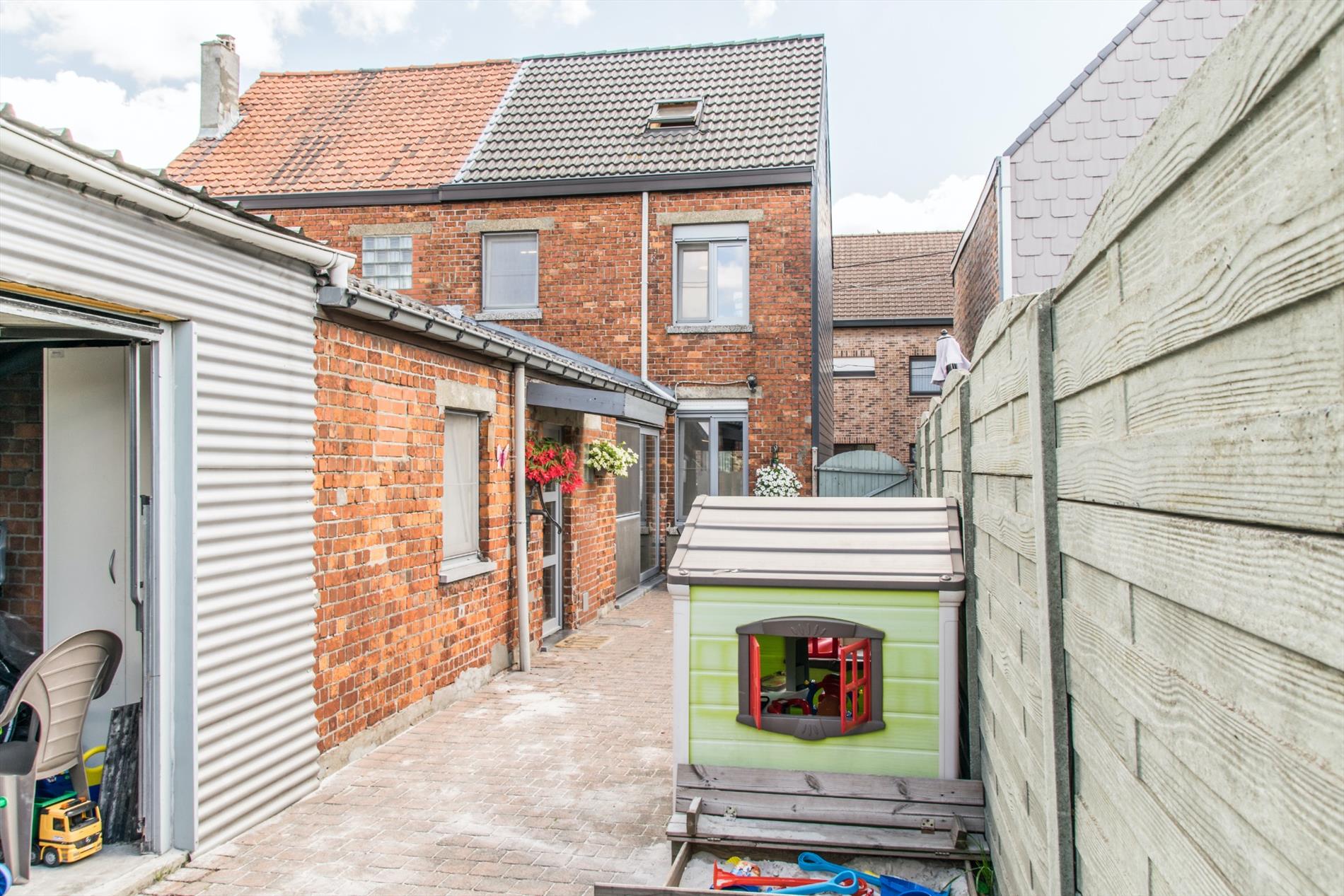 Via de keuken heb je ook toegang tot het gezellige terras en de vrij ruime tuin, waar je bijna gans de dag van het zonlicht kan genieten ! Hier bevindt zich ook nog een extra bergruimte, en het huis beschikt bovendien ook nog over een handige kelder.