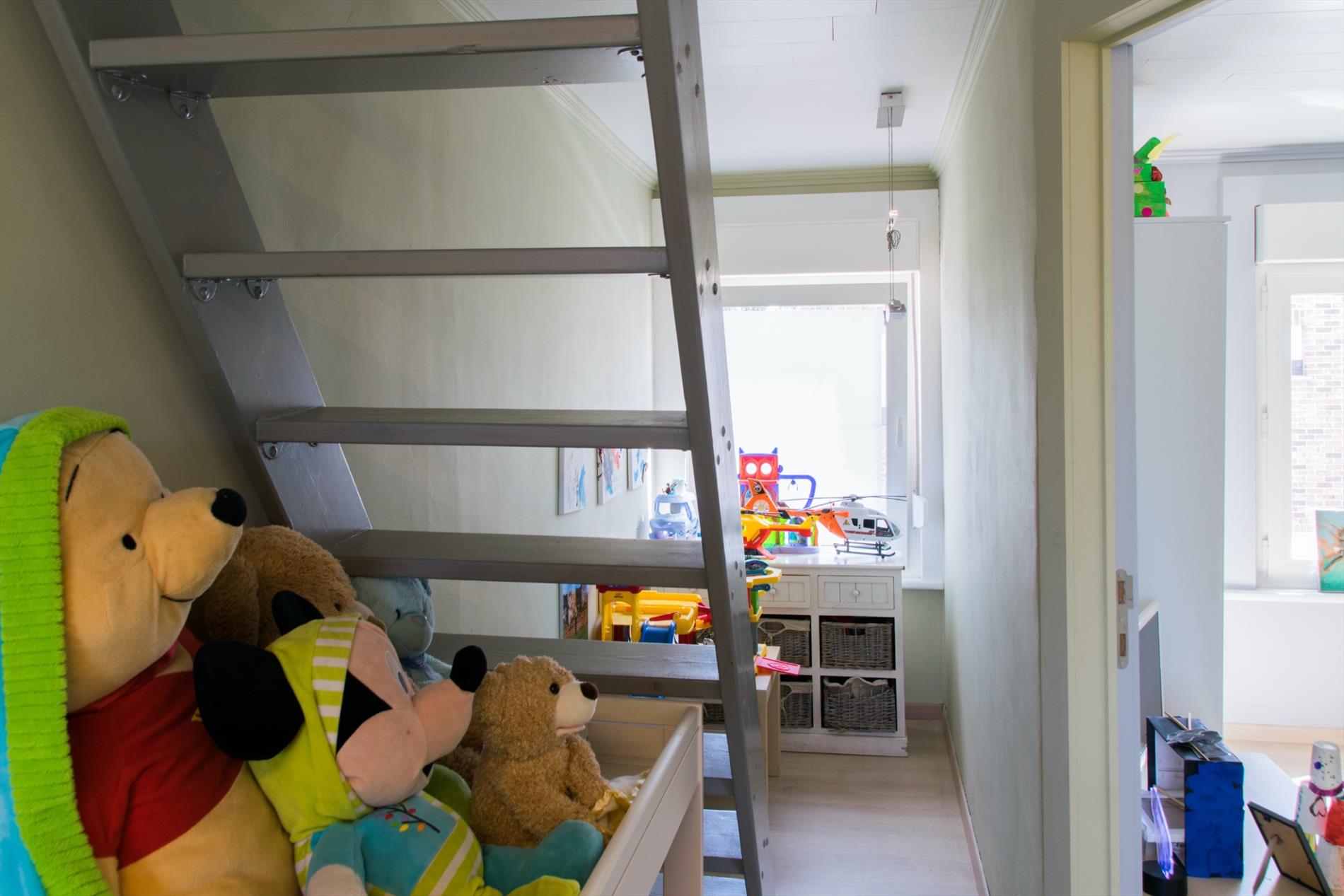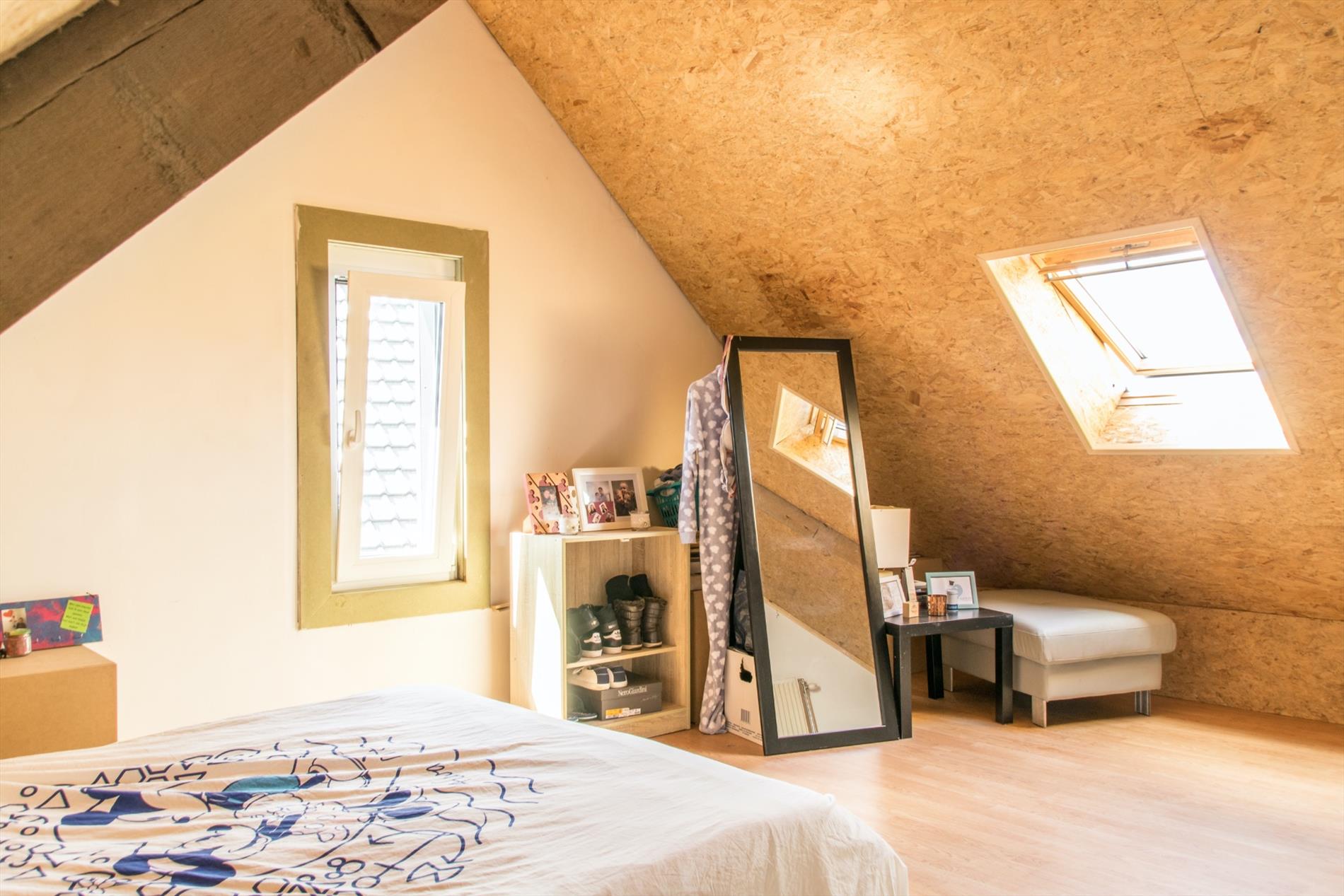 Via de mooie trap bereik je de eerste verdieping waar zich twee zeer ruime slaapkamers bevinden. Op de overloop op het eerste verdiep is er ook nog heel wat mogelijkheid tot creëren van extra opslagruimte. Op de tweede verdieping bevindt zich nog een zeer ruime derde slaapkamer, deze mist nog enkel de finale afwerking.