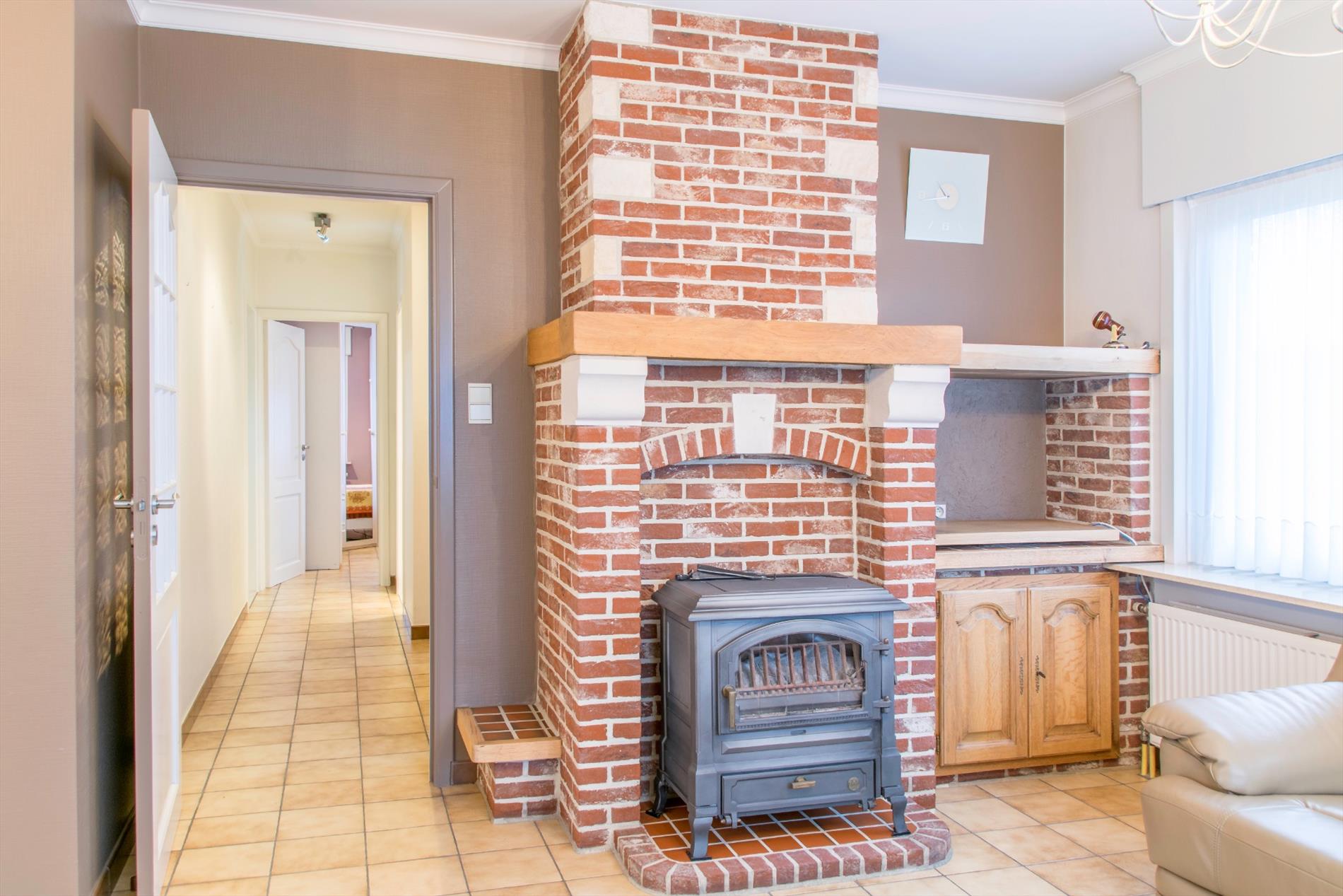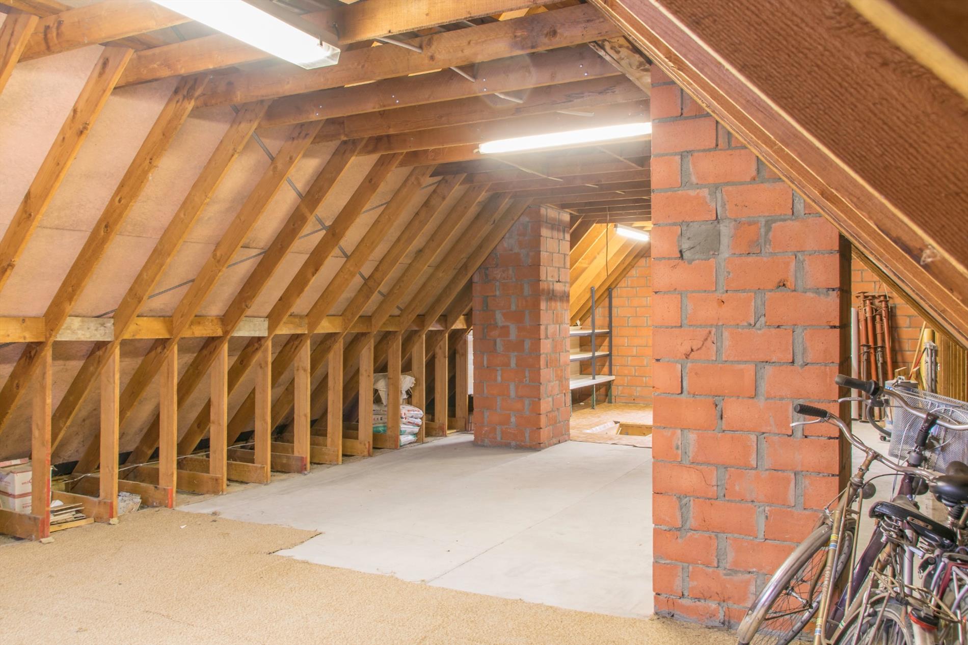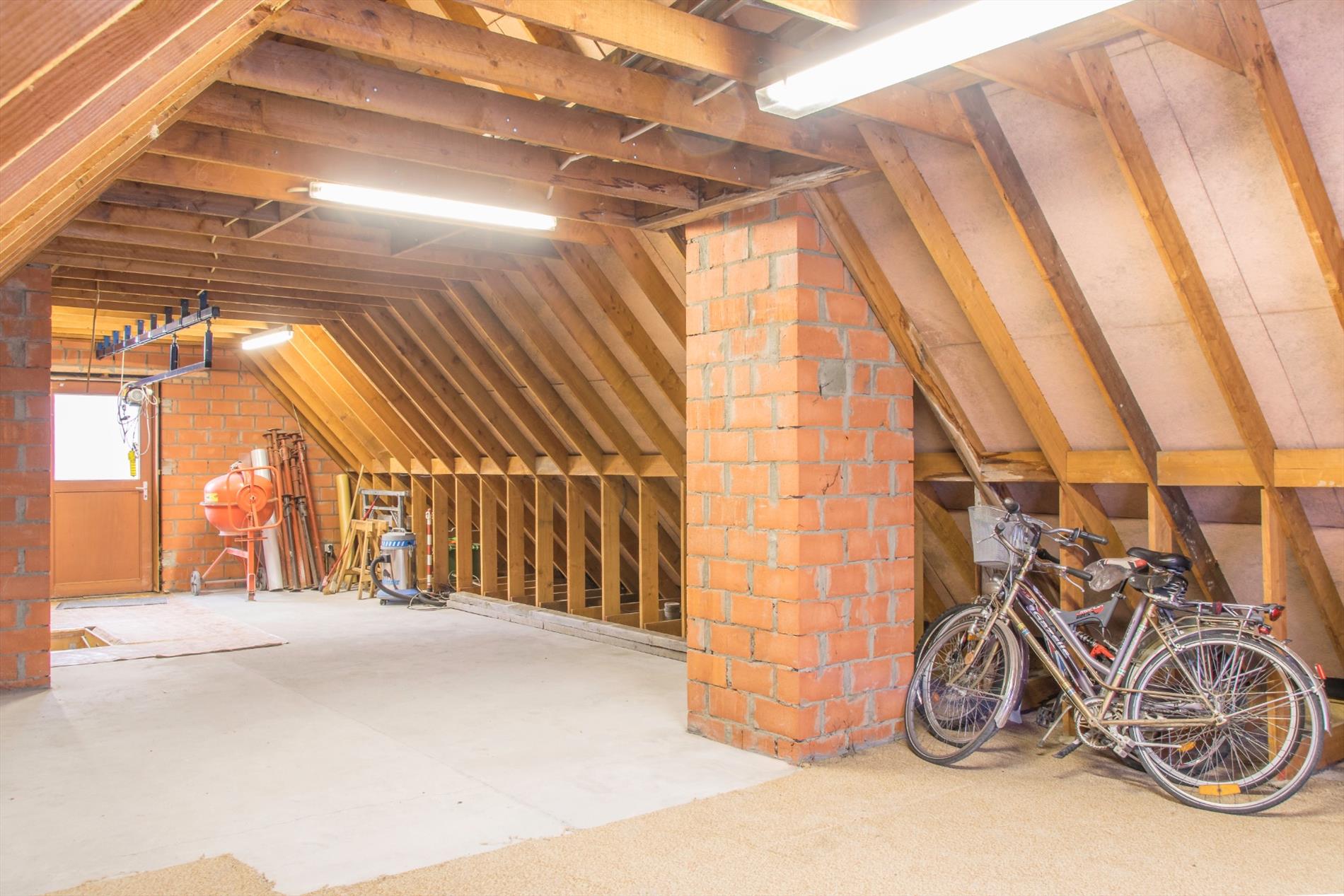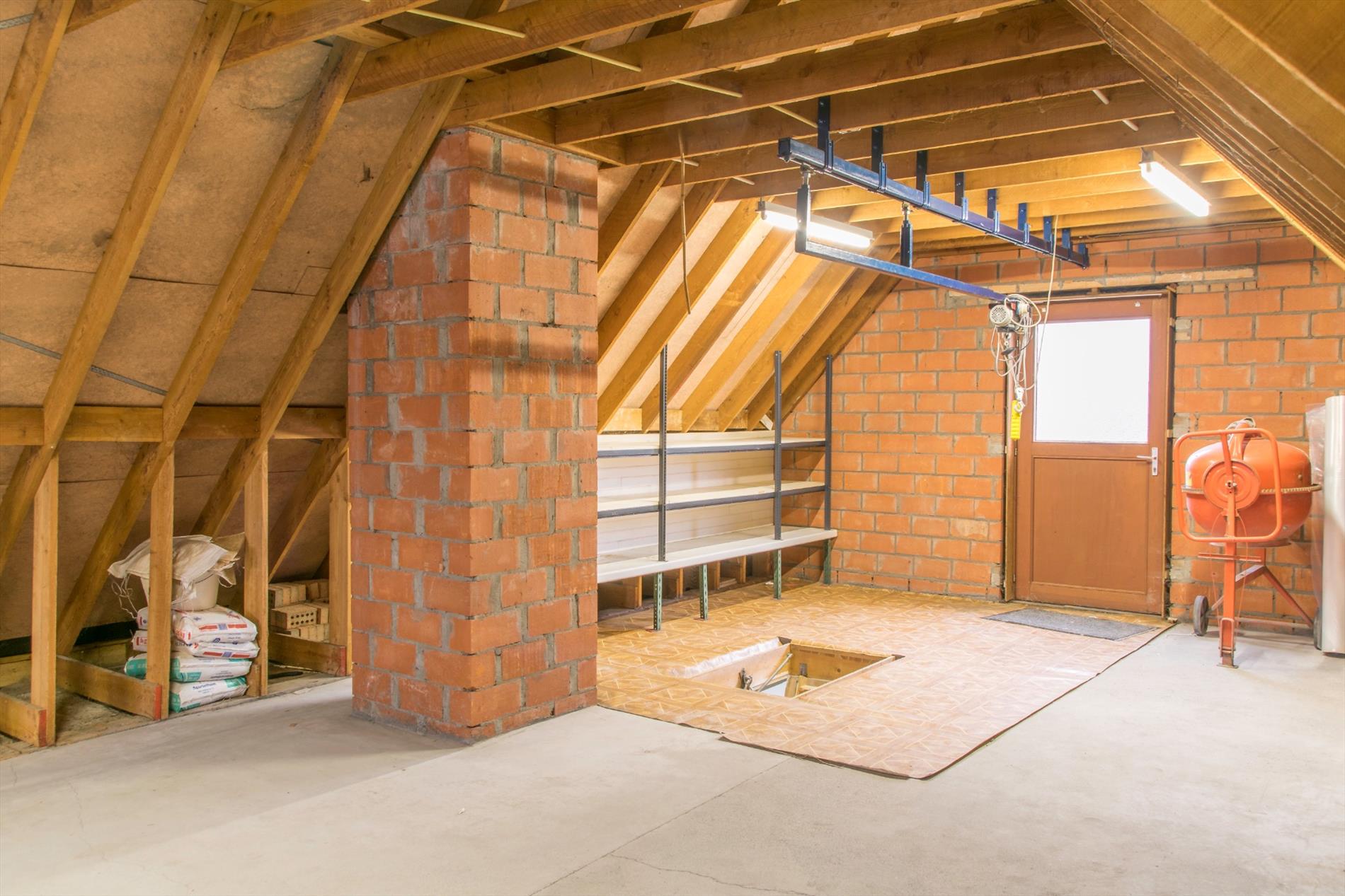 Deze woning is gelegen in een zeer rustige hoek van een verkaveling. Ze is bereikbaar langs de verkaveling zelf, maar ook langs een private weg aan de achterzijde (waar zich ook de twee garages en carport bevinden). Op het gelijkvloers heb je een ruime centrale inkomhal met aansluitend gastentoilet. Aan de ene kant kom je in de mooi, lichtrijke leefruimte terecht. De zithoek heeft een gezellige houtkachel, en via een groot schuifraam heb je toegang tot het zonovergoten terras. De praktische keuken heeft een aanpalende bergruimte, met eveneens toegang tot de tuin. Aan de andere kant van de inkomhal heb je toegang tot de badkamer en de enige slaapkamer. De grootste troef van dit huis bevindt zich echter in de garage : van daaruit heb je toegang tot de massief grote zolderruimte die nog verder kan ingericht worden , met een beetje verbeelding is hier ruimte voor allerlei extra vertrekken. De betonnen gewelven bieden alvast een stevige basis voor uw grootse plannen.